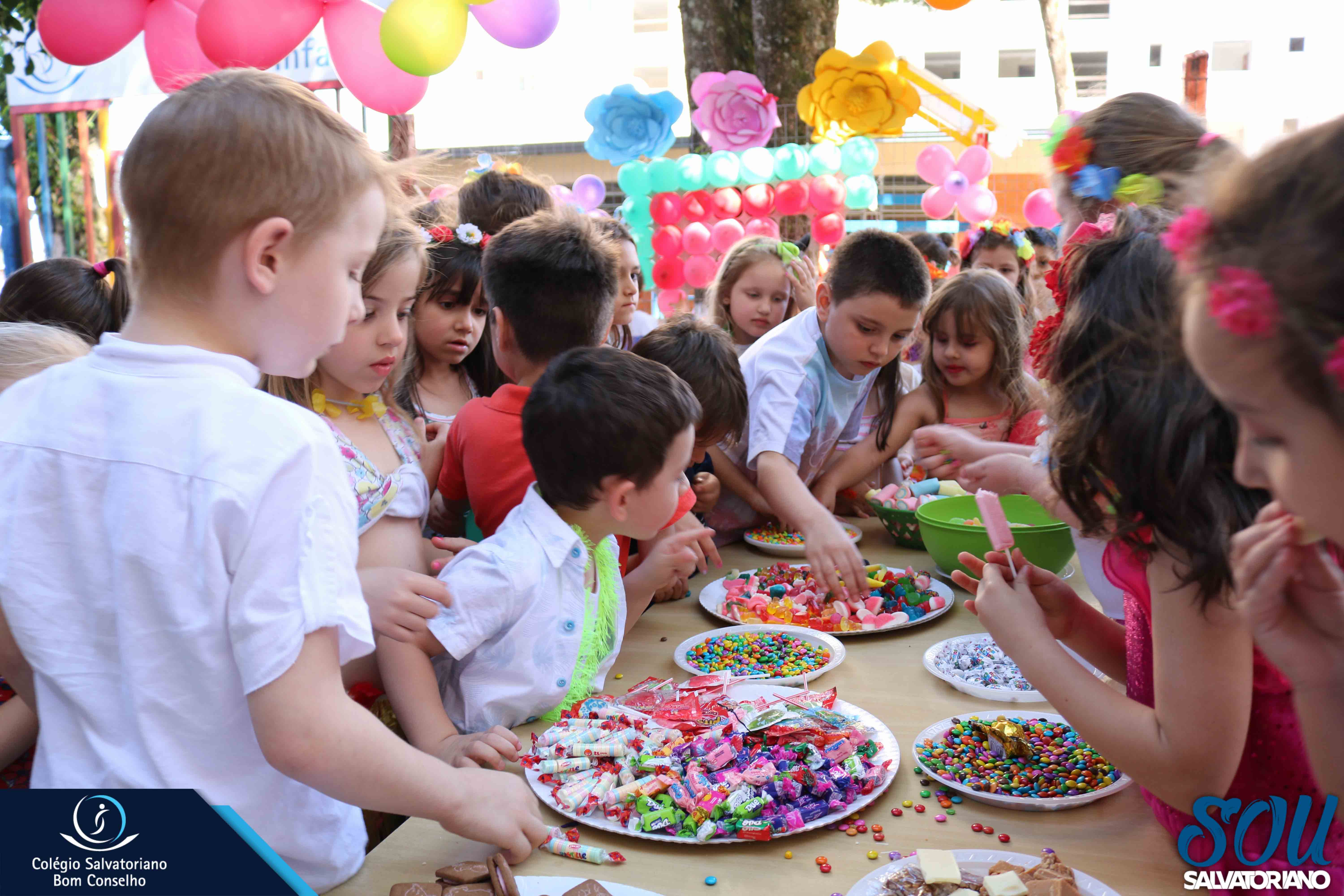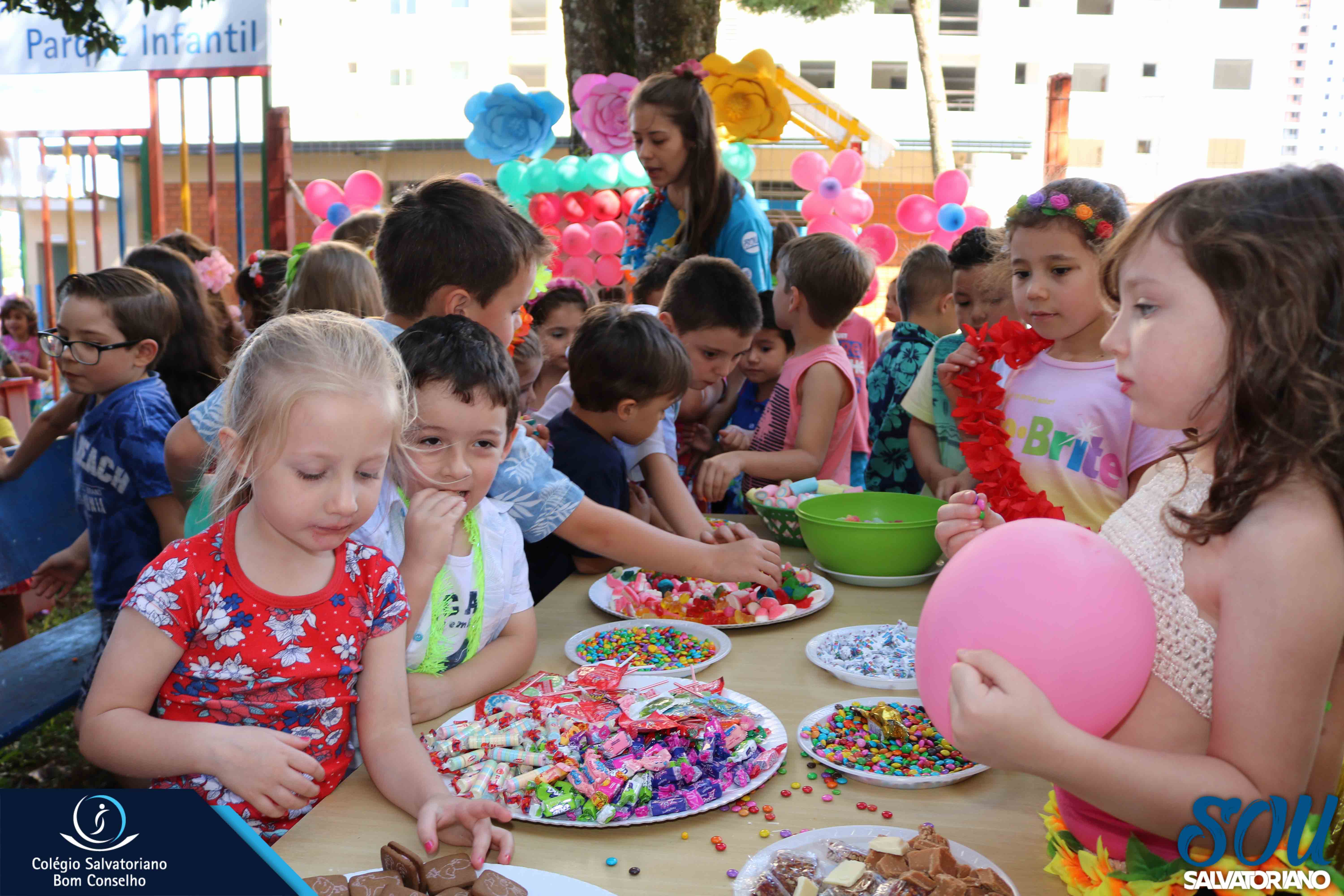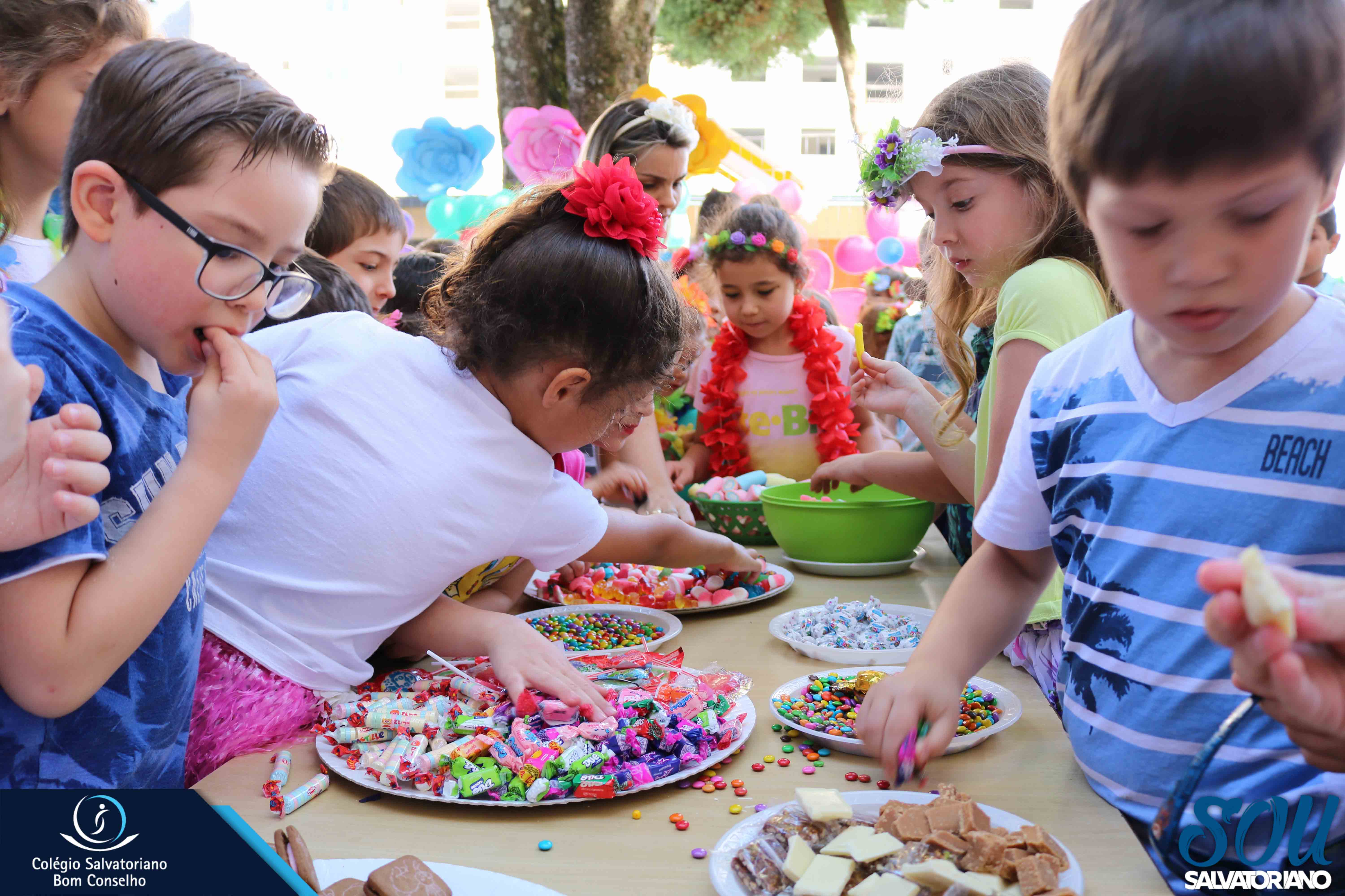 As crianças estavam alegres, vestidas com roupas coloridas, floridas, compartilhando sorrisos e abraços. O clima quente e a decoração colorida deixaram a tarde maravilhosa.