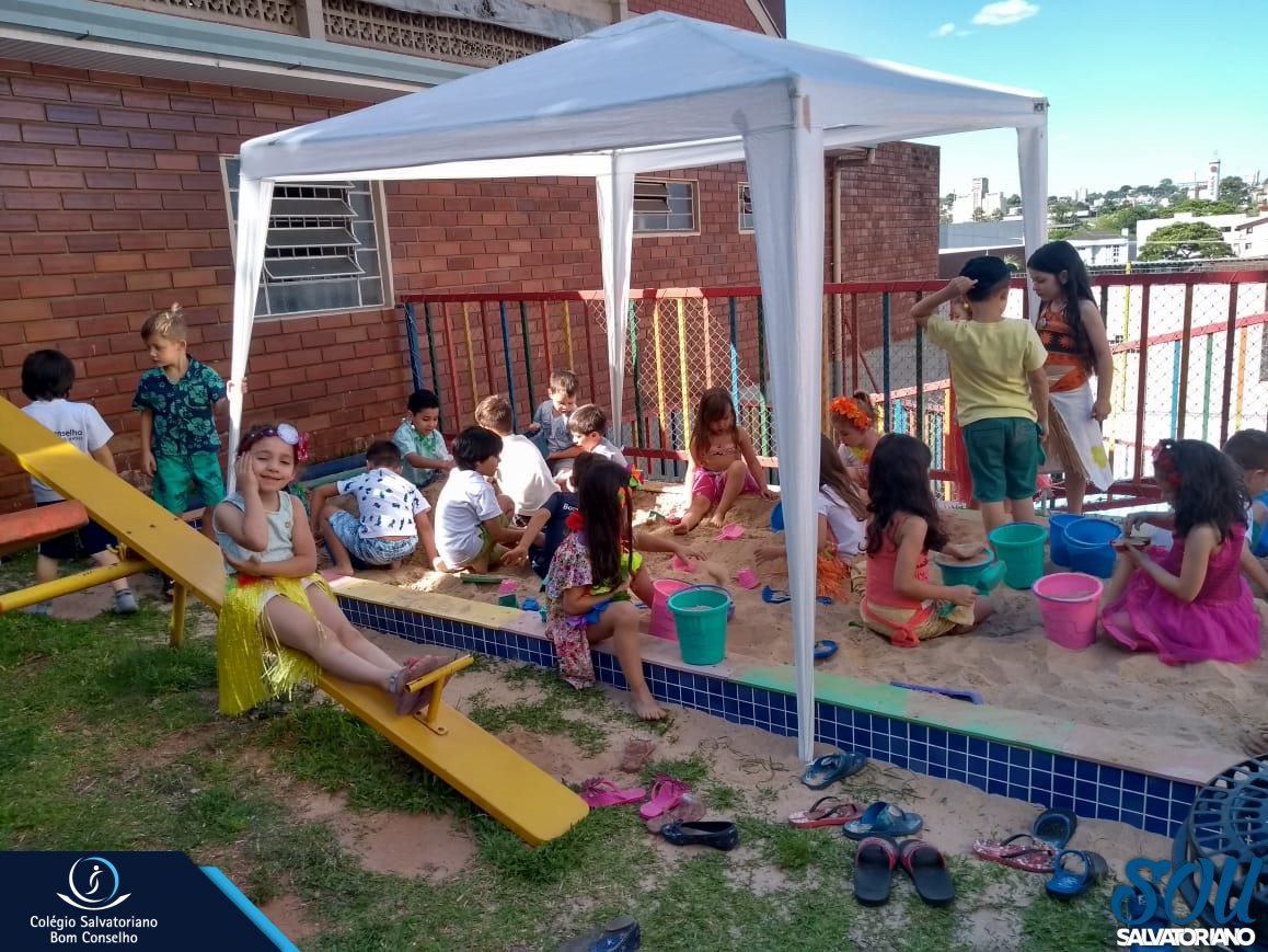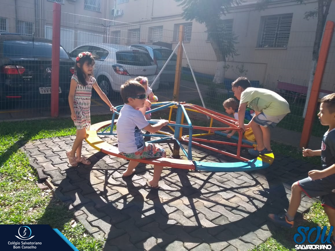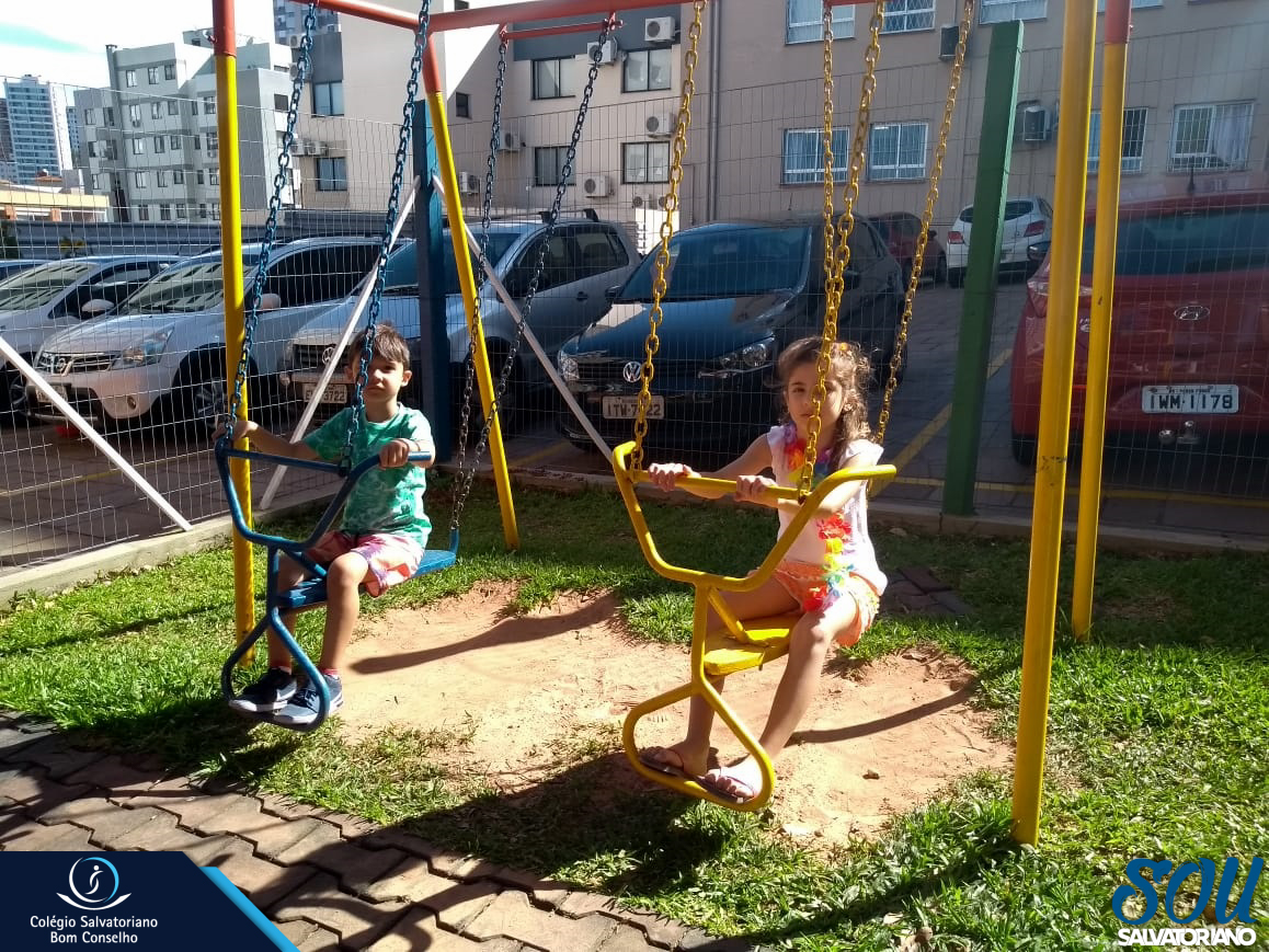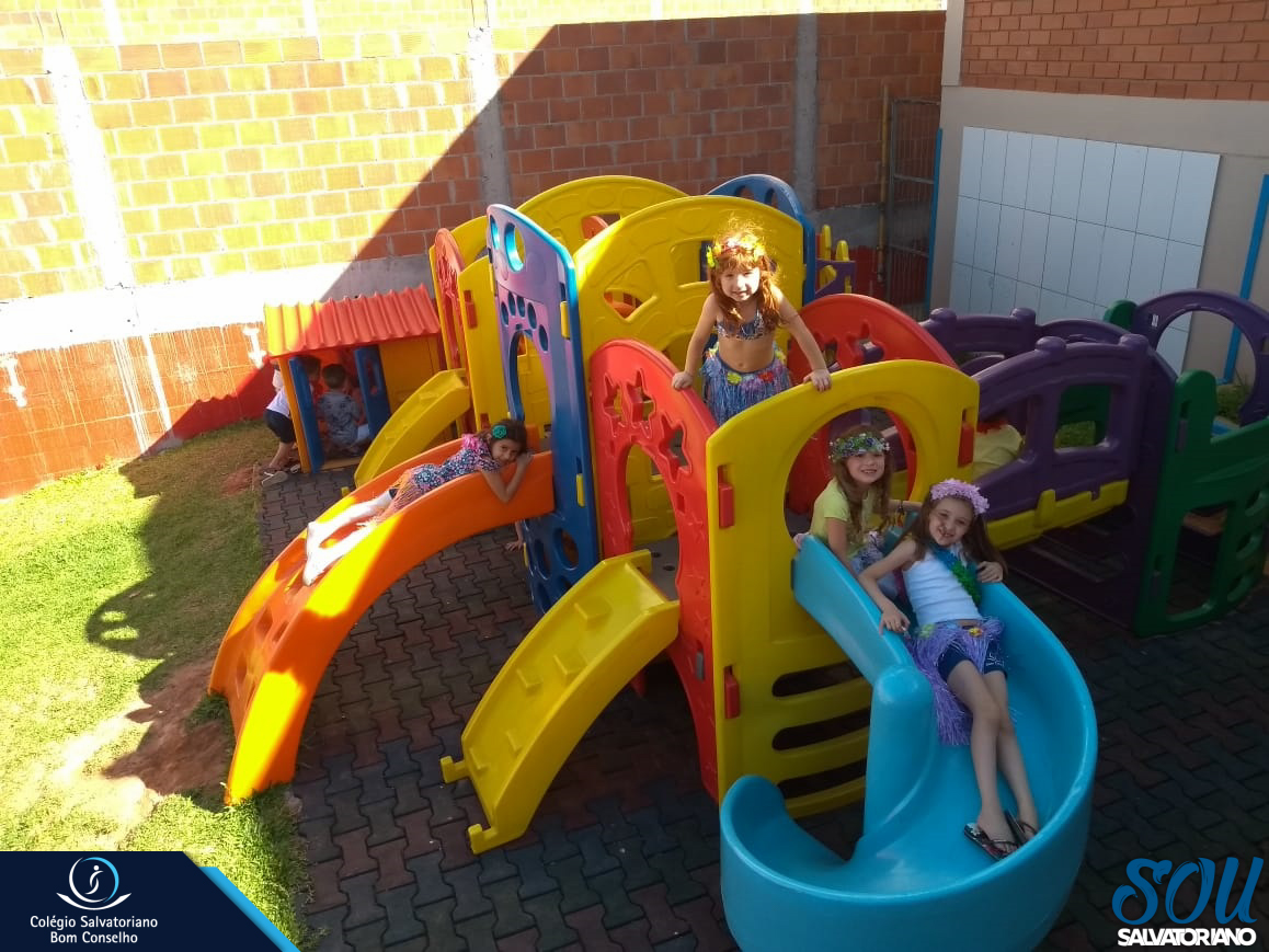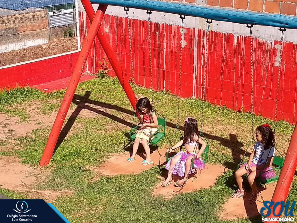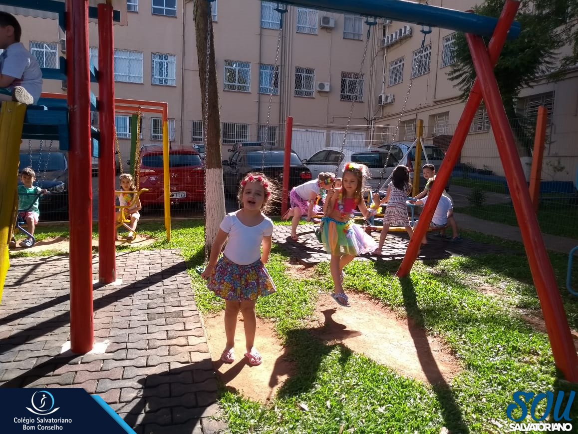 Depois de dançar e brincar com os colegas, dividir o encantamento pelas roupas e fantasias, dar muita risada, comer frutas e doces, os estudantes foram brincar no parquinho da escola.
