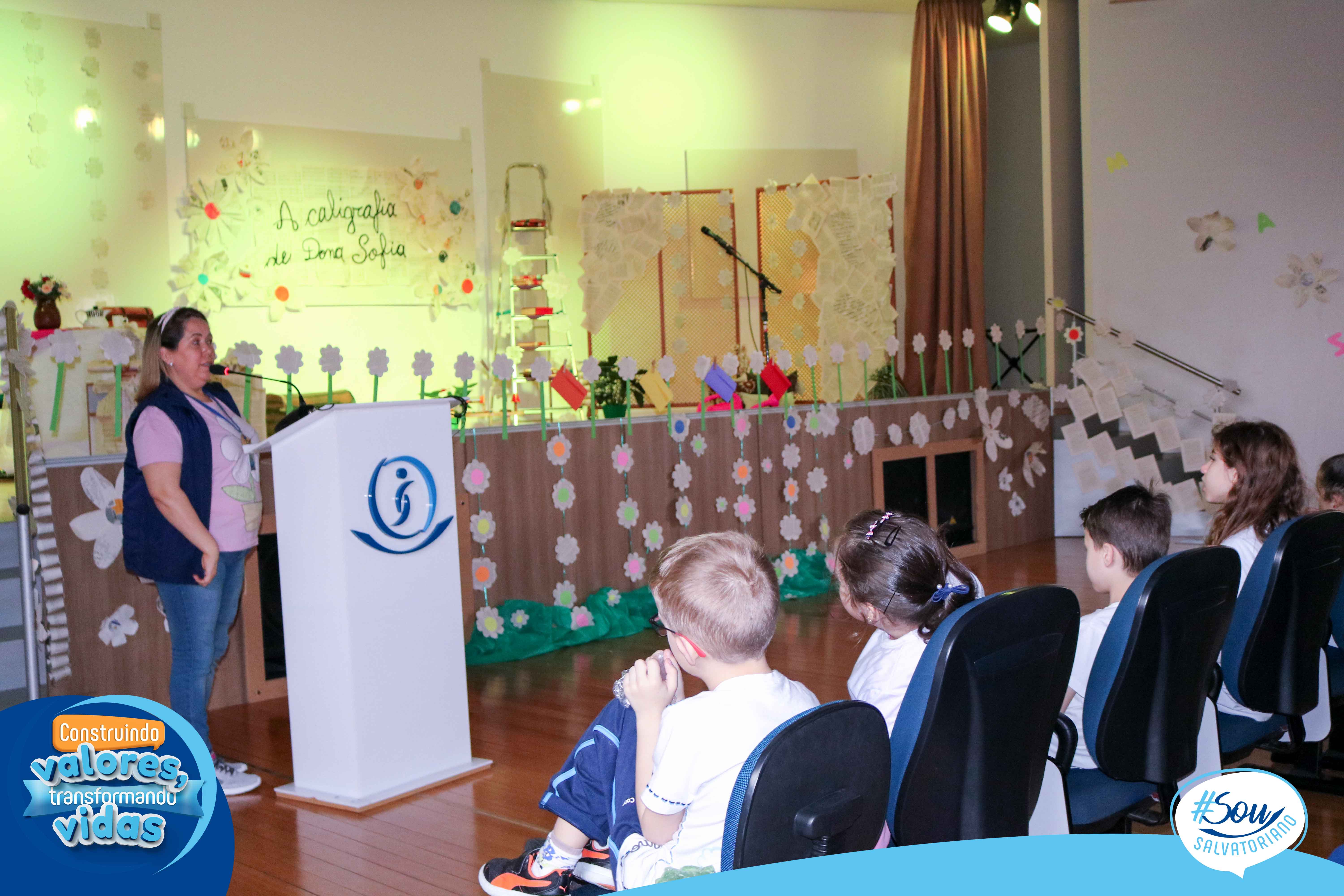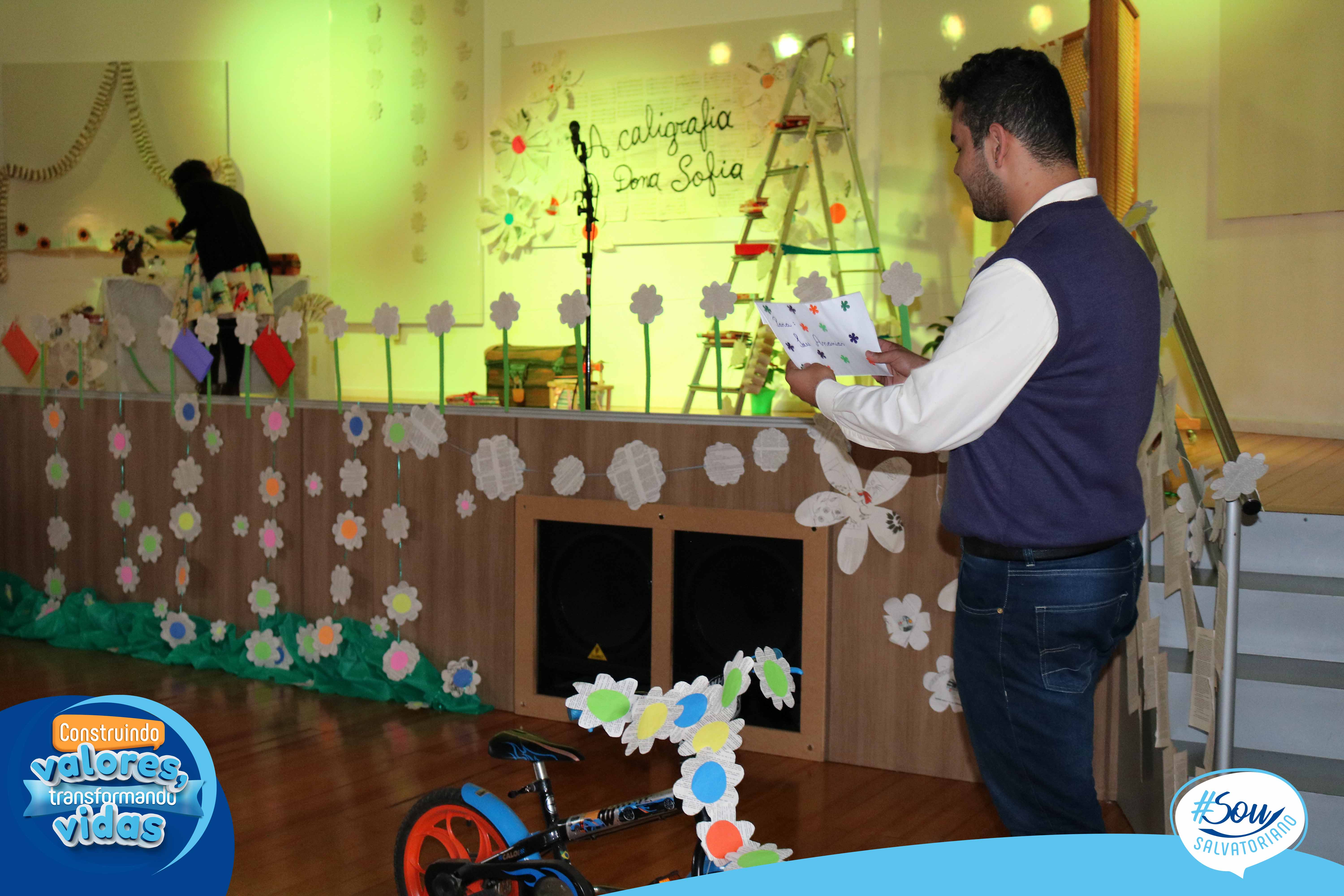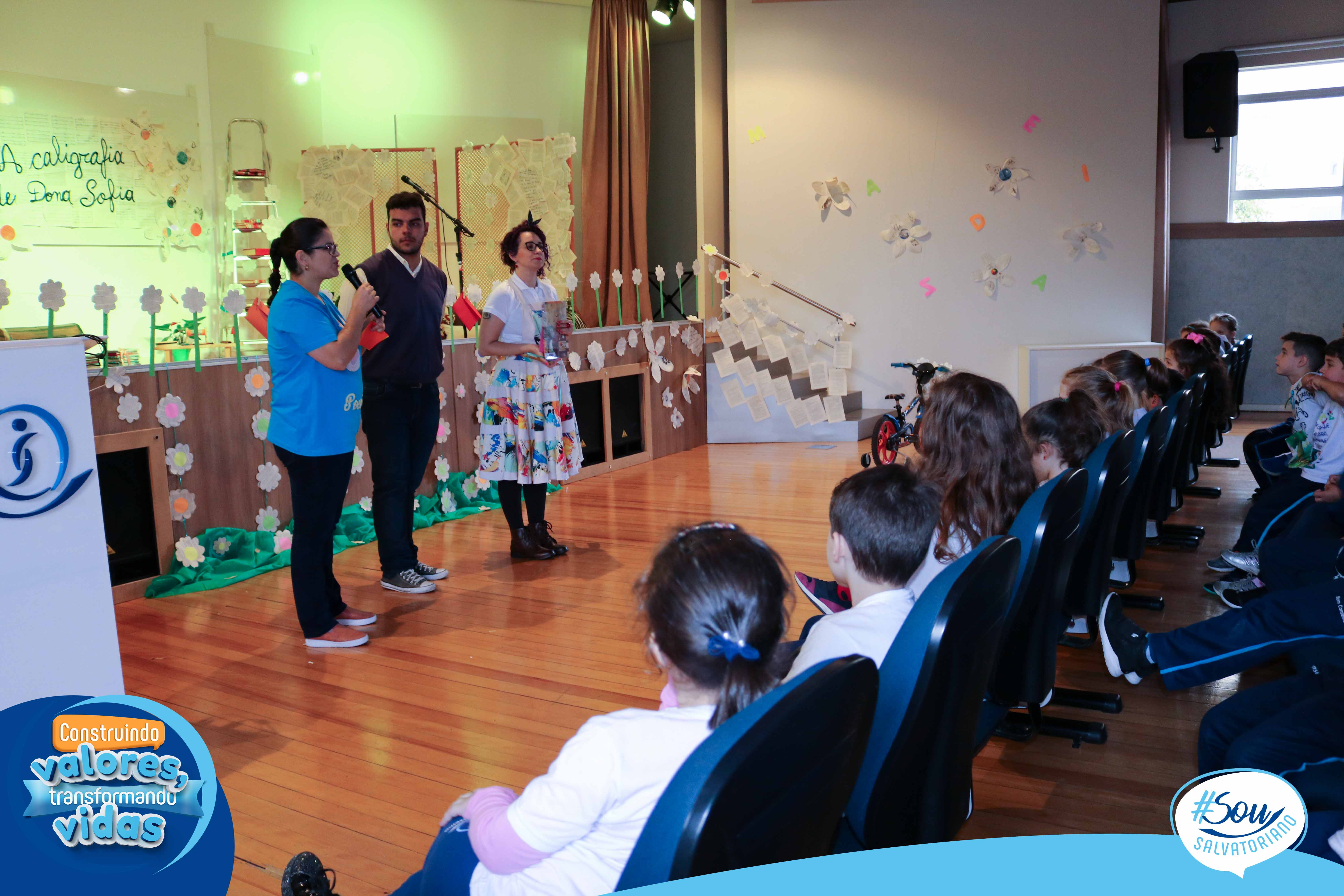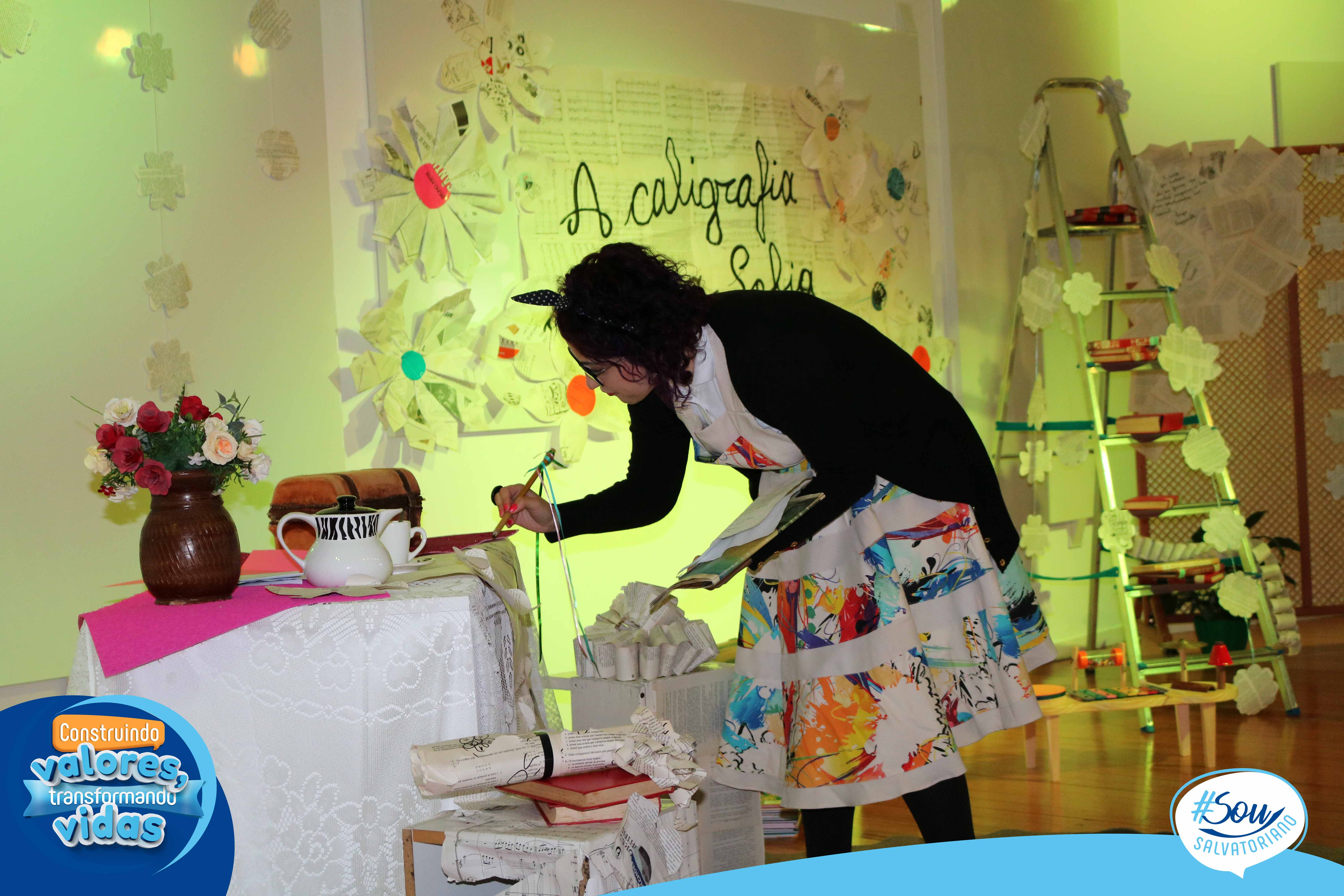 A professora, contadora de histórias e escritora, Cris Morais, realizou a dramatização da história com a participação dos colegas Luciane e Bruno. O roteiro para a dramatização da história foi realizado a partir do livro do autor André Neves: “A caligrafia de Dona Sofia”.