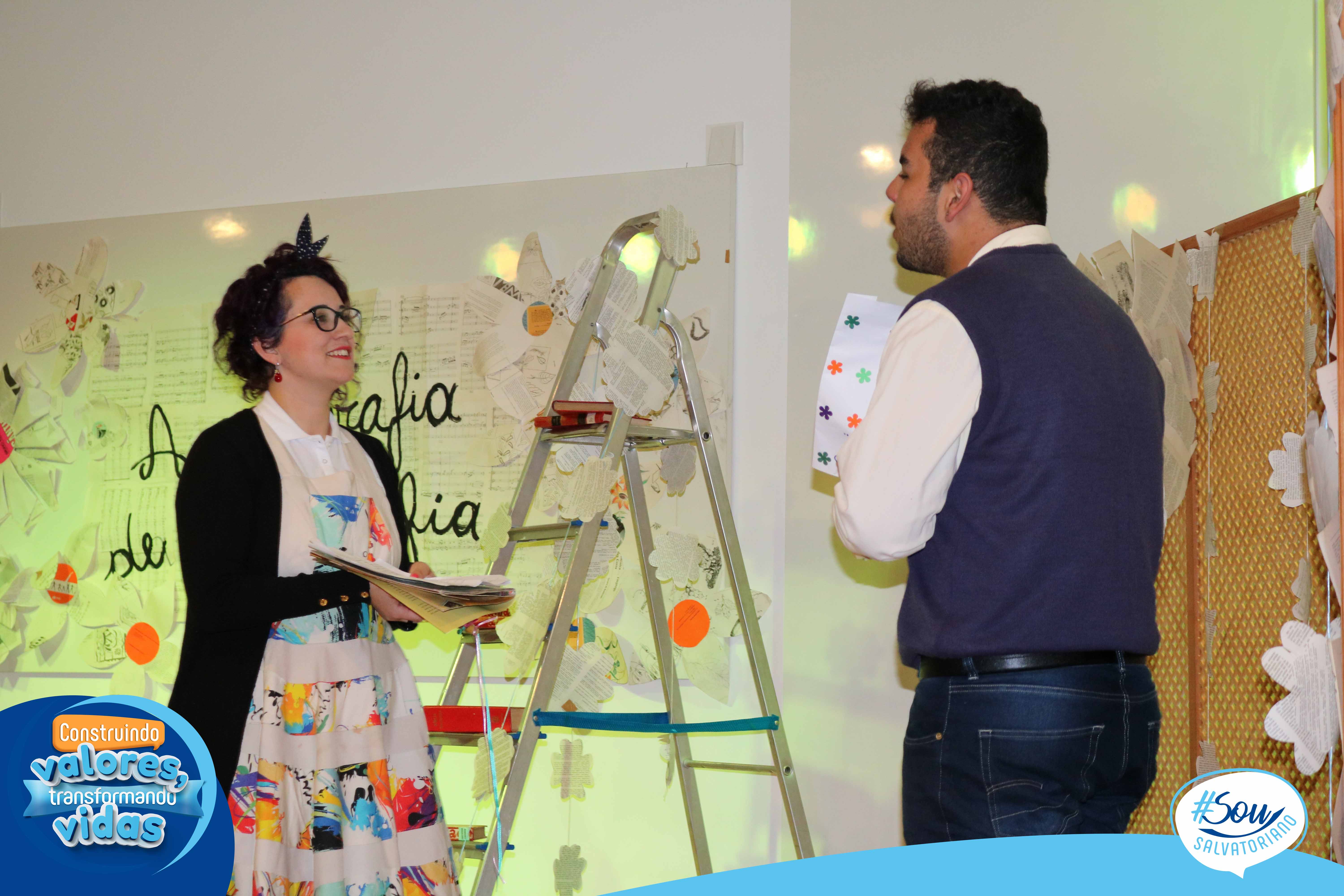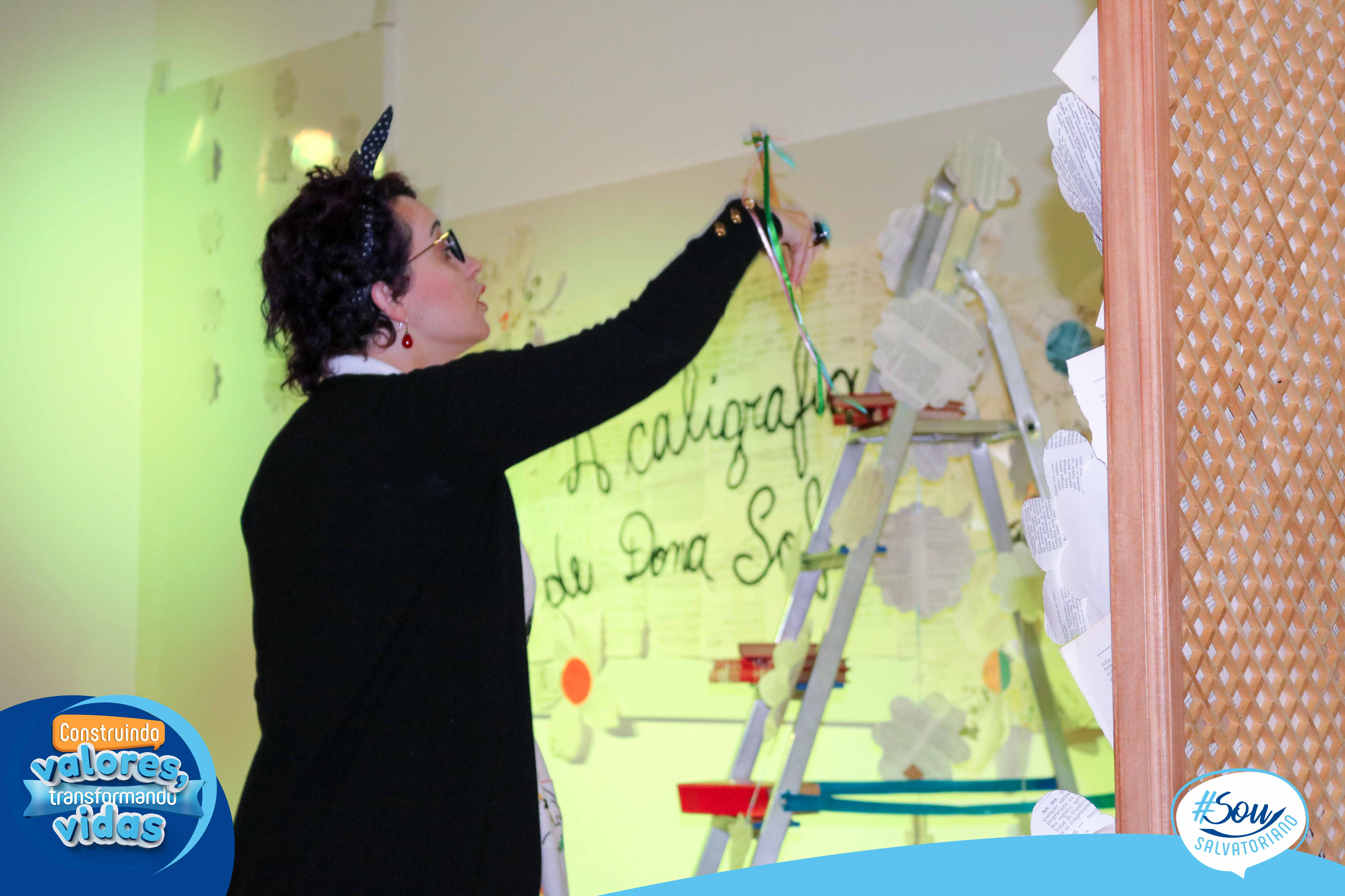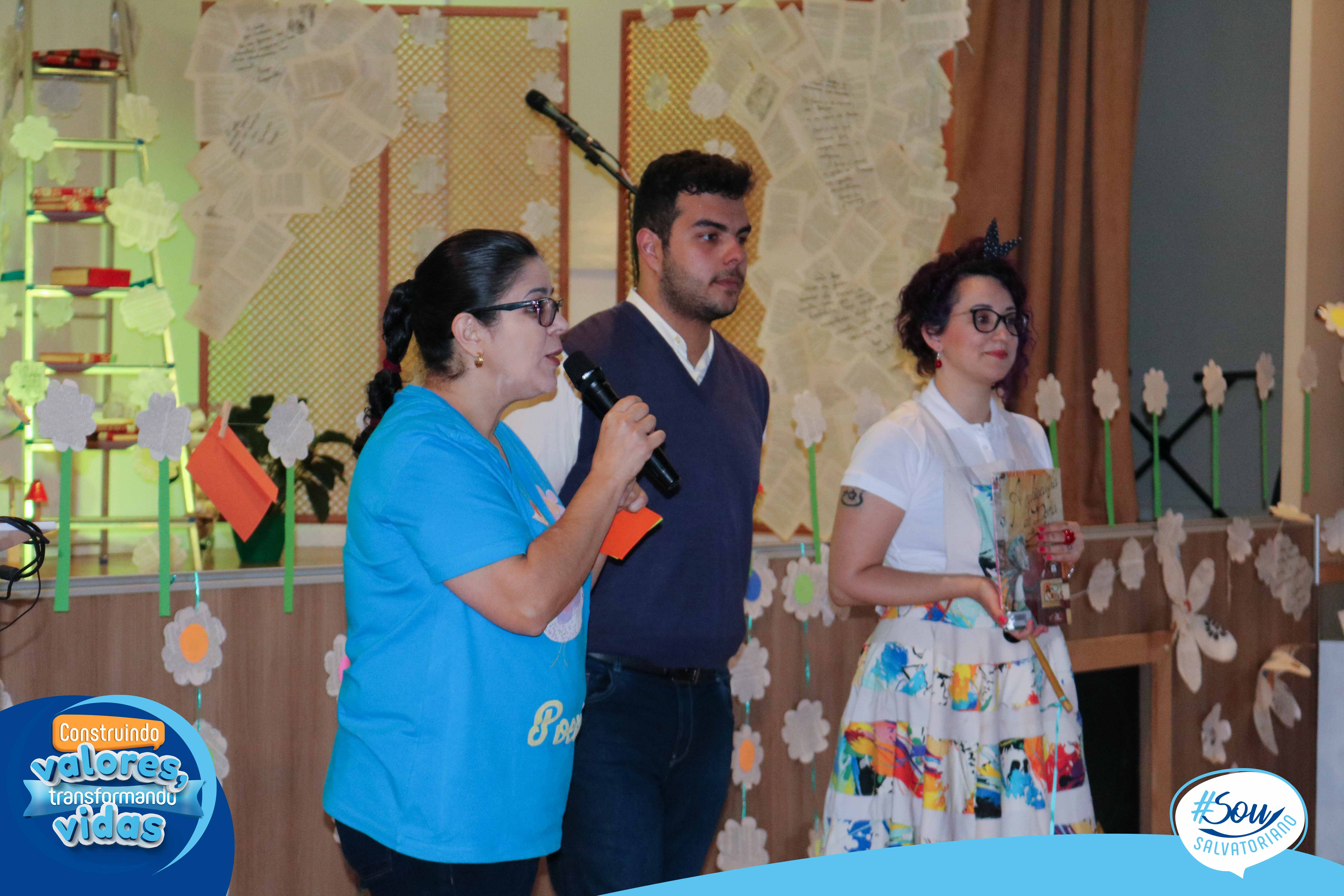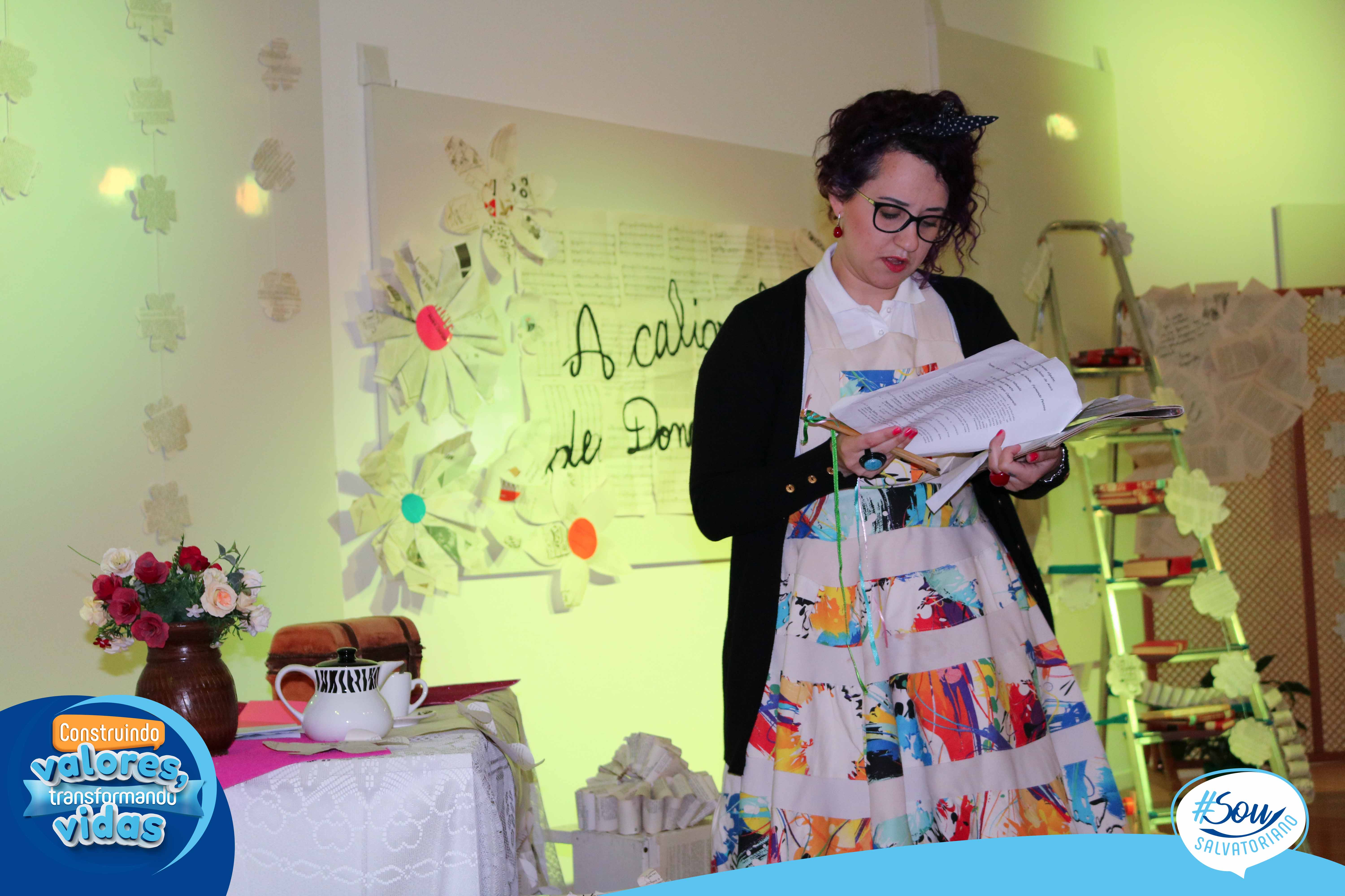 A professora, contadora de histórias e escritora, Cris Morais, realizou a dramatização da história com a participação dos colegas Luciane e Bruno. O roteiro para a dramatização da história foi realizado a partir do livro do autor André Neves: “A caligrafia de Dona Sofia”.