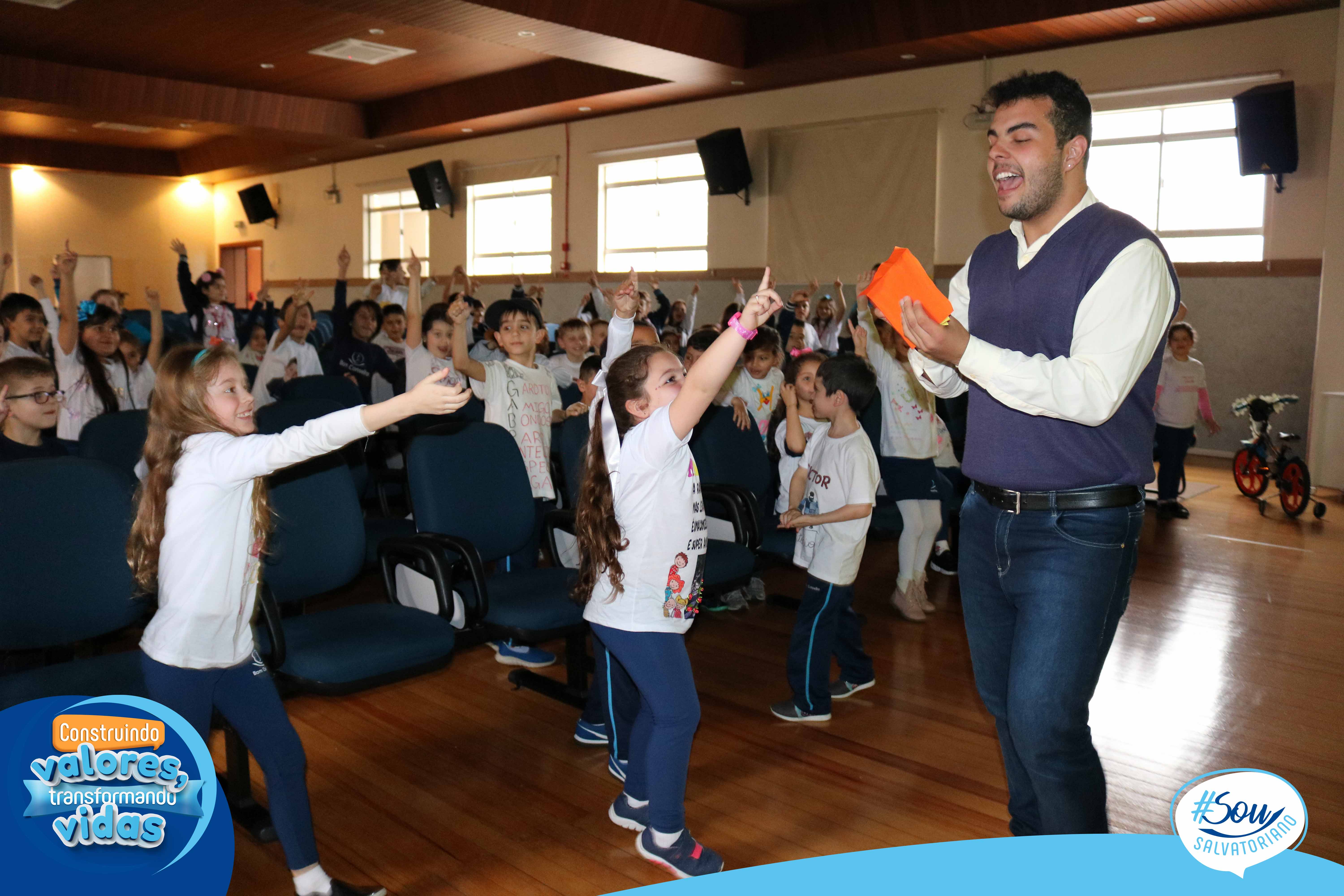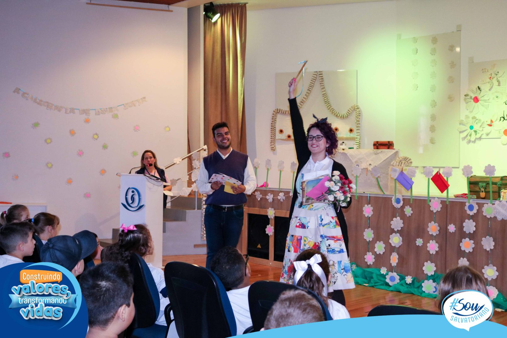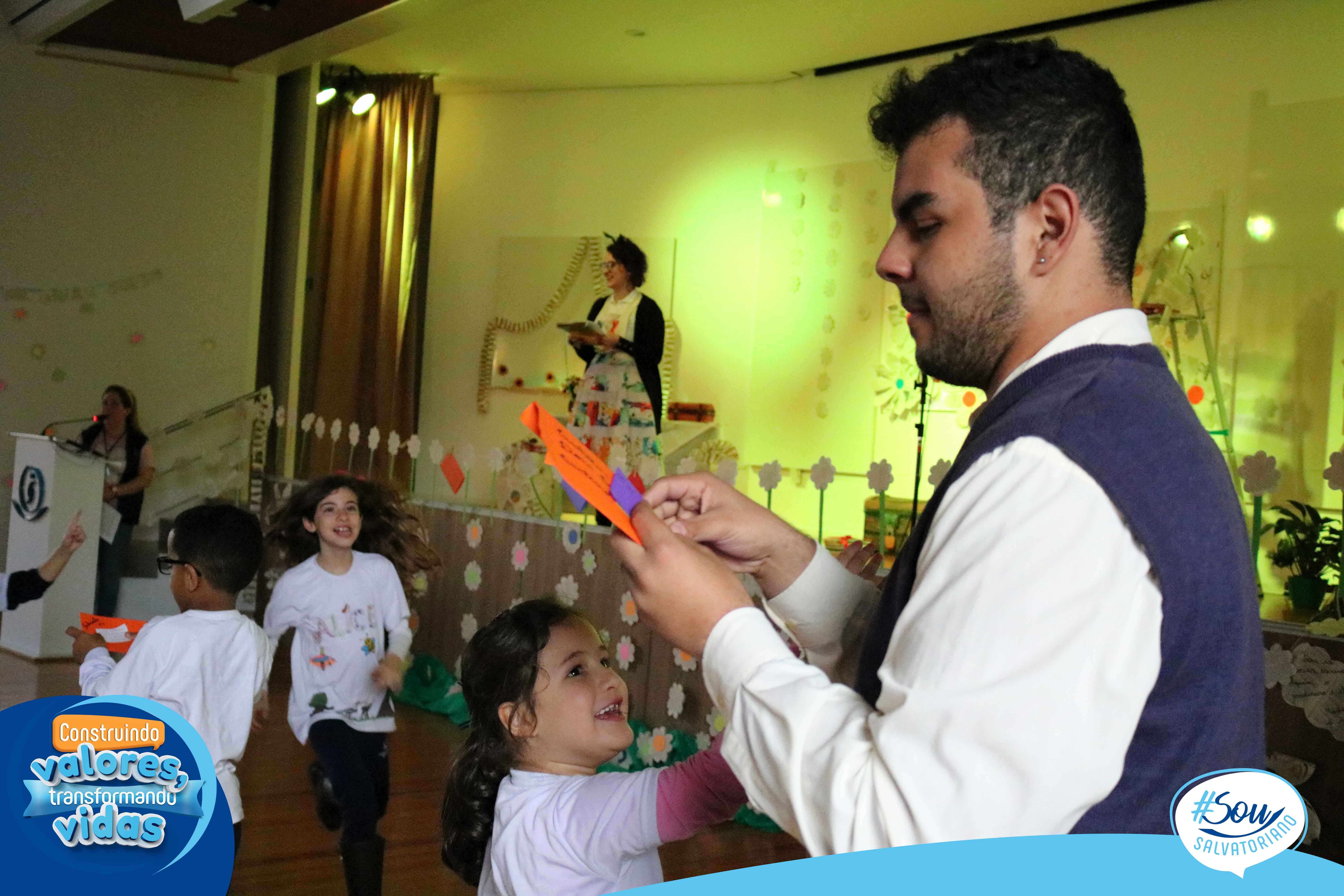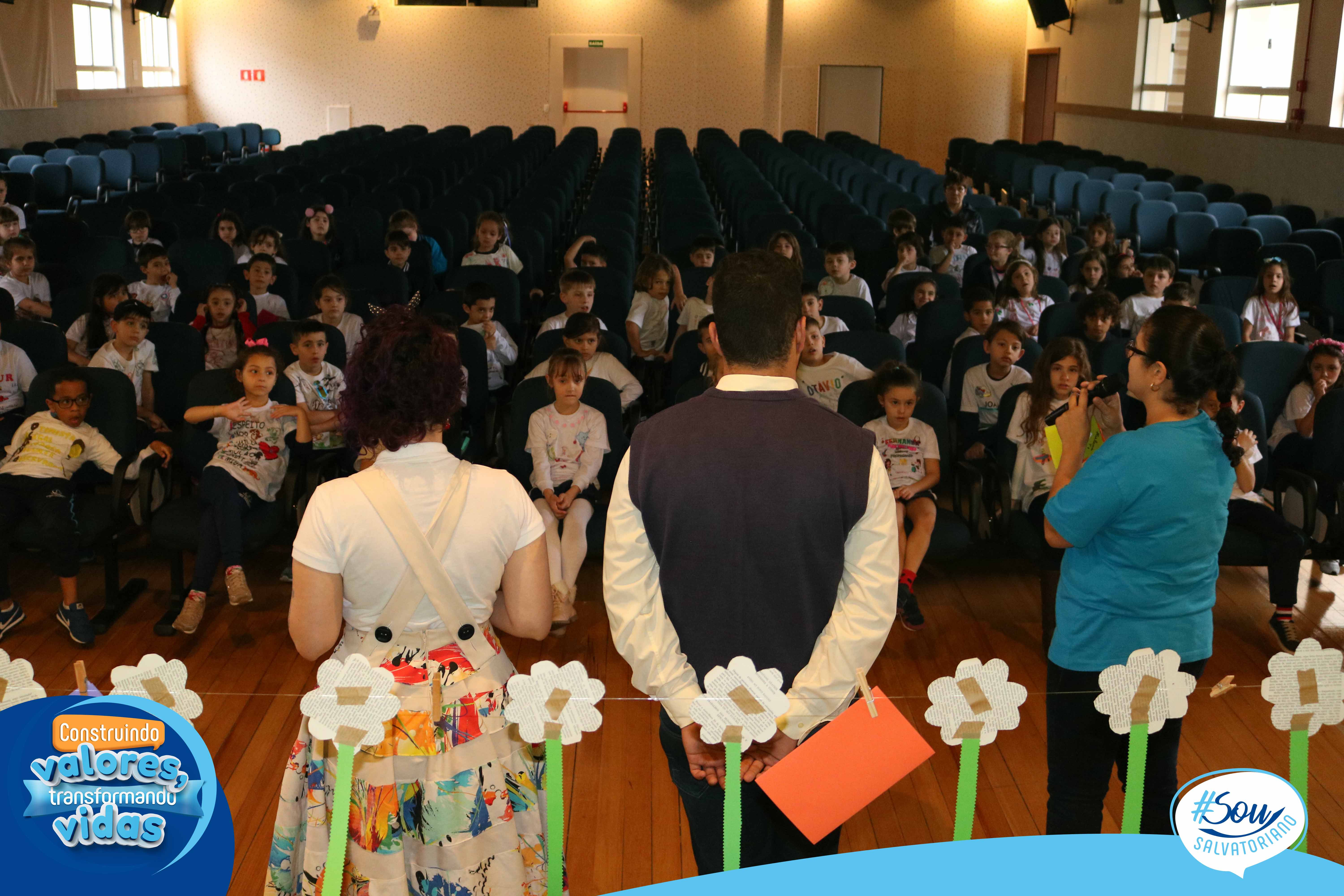 A professora, contadora de histórias e escritora, Cris Morais, realizou a dramatização da história com a participação dos colegas Luciane e Bruno. O roteiro para a dramatização da história foi realizado a partir do livro do autor André Neves: “A caligrafia de Dona Sofia”.