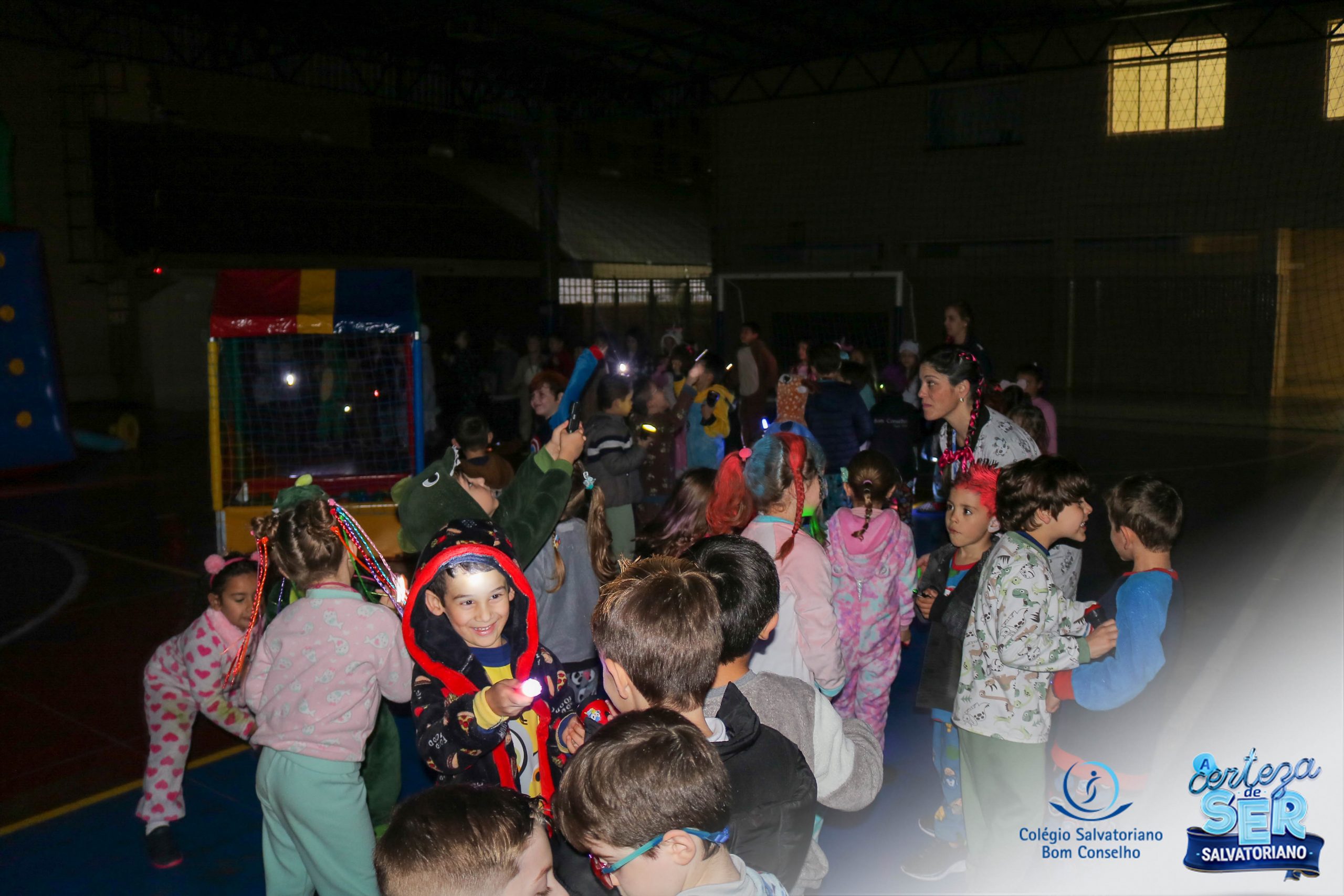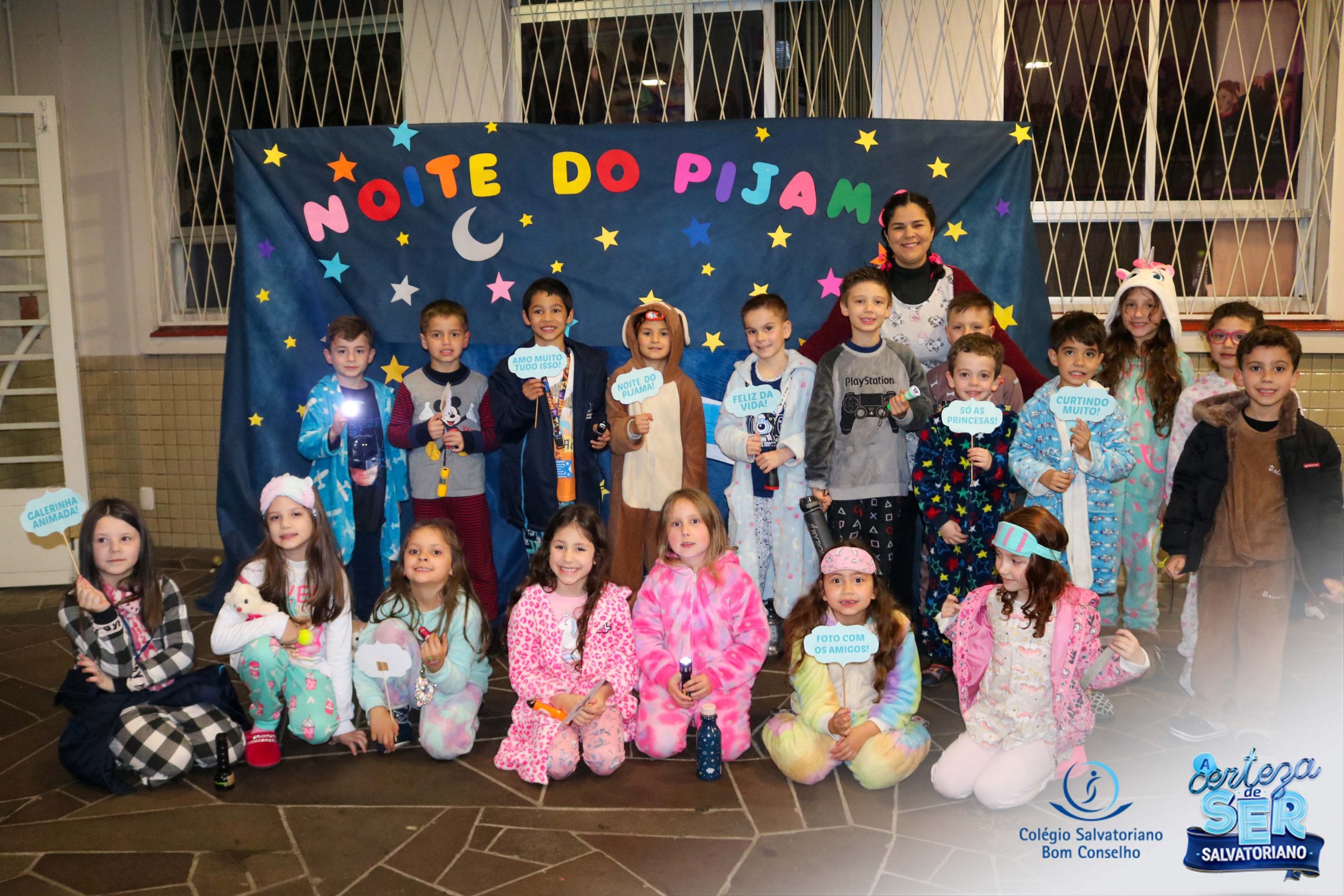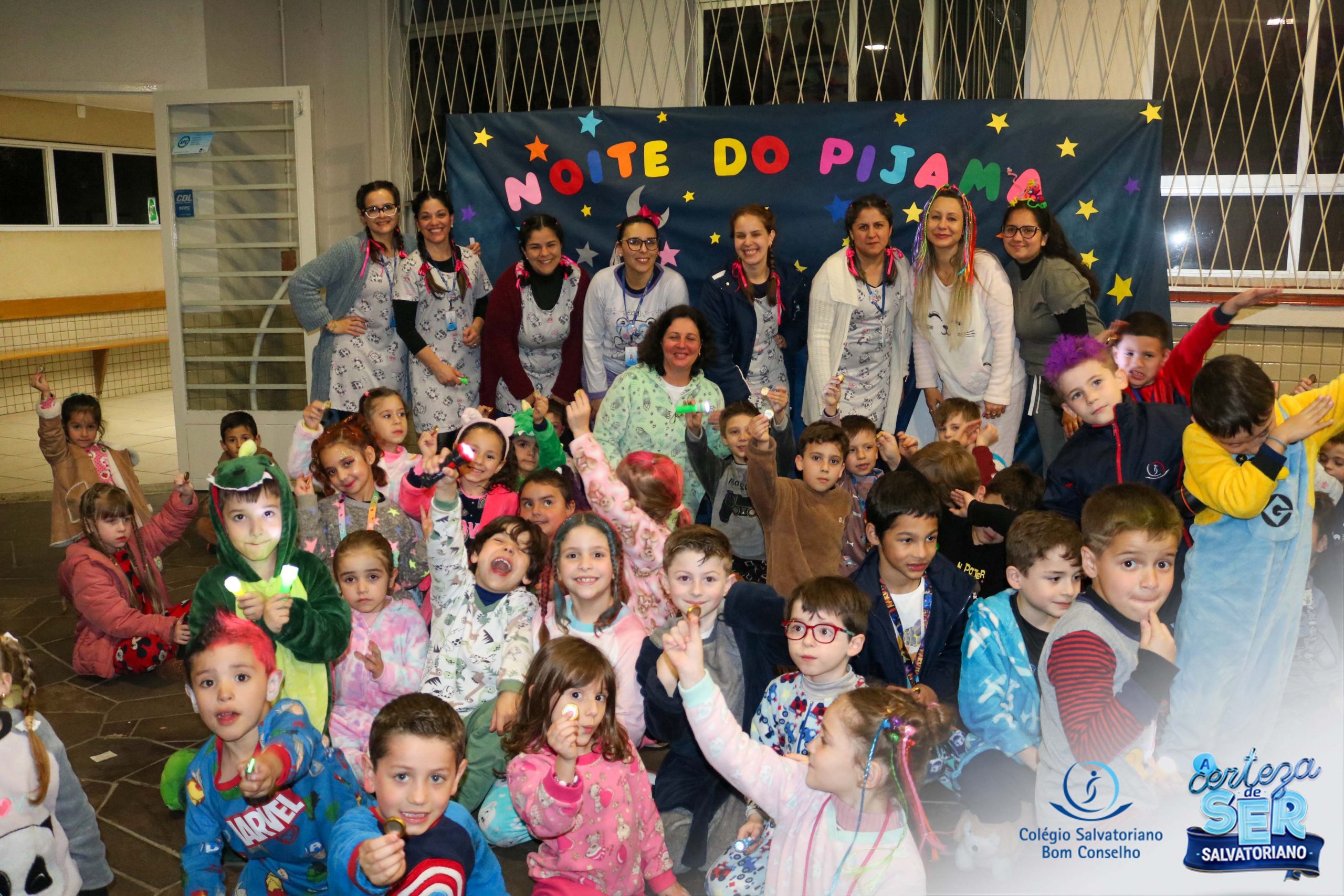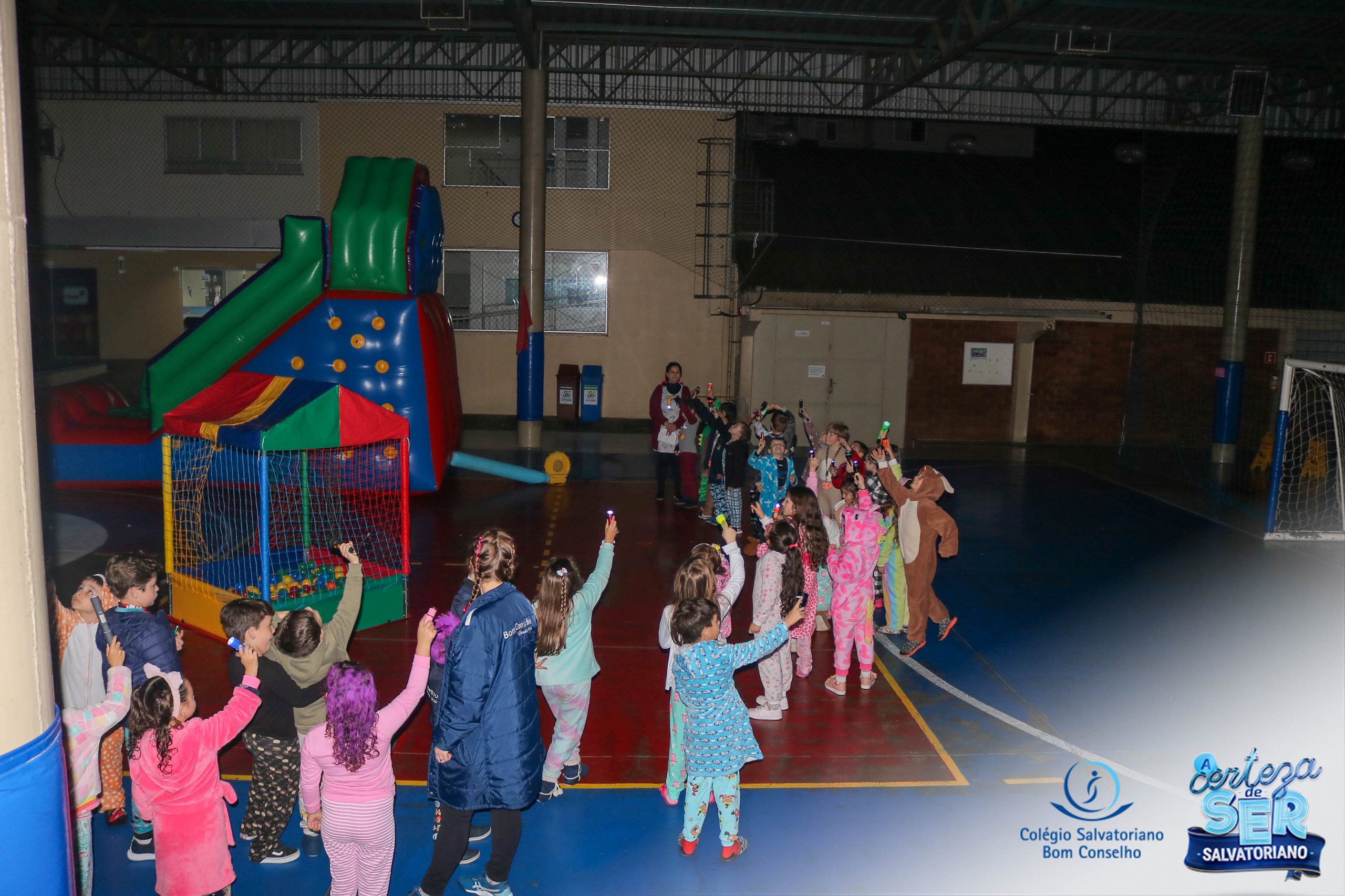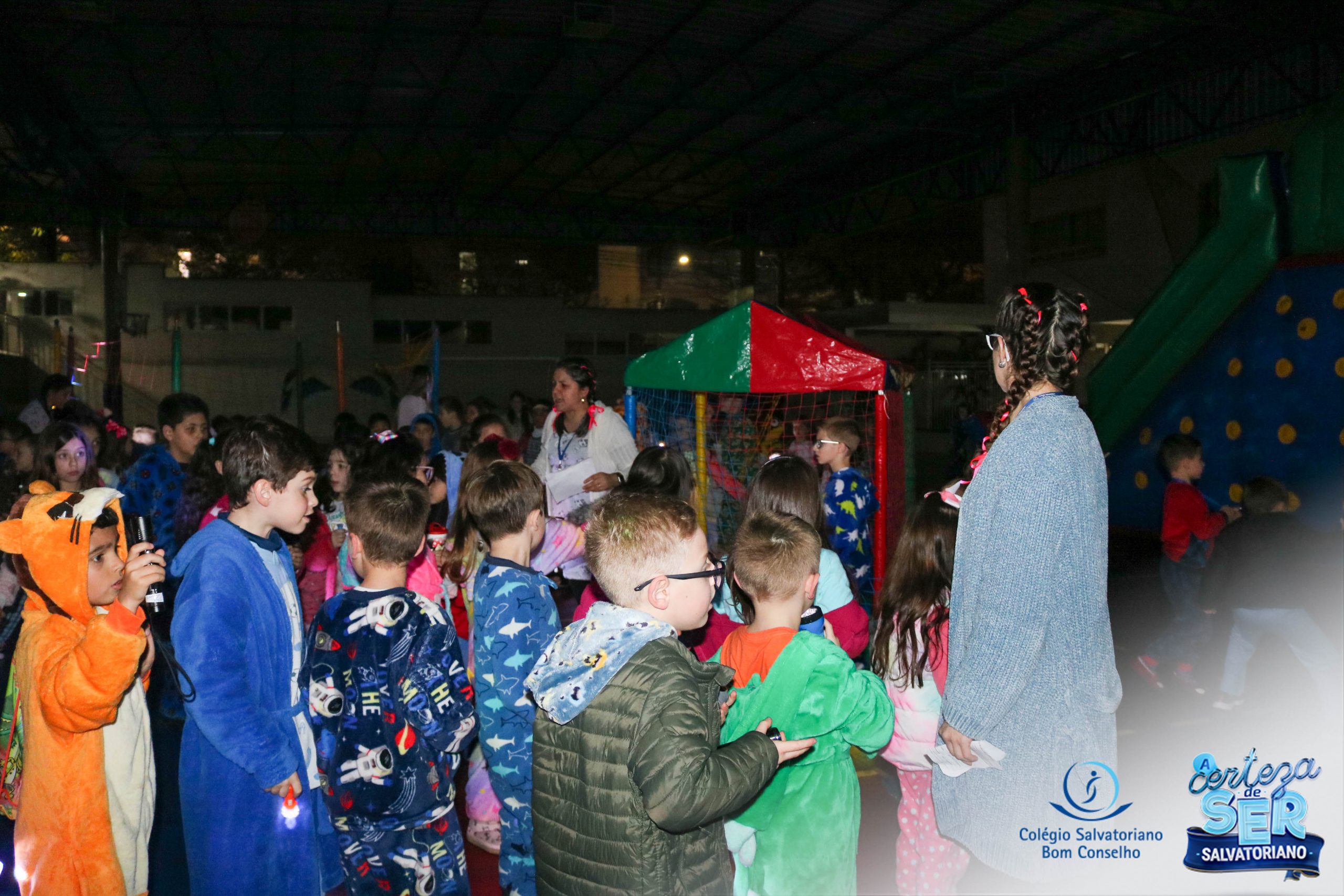 A Noite do Pijama 2022, aconteceu no colégio na última terça-feira, 11/10 das 19h às 21 horas e foi repleta de atividades super legais. Na chegada os estudantes foram acolhidos pelas professoras para o momento das fotos. Estudantes e professores vestiram-se com seus pijamas coloridos e animados. A primeira atividade foi uma caça ao tesouro. Seguindo as pistas as turmas desvendaram os enigmas com suas lanternas que iluminavam os espaços da escola. Após, os estudantes organizados em grupos participaram da Zumba Kids e brincaram nos brinquedos infláveis na quadra da escola. Para encerrar, todos participaram do jantar na escola!