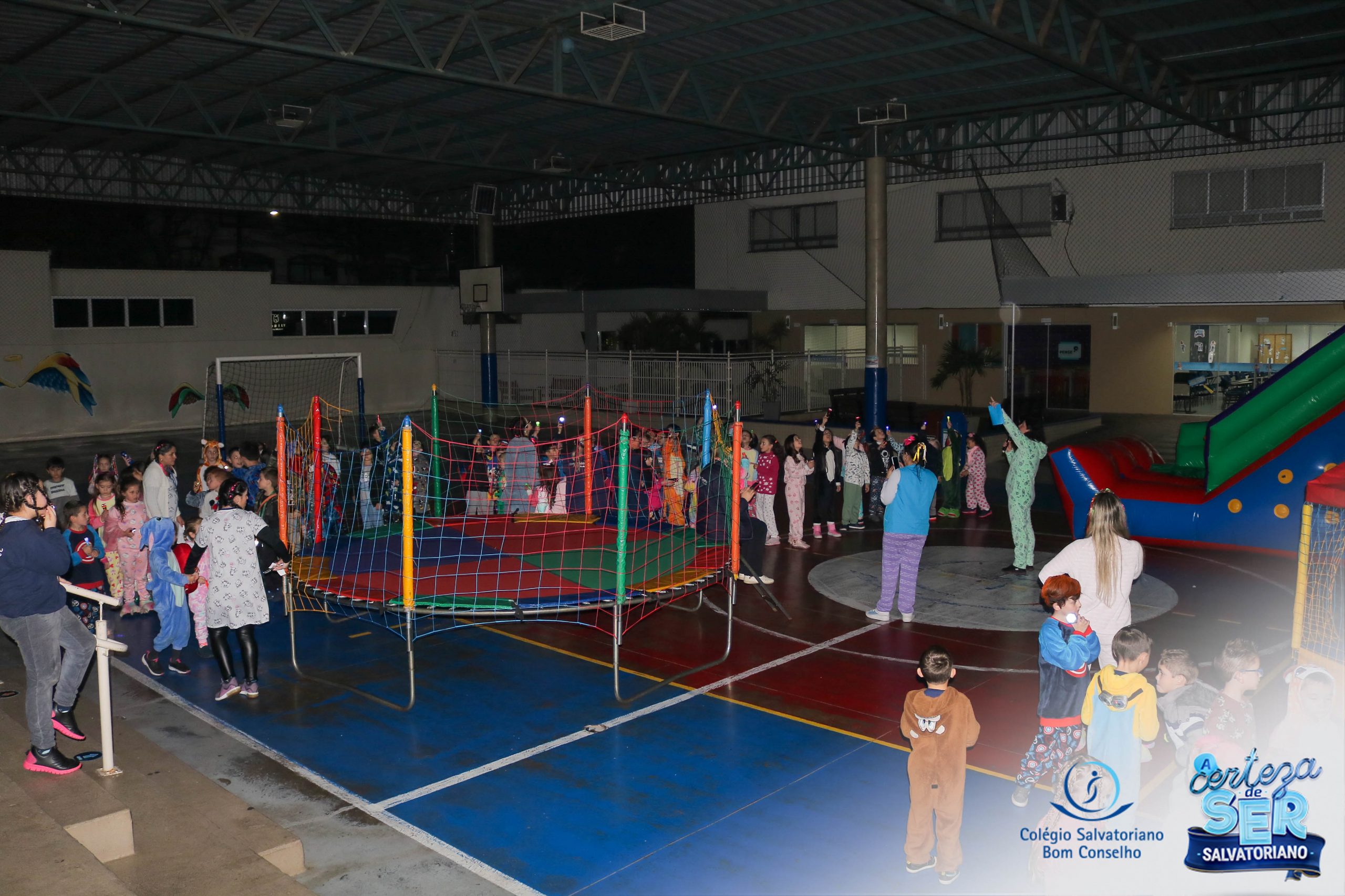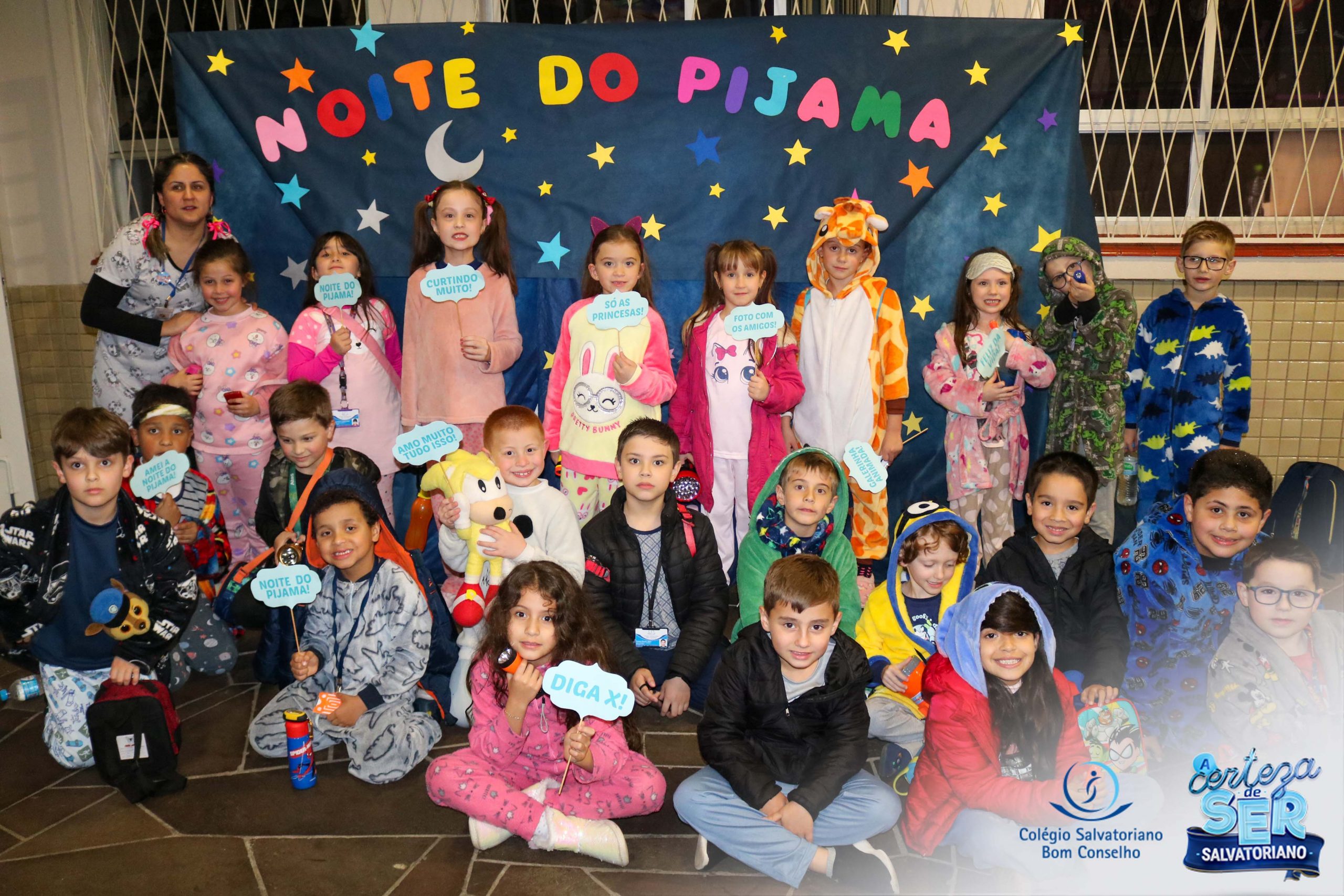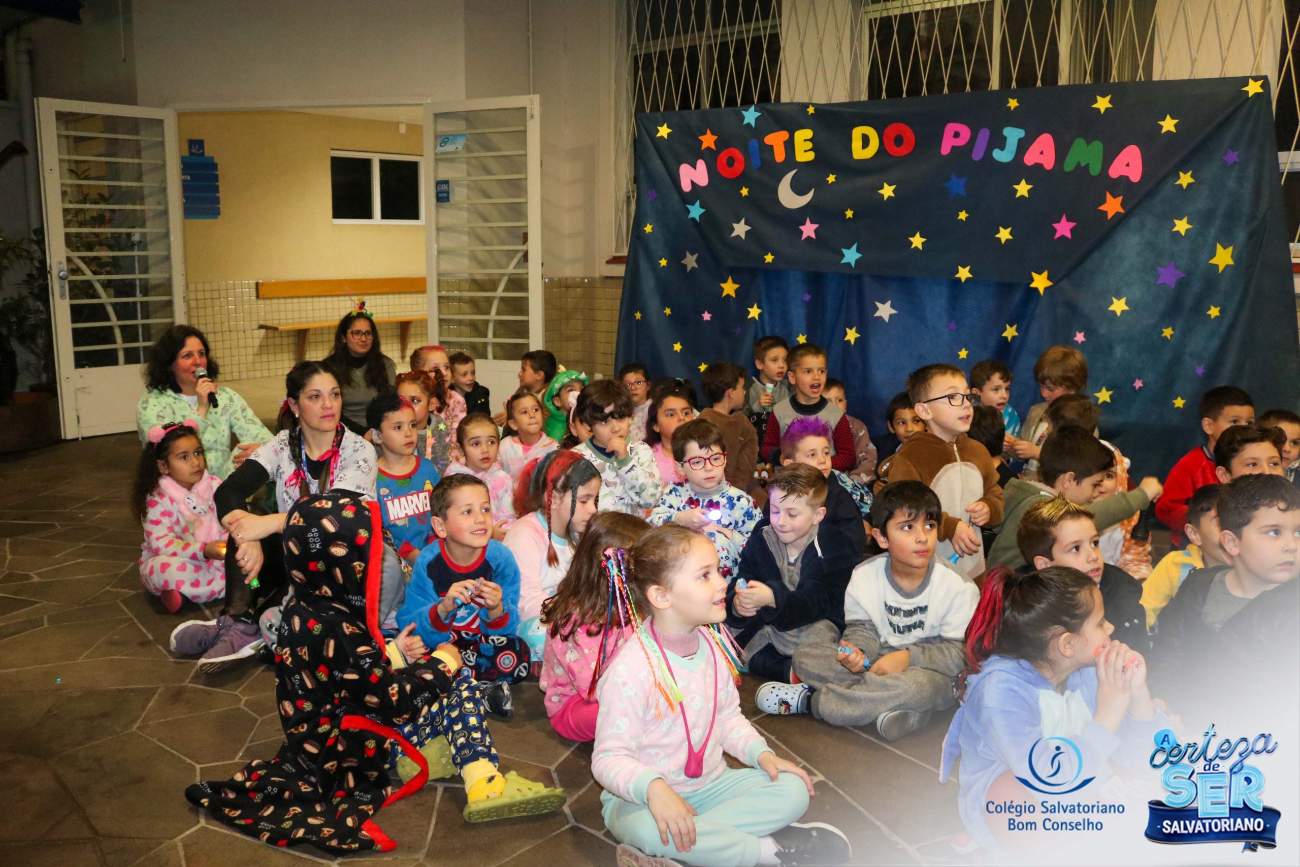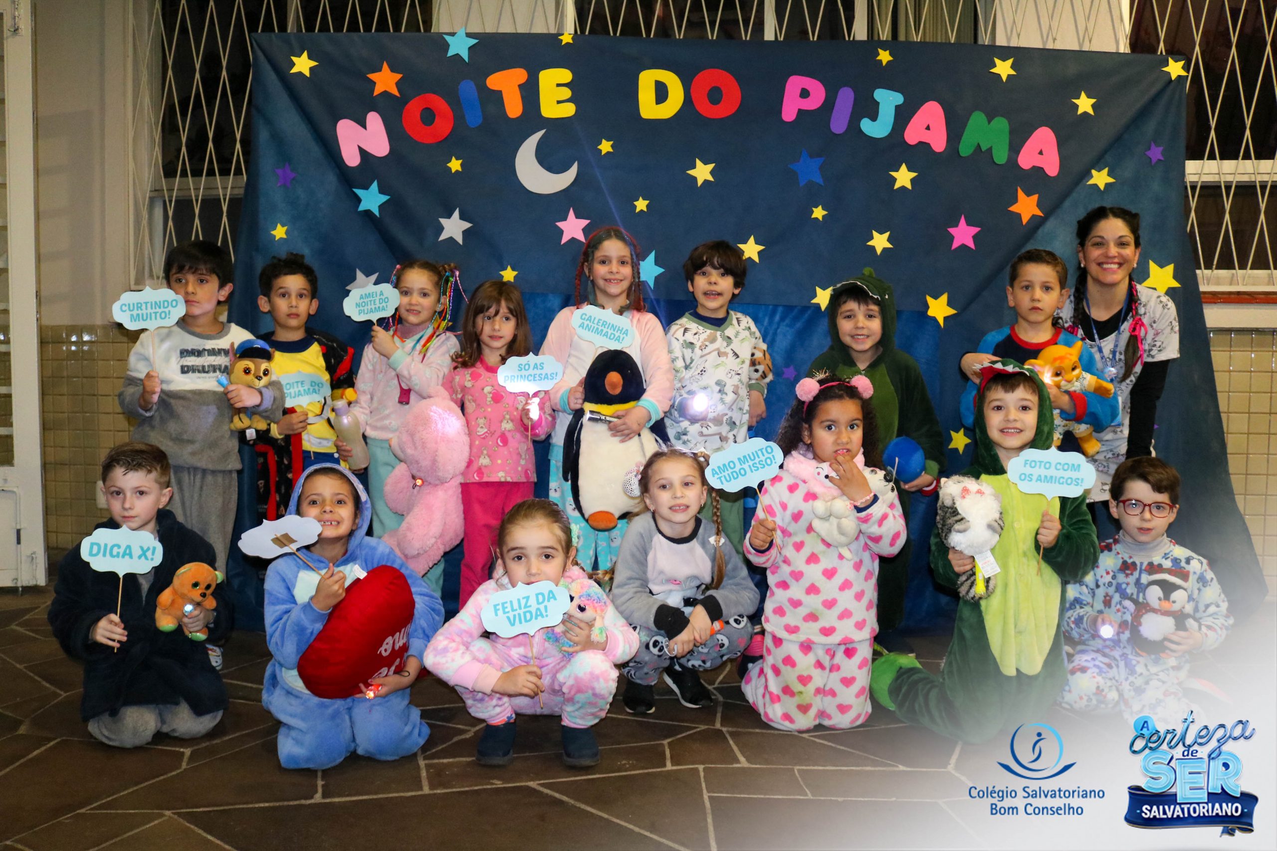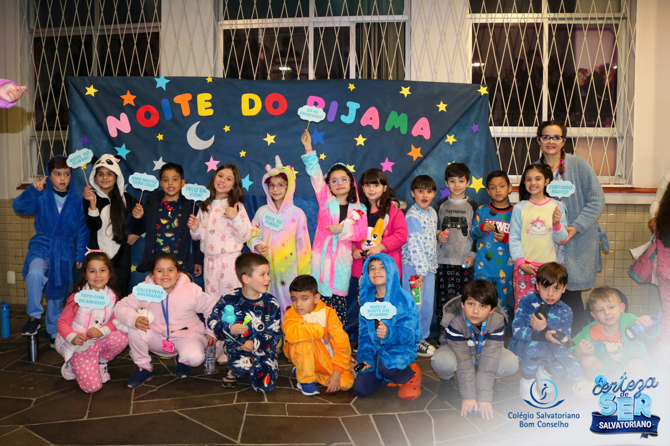 A Noite do Pijama 2022, aconteceu no colégio na última terça-feira, 11/10 das 19h às 21 horas e foi repleta de atividades super legais. Na chegada os estudantes foram acolhidos pelas professoras para o momento das fotos. Estudantes e professores vestiram-se com seus pijamas coloridos e animados. A primeira atividade foi uma caça ao tesouro. Seguindo as pistas as turmas desvendaram os enigmas com suas lanternas que iluminavam os espaços da escola. Após, os estudantes organizados em grupos participaram da Zumba Kids e brincaram nos brinquedos infláveis na quadra da escola. Para encerrar, todos participaram do jantar na escola!