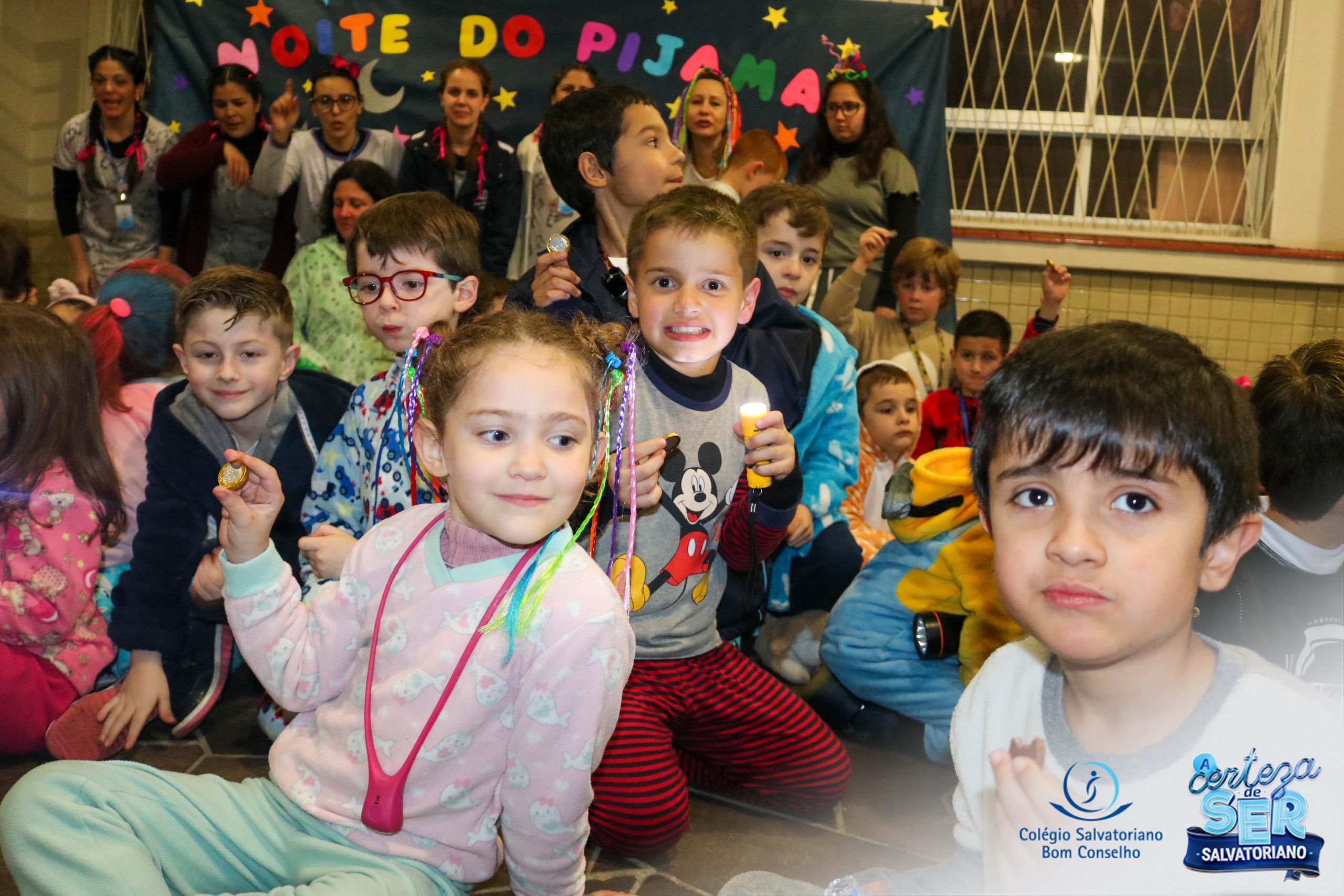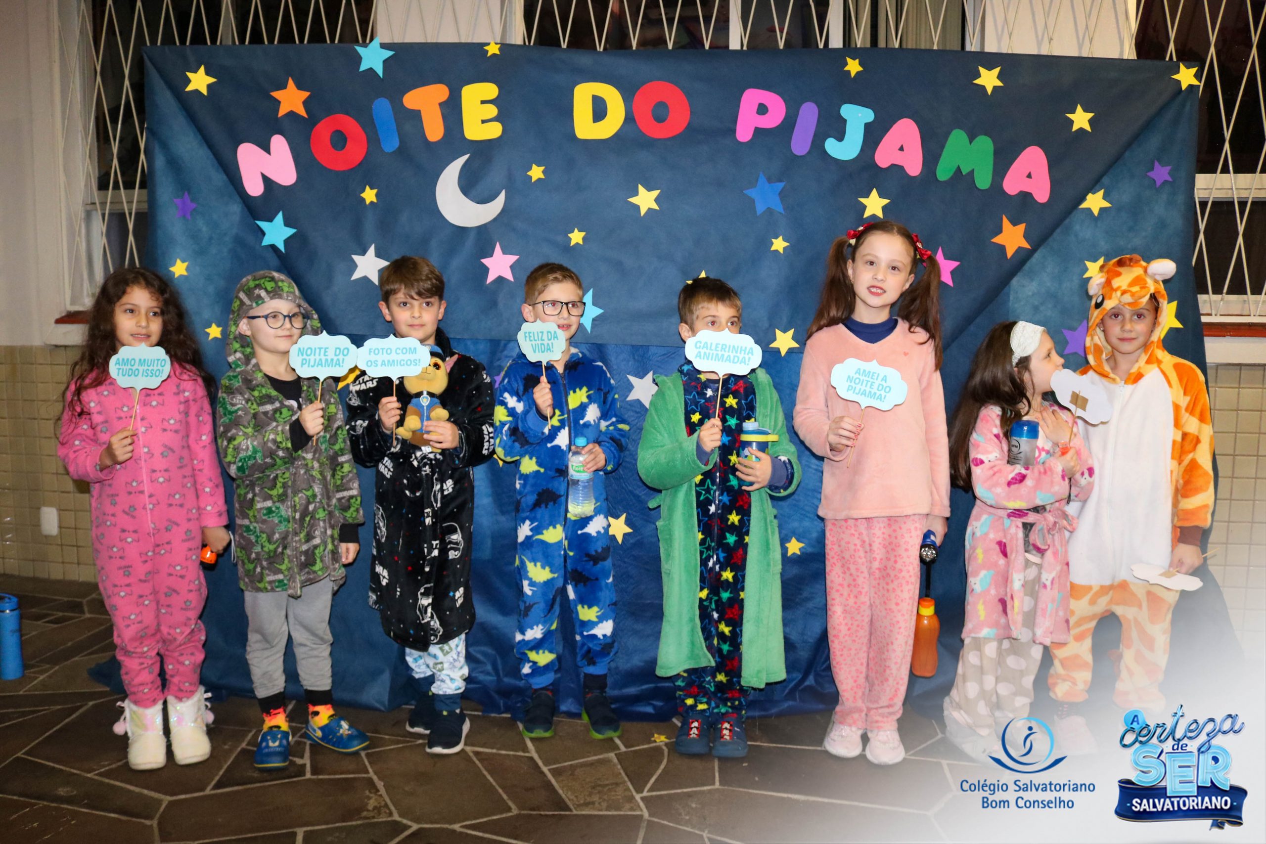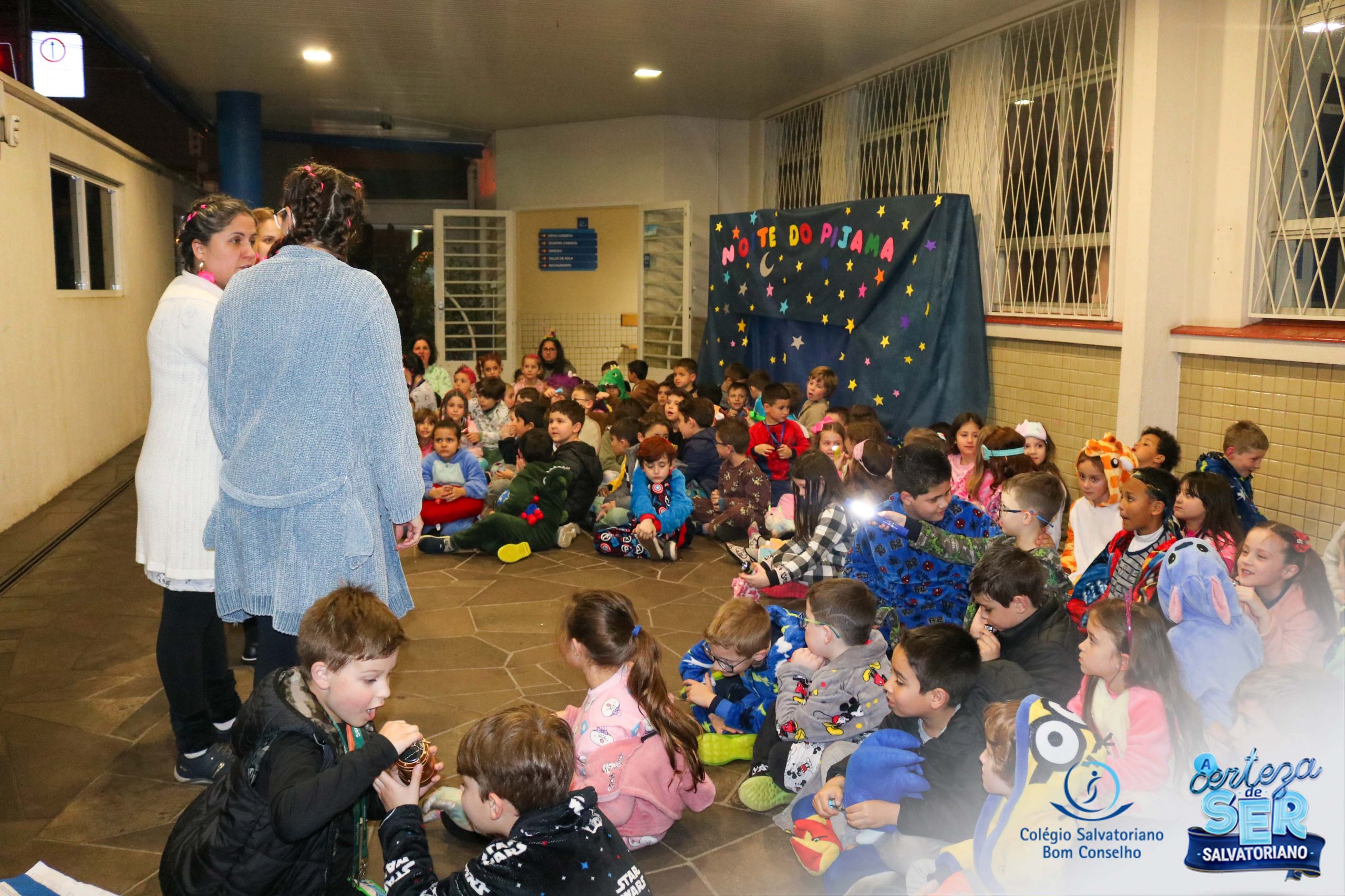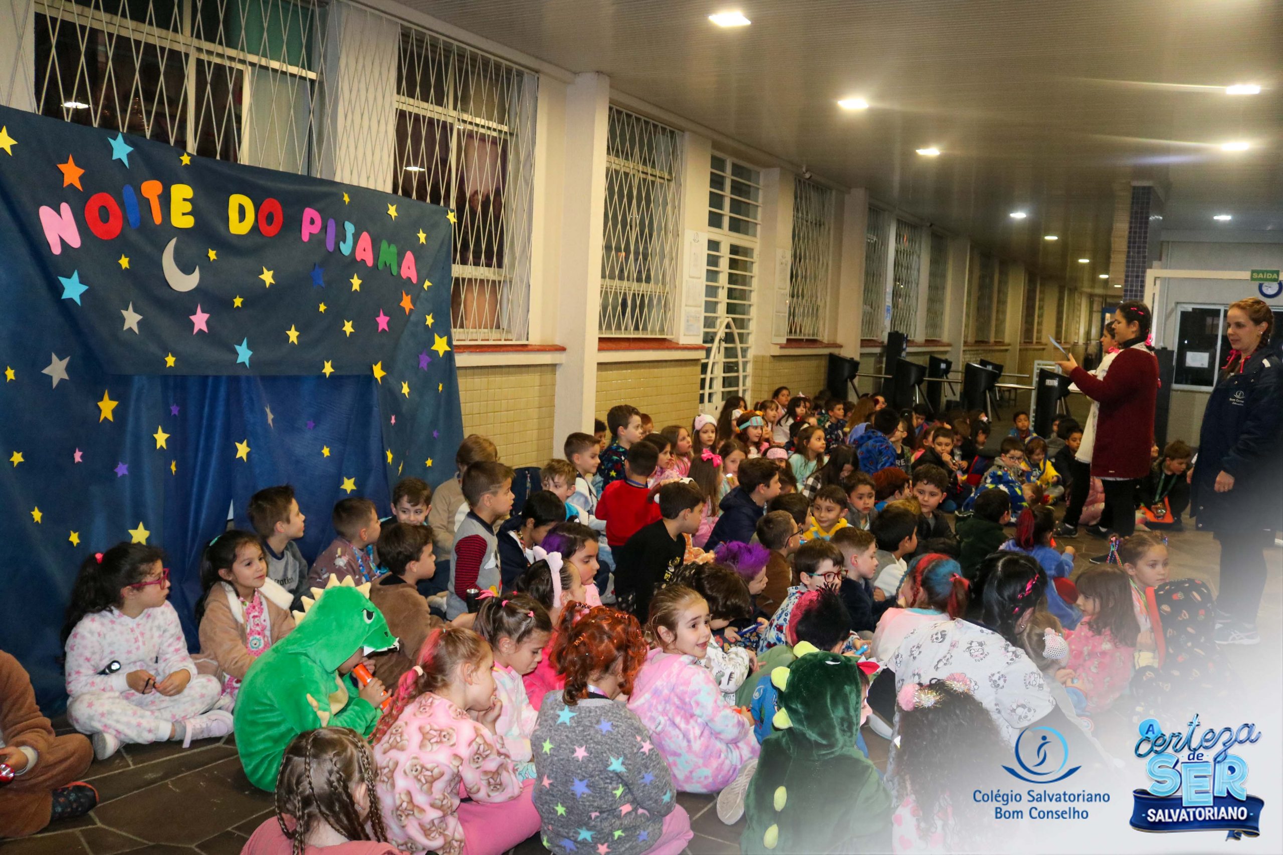 A Noite do Pijama 2022, aconteceu no colégio na última terça-feira, 11/10 das 19h às 21 horas e foi repleta de atividades super legais. Na chegada os estudantes foram acolhidos pelas professoras para o momento das fotos. Estudantes e professores vestiram-se com seus pijamas coloridos e animados. A primeira atividade foi uma caça ao tesouro. Seguindo as pistas as turmas desvendaram os enigmas com suas lanternas que iluminavam os espaços da escola. Após, os estudantes organizados em grupos participaram da Zumba Kids e brincaram nos brinquedos infláveis na quadra da escola. Para encerrar, todos participaram do jantar na escola!