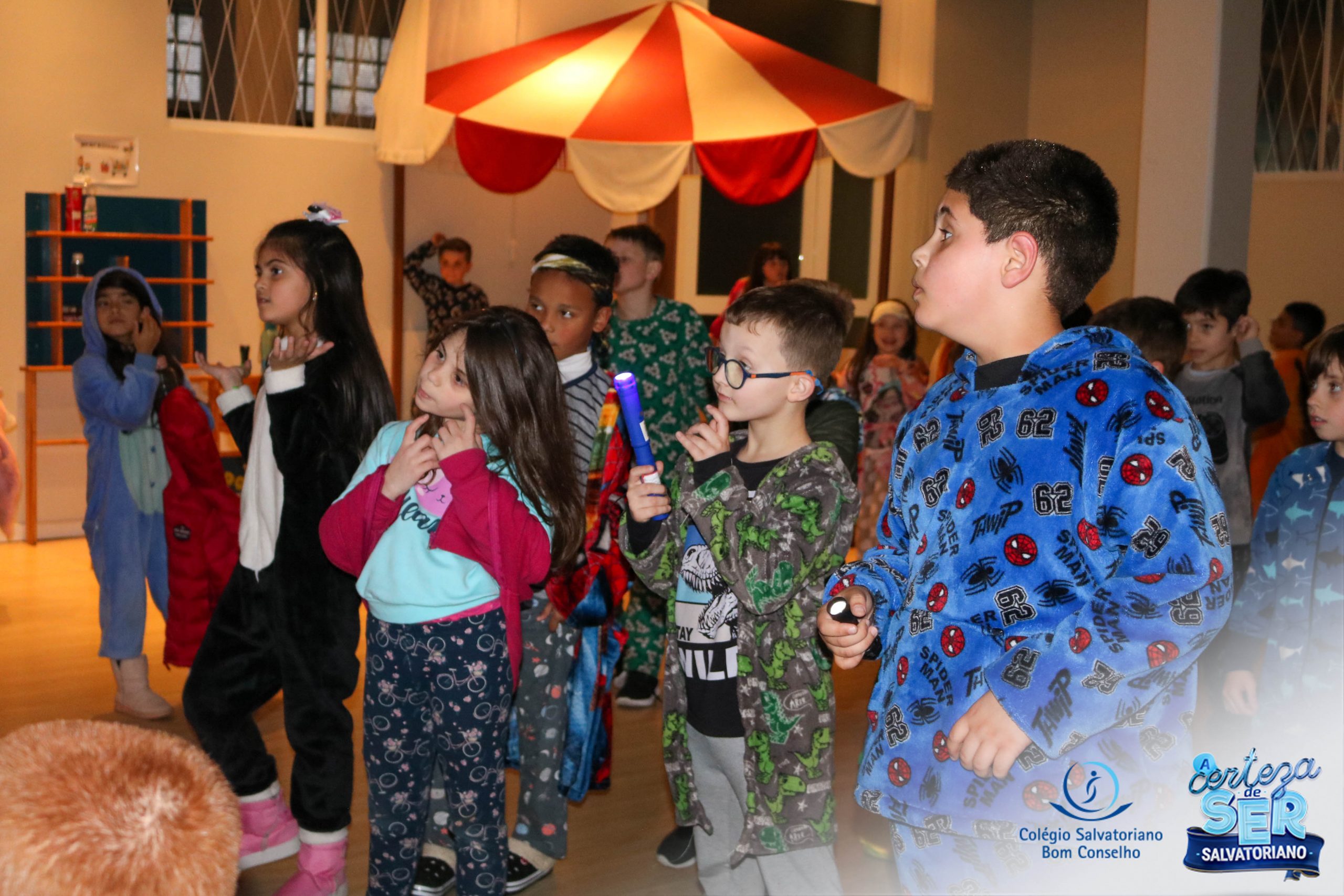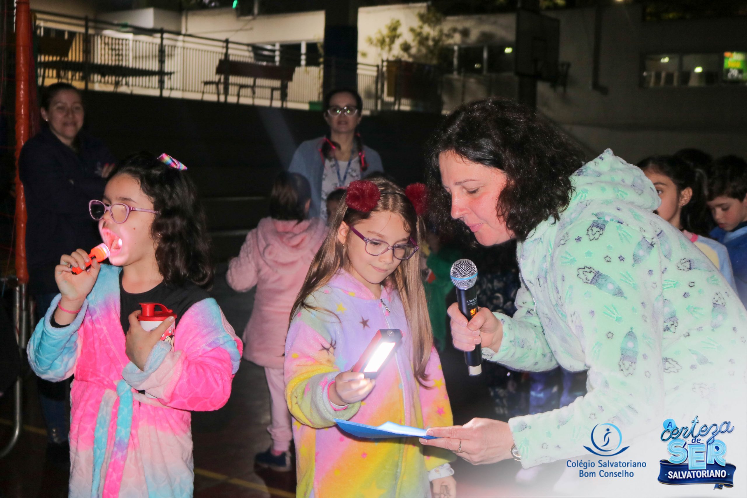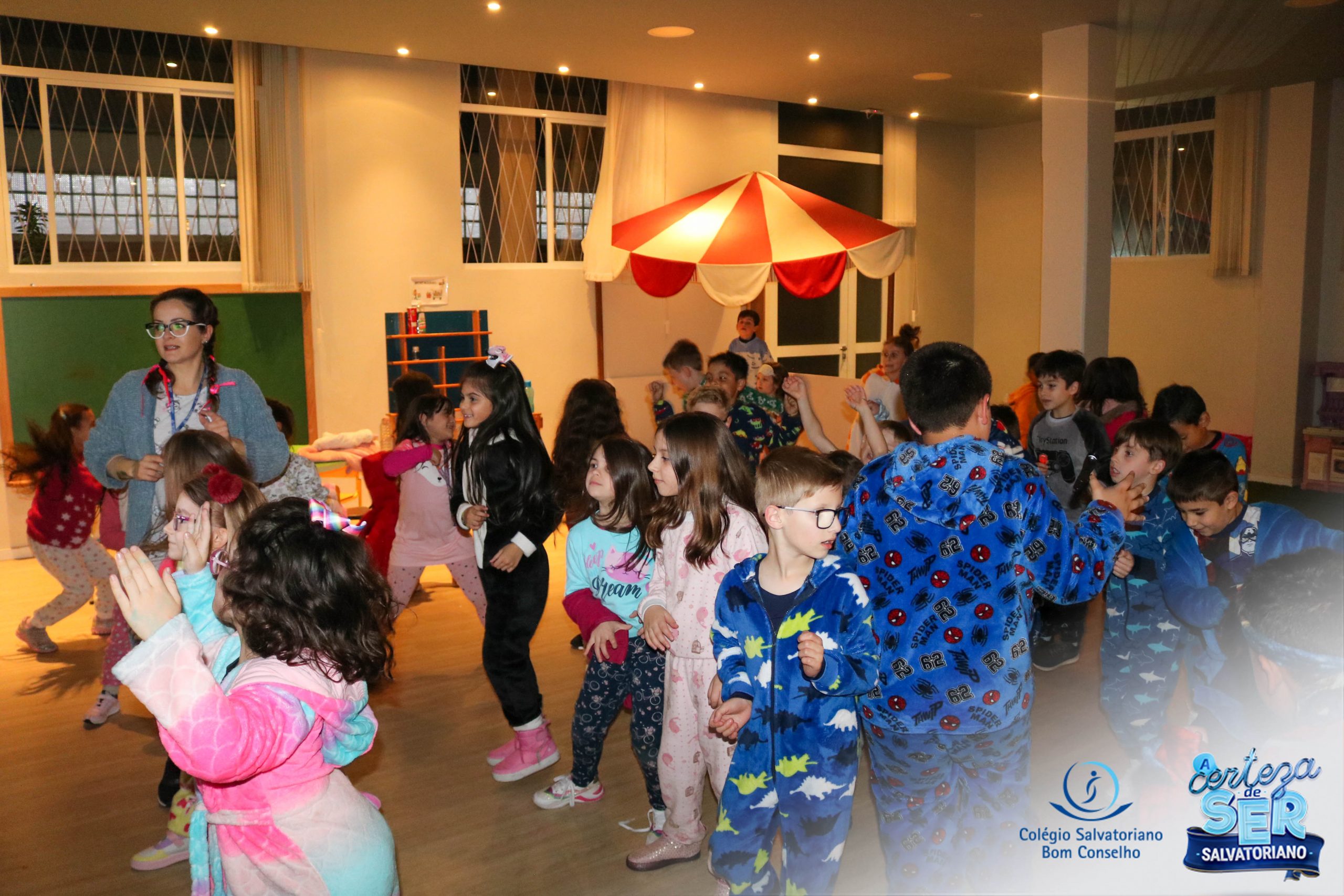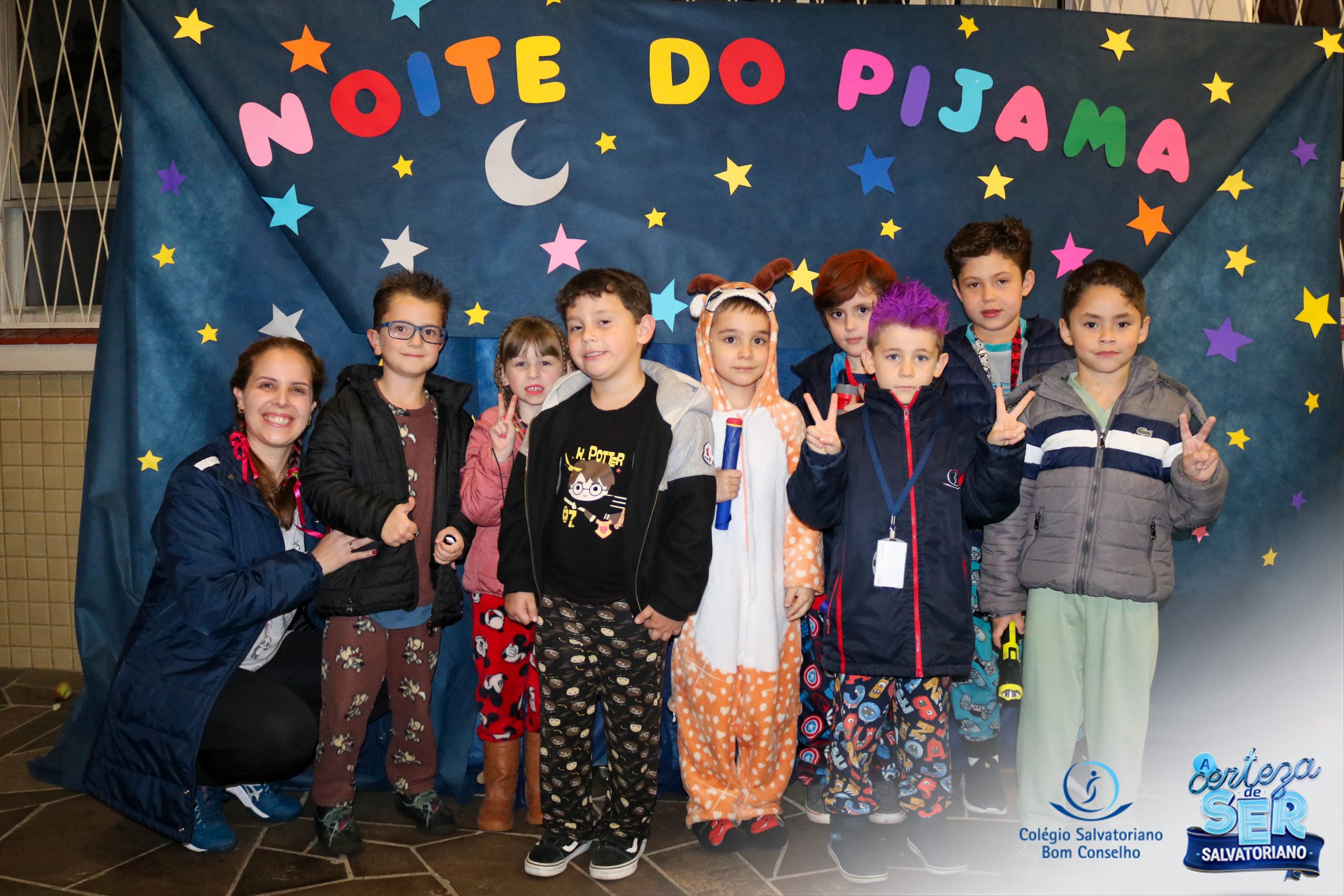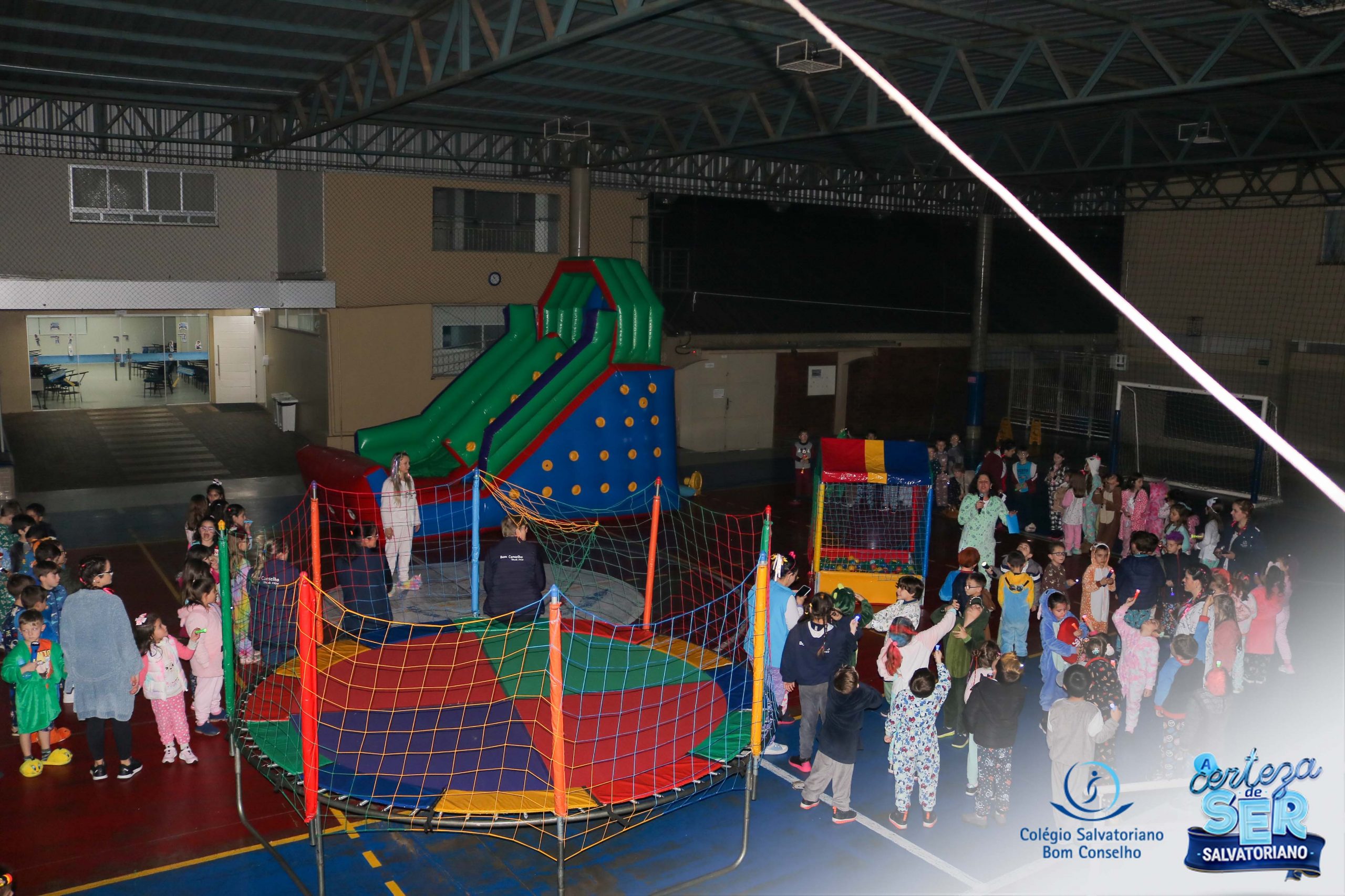 A Noite do Pijama 2022, aconteceu no colégio na última terça-feira, 11/10 das 19h às 21 horas e foi repleta de atividades super legais. Na chegada os estudantes foram acolhidos pelas professoras para o momento das fotos. Estudantes e professores vestiram-se com seus pijamas coloridos e animados. A primeira atividade foi uma caça ao tesouro. Seguindo as pistas as turmas desvendaram os enigmas com suas lanternas que iluminavam os espaços da escola. Após, os estudantes organizados em grupos participaram da Zumba Kids e brincaram nos brinquedos infláveis na quadra da escola. Para encerrar, todos participaram do jantar na escola!
