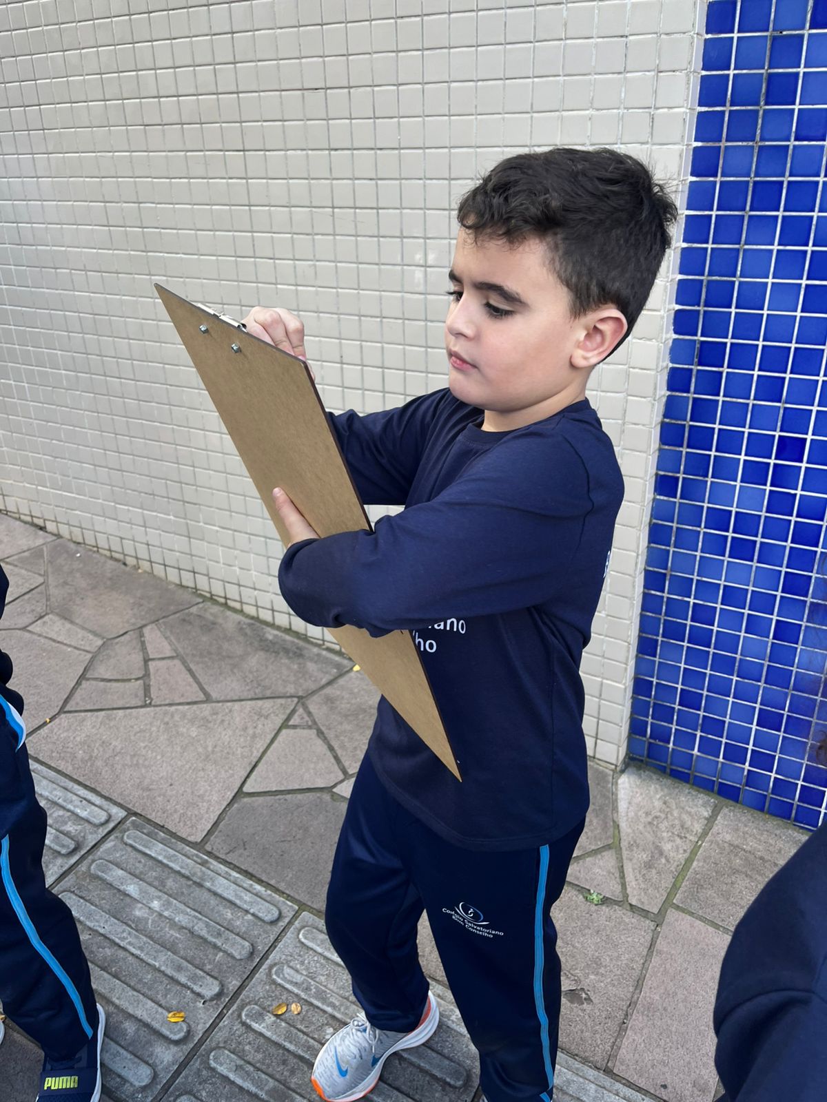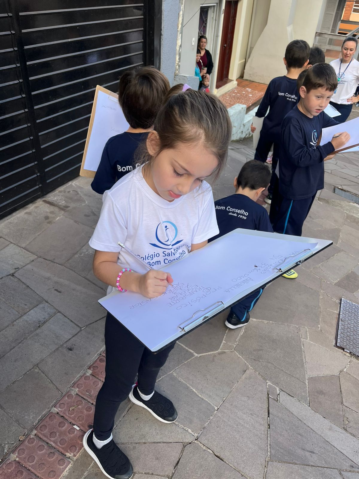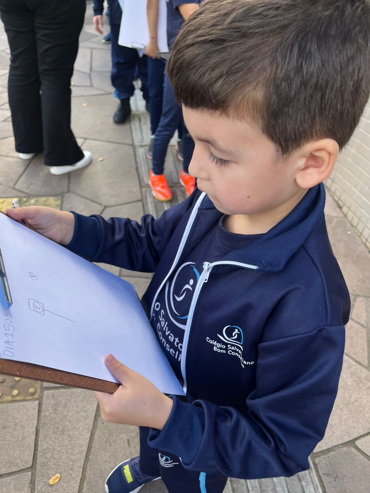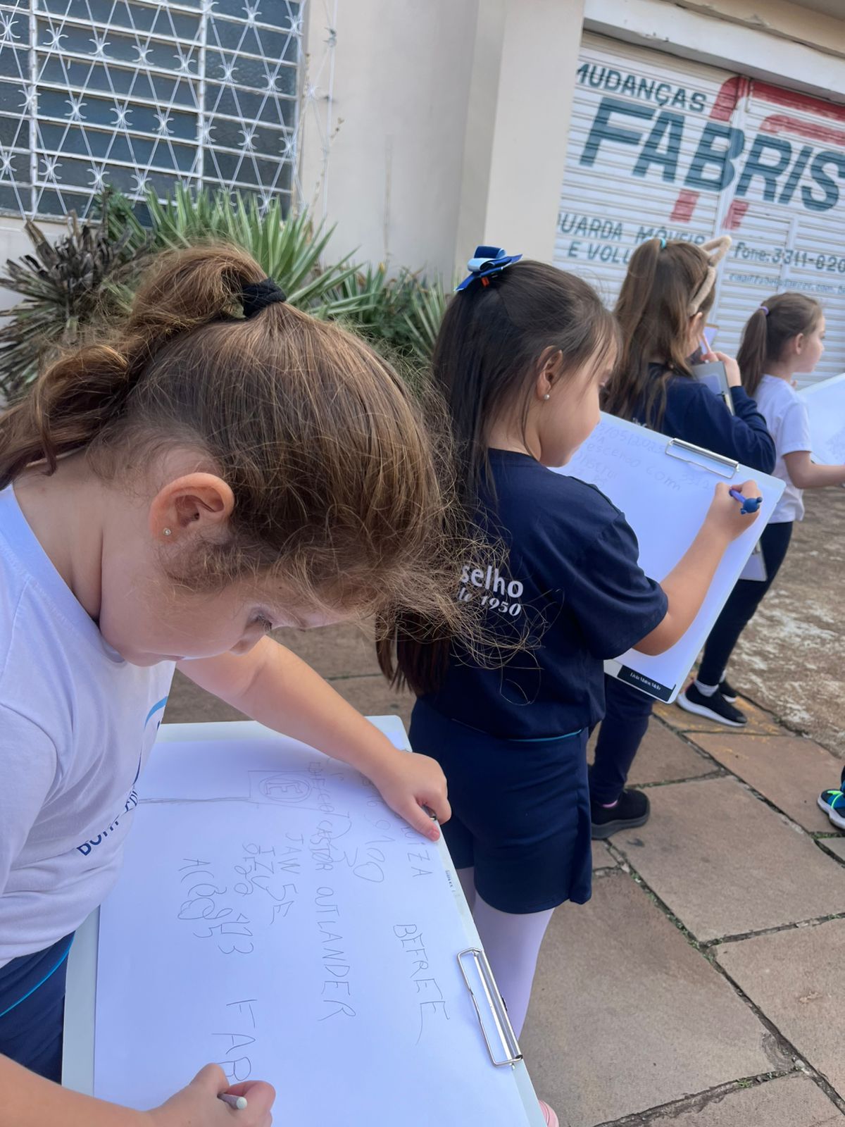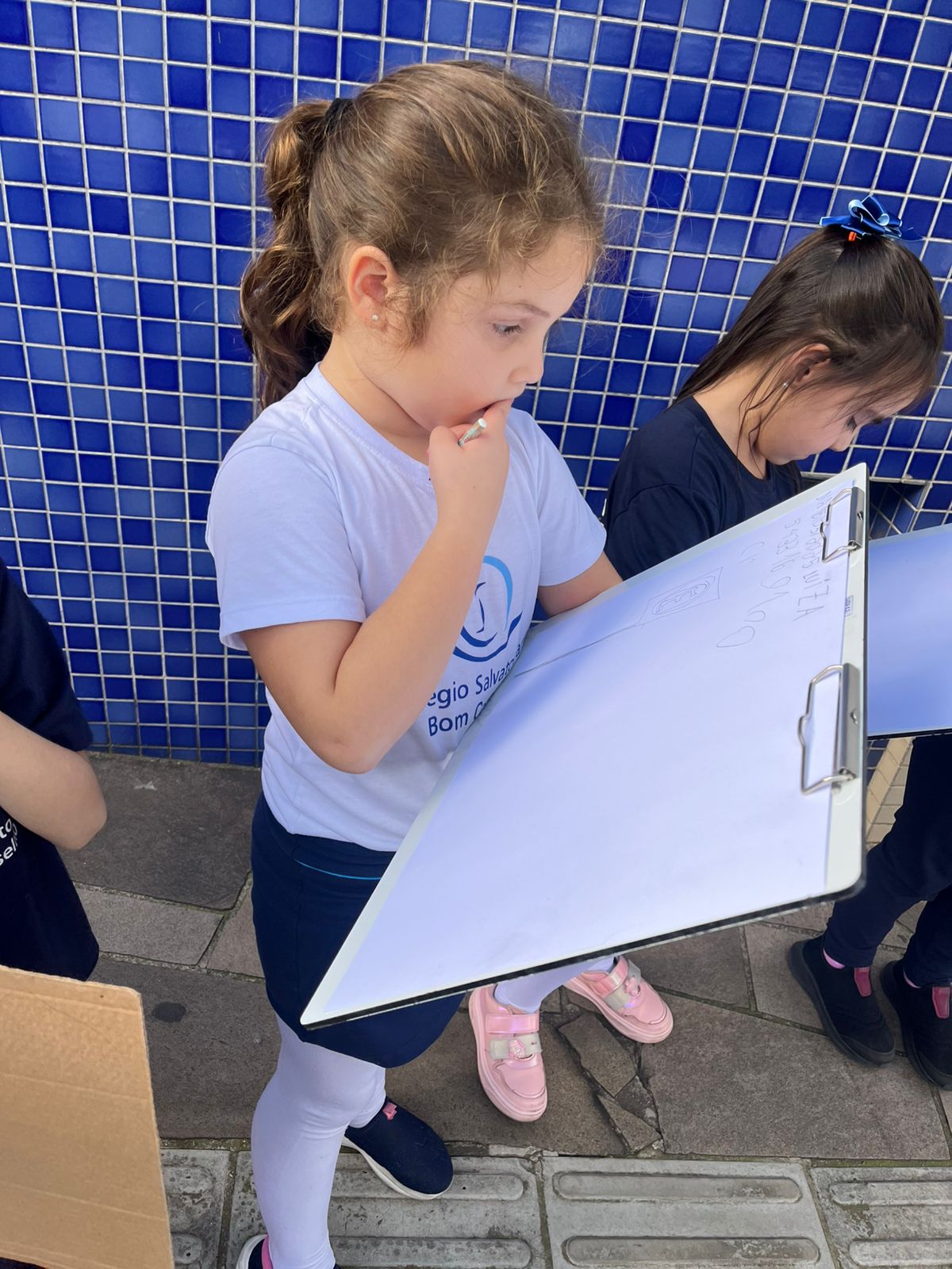 Uma das atividades propostas foi a de dar uma volta no quarteirão da escola para observar placas, letreiros, anúncios, palavras… e registrar em uma prancheta.