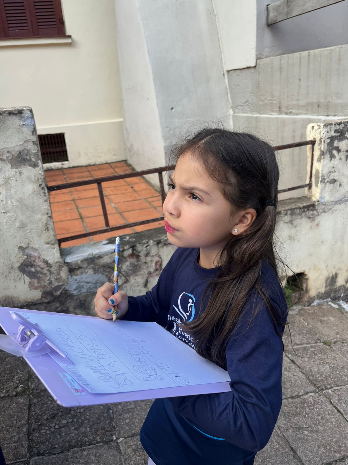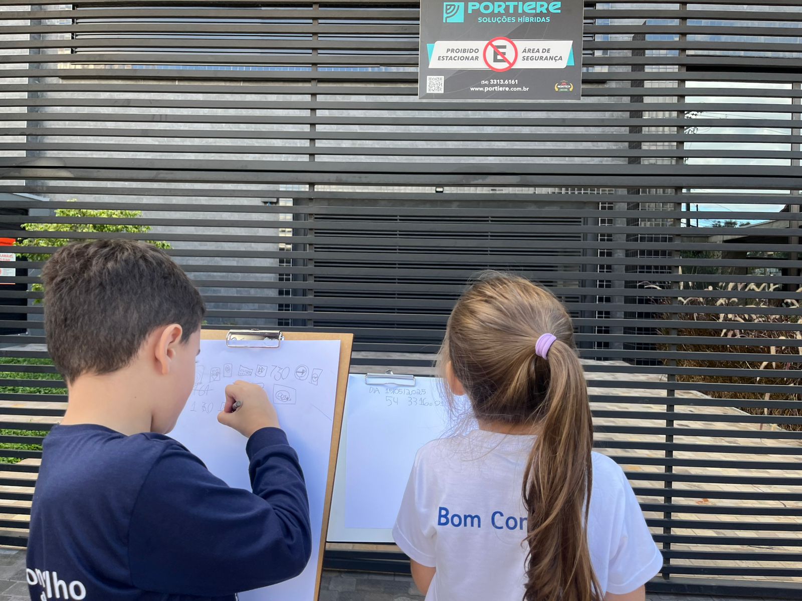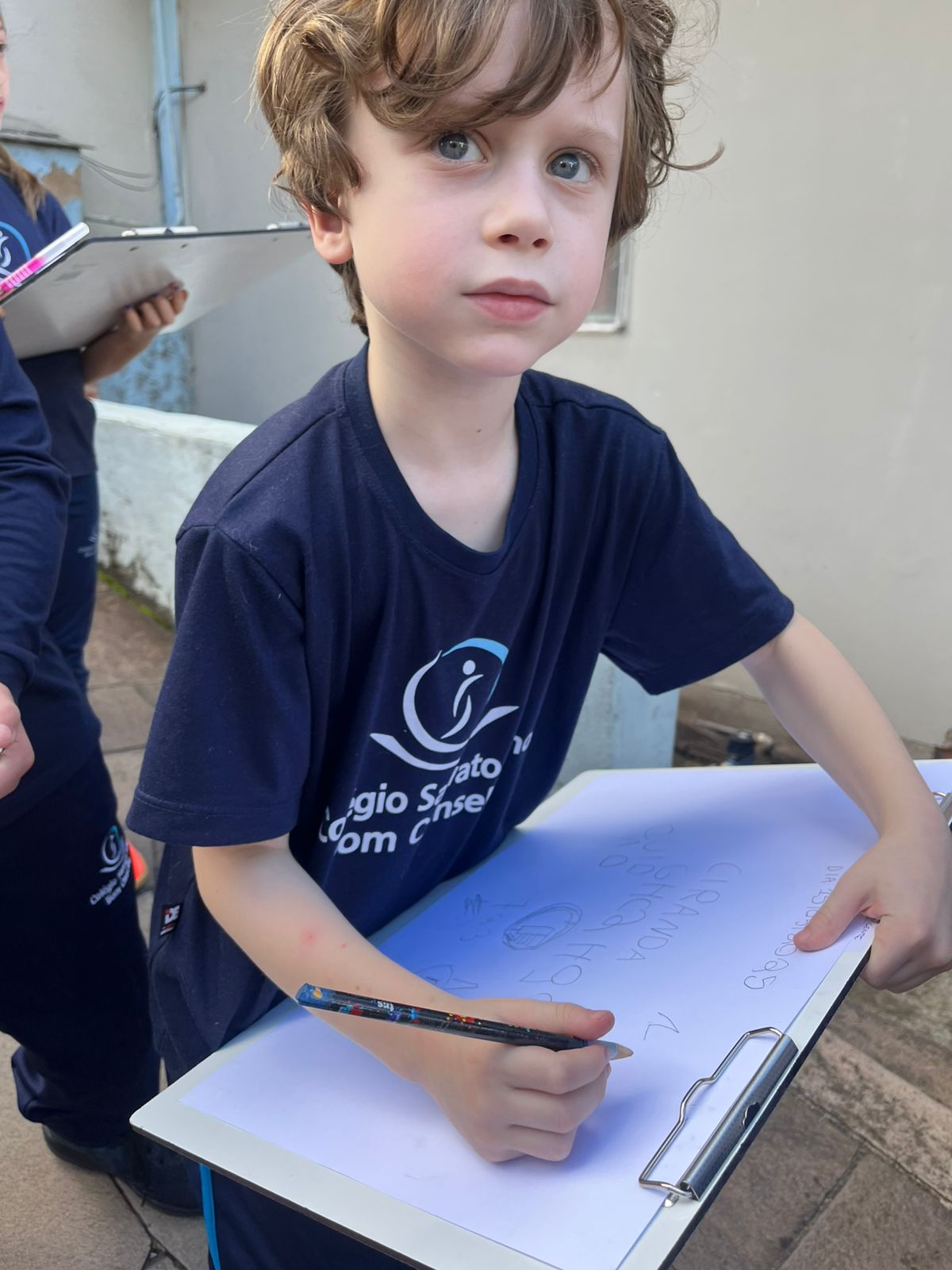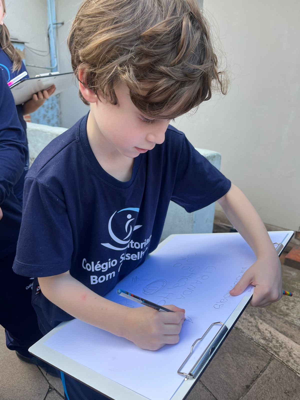 Uma das atividades propostas foi a de dar uma volta no quarteirão da escola para observar placas, letreiros, anúncios, palavras… e registrar em uma prancheta.
