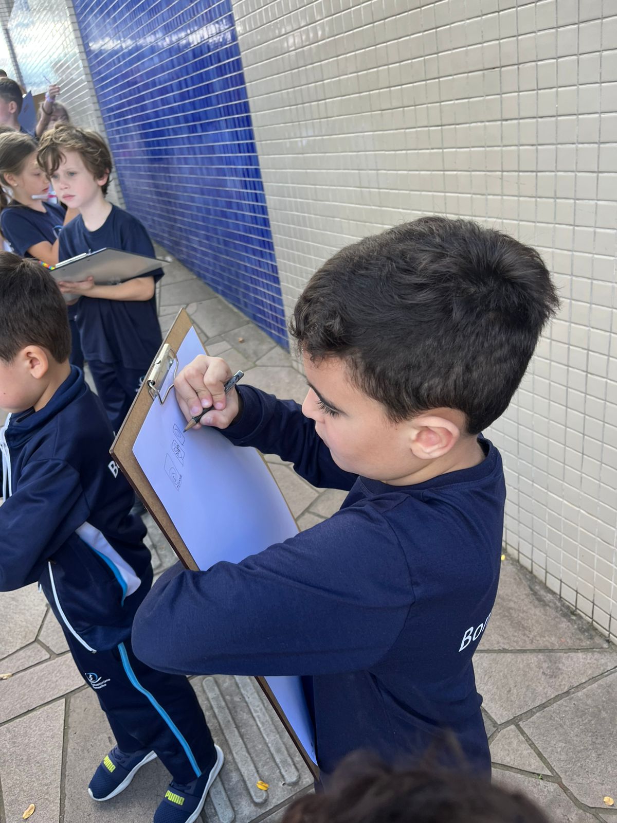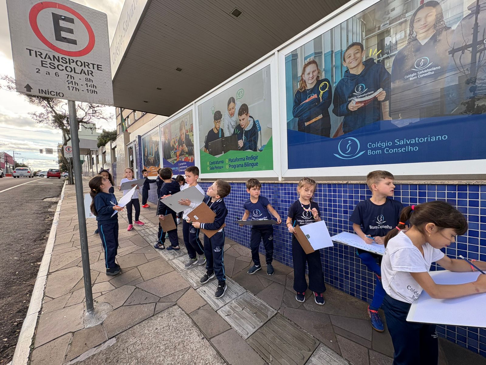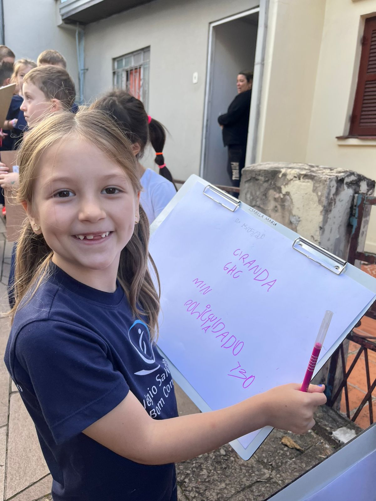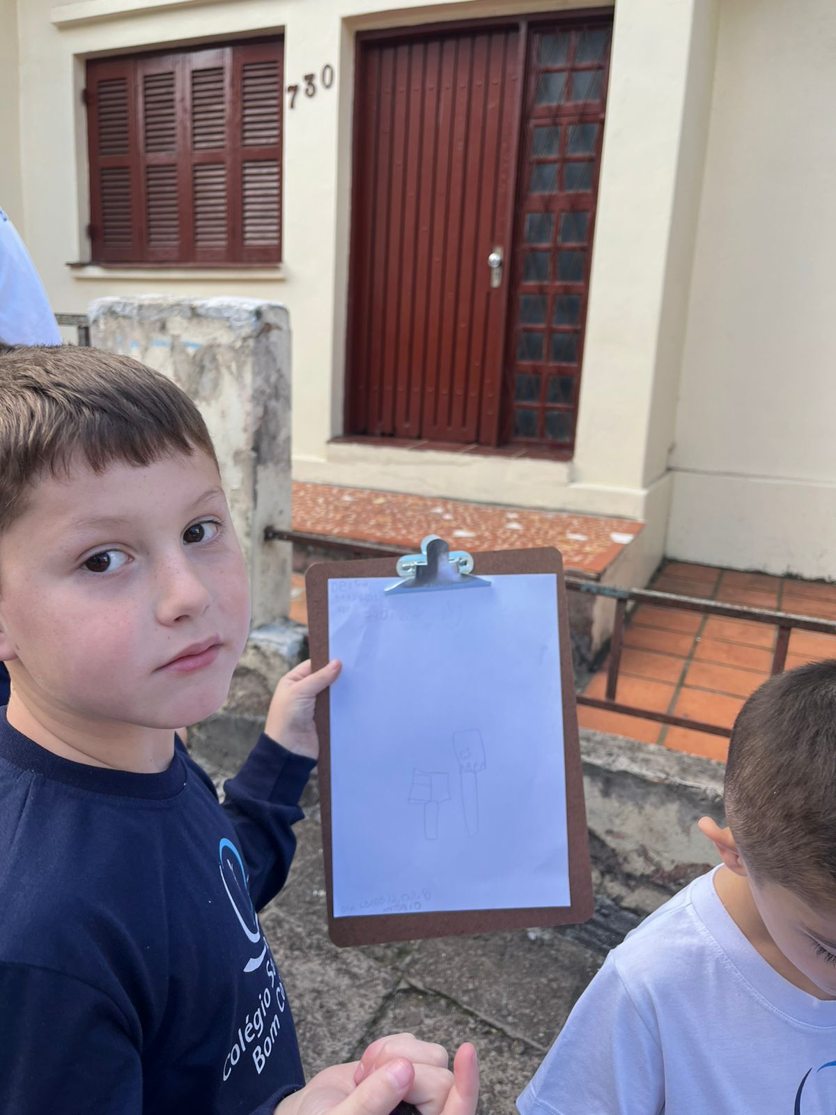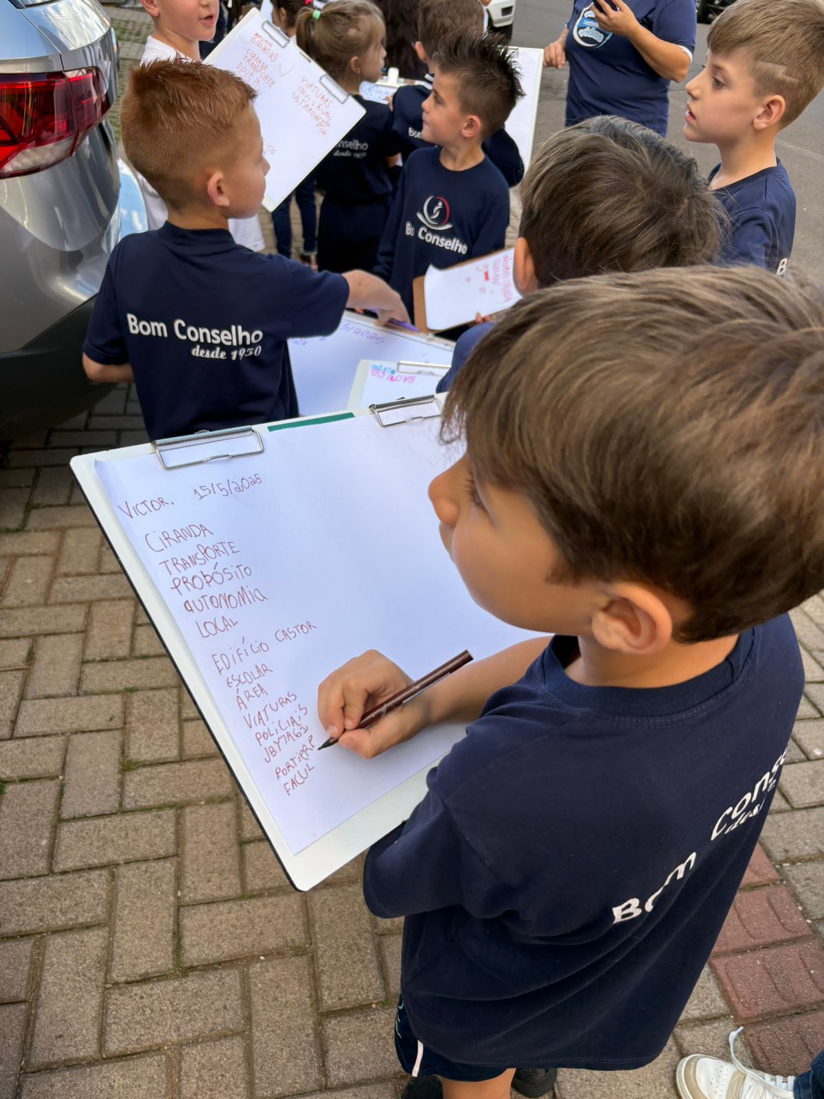 Uma das atividades propostas foi a de dar uma volta no quarteirão da escola para observar placas, letreiros, anúncios, palavras… e registrar em uma prancheta.