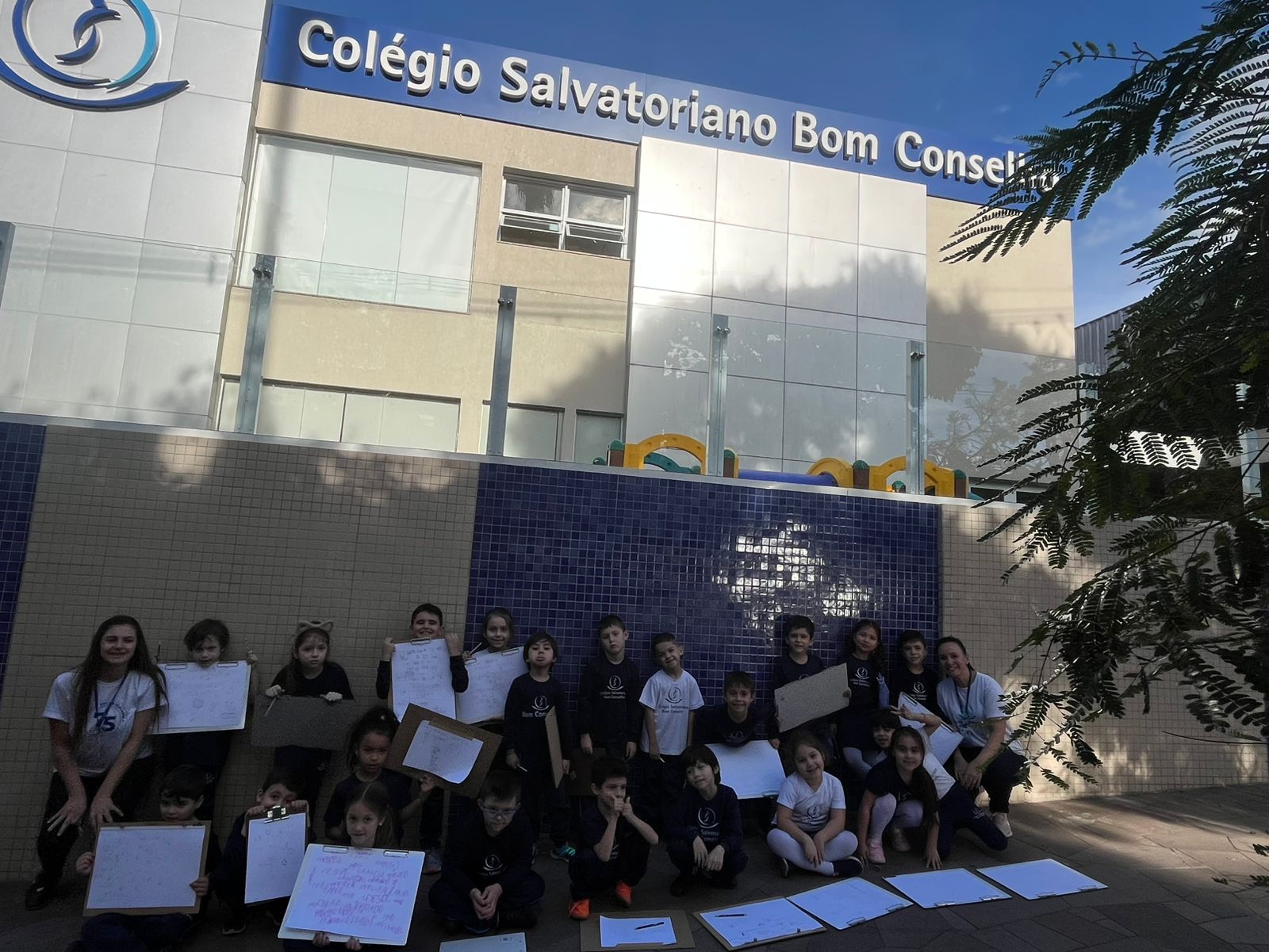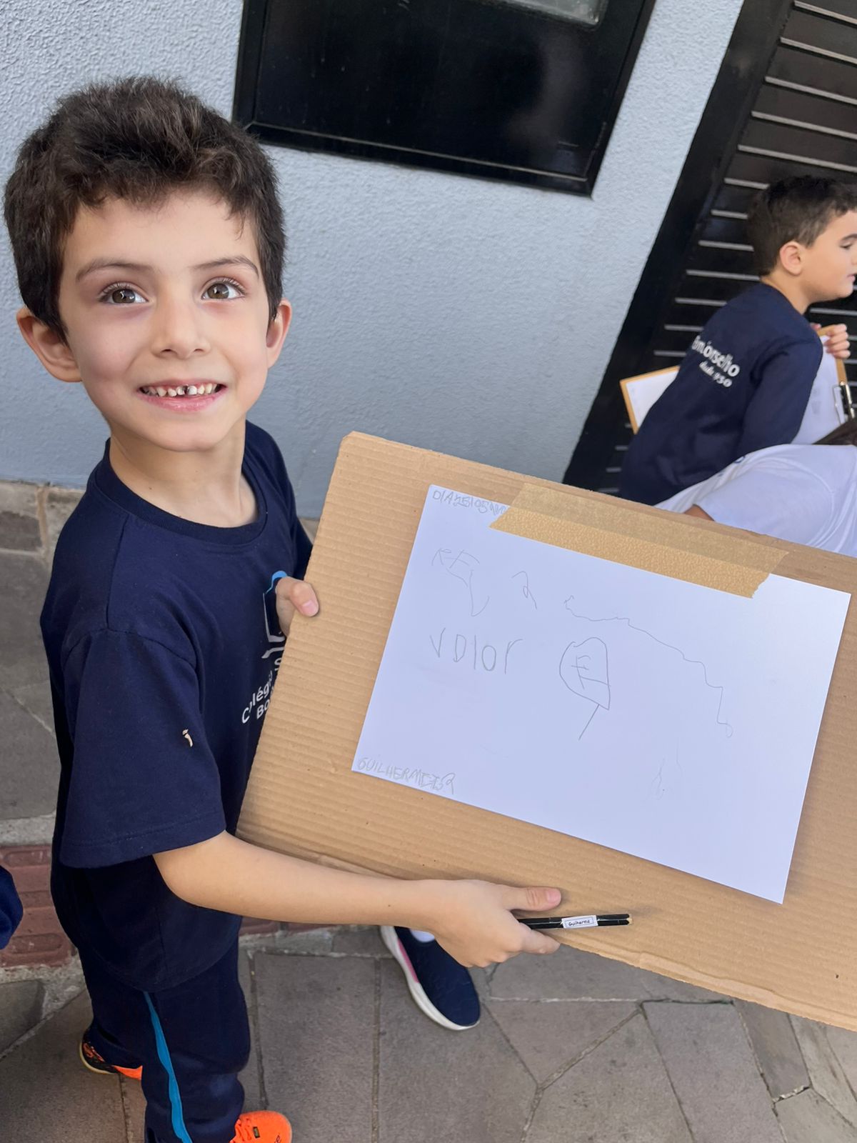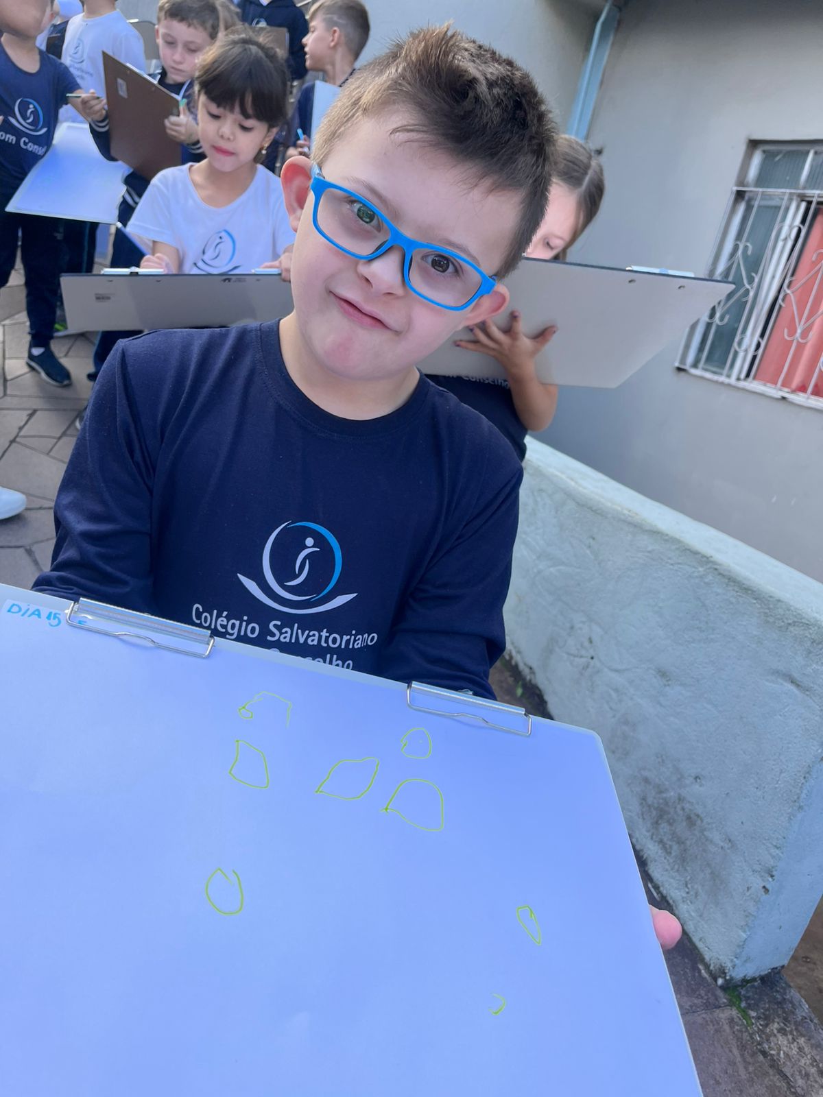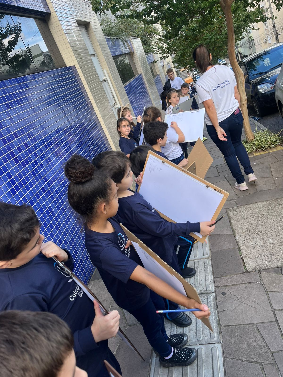 Uma das atividades propostas foi a de dar uma volta no quarteirão da escola para observar placas, letreiros, anúncios, palavras… e registrar em uma prancheta.