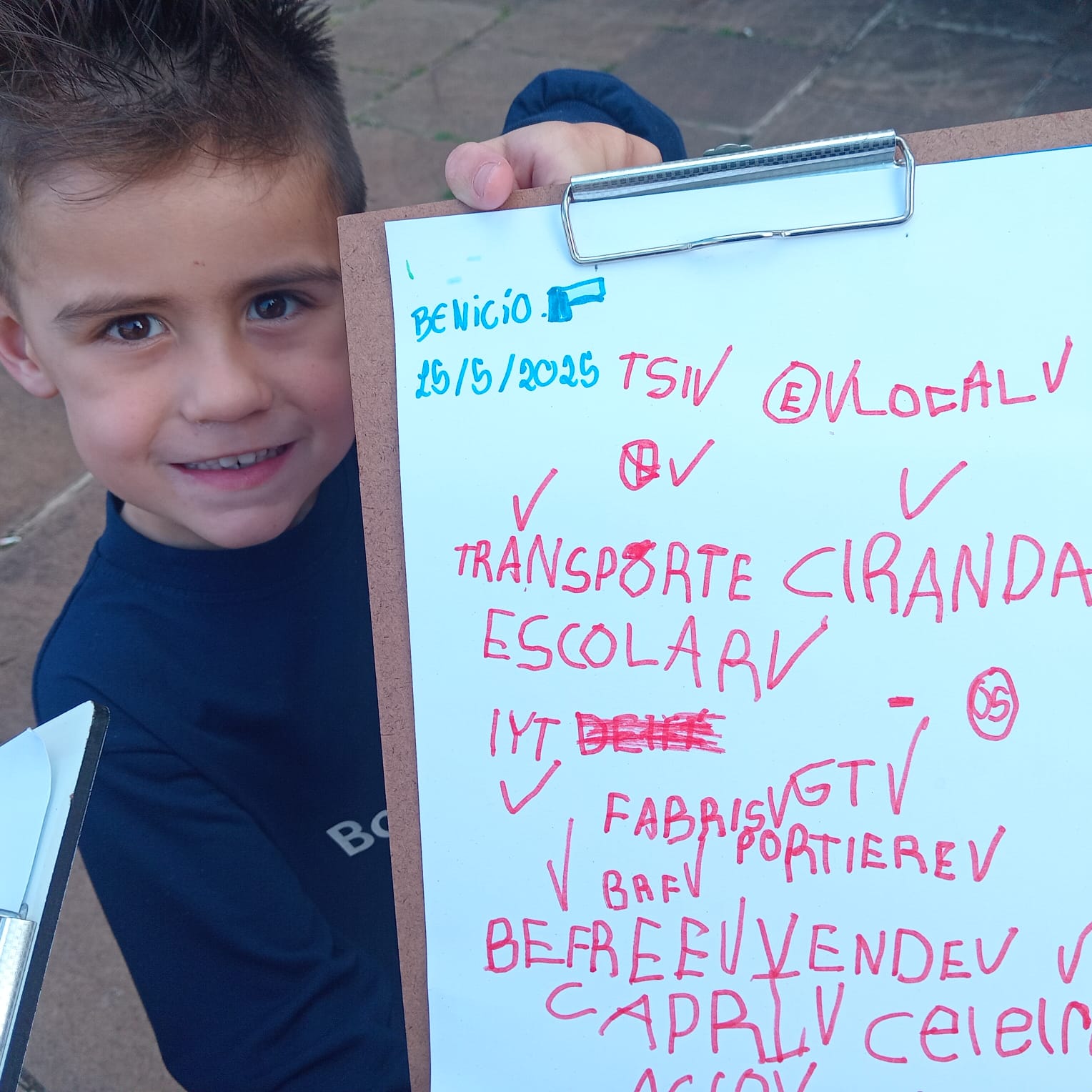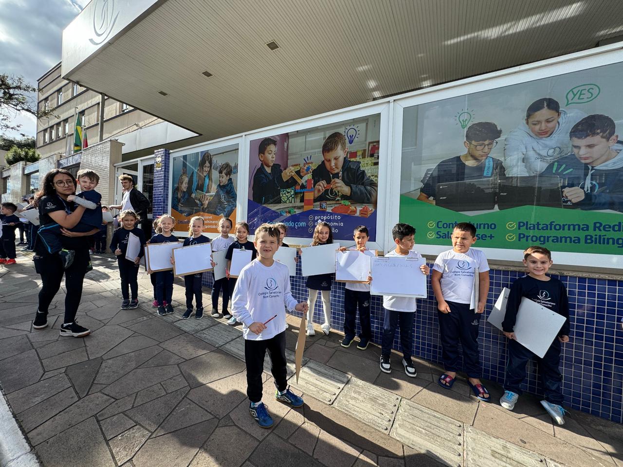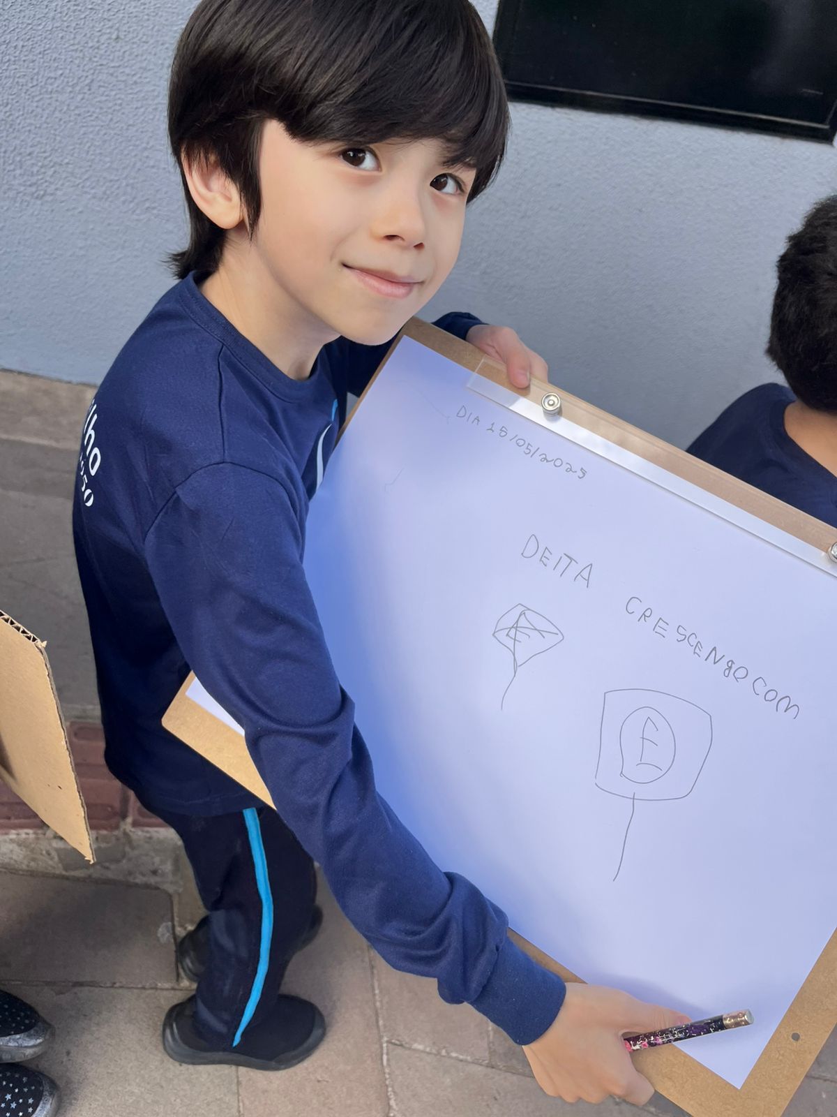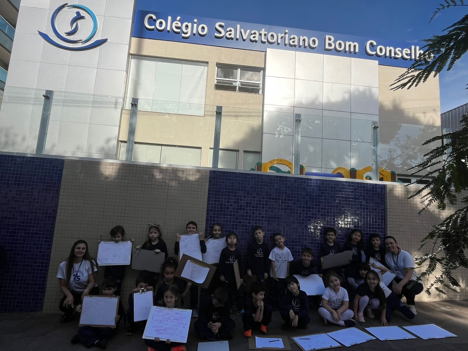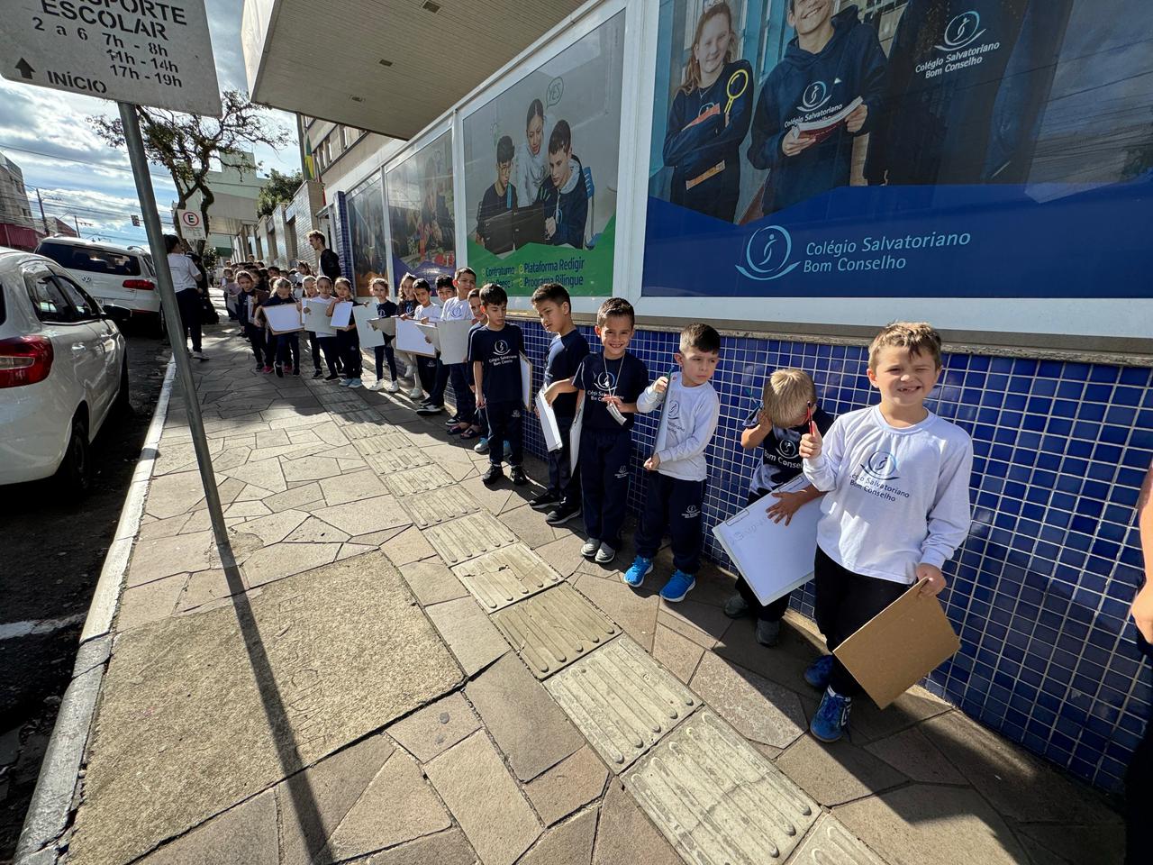 Uma das atividades propostas foi a de dar uma volta no quarteirão da escola para observar placas, letreiros, anúncios, palavras… e registrar em uma prancheta.