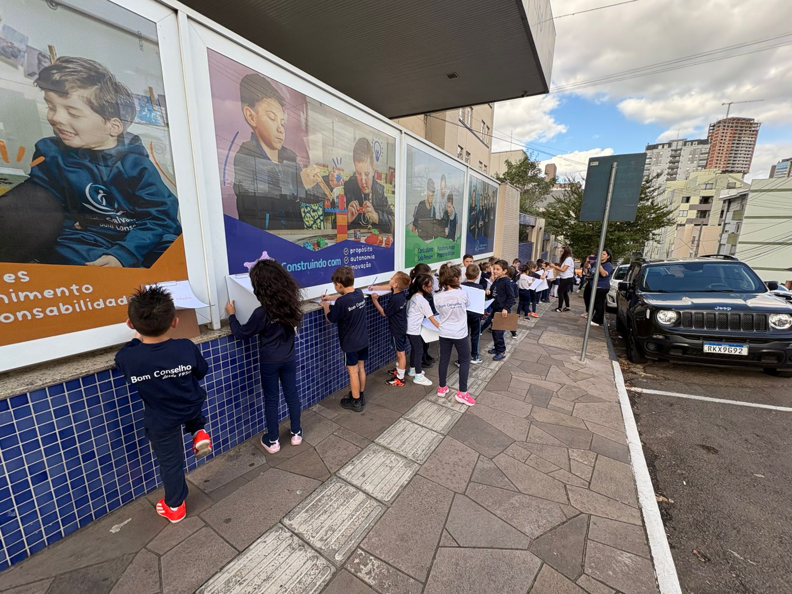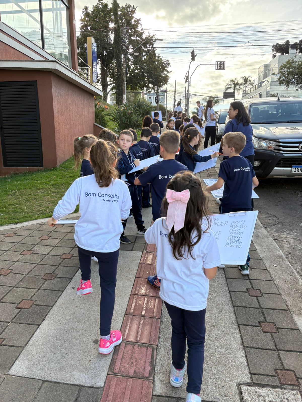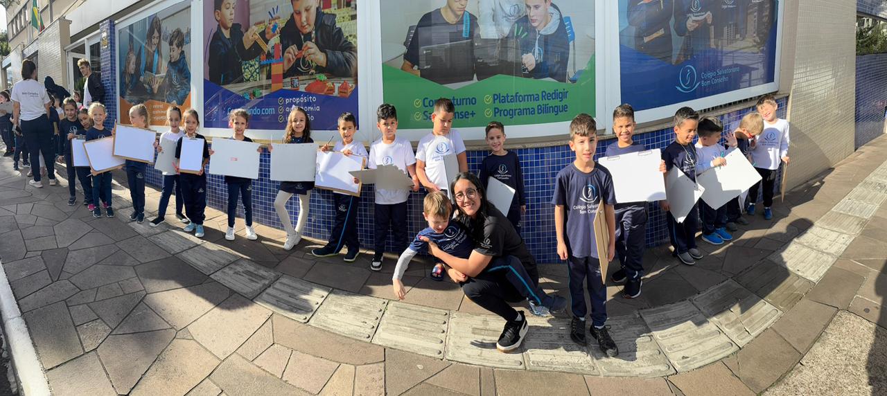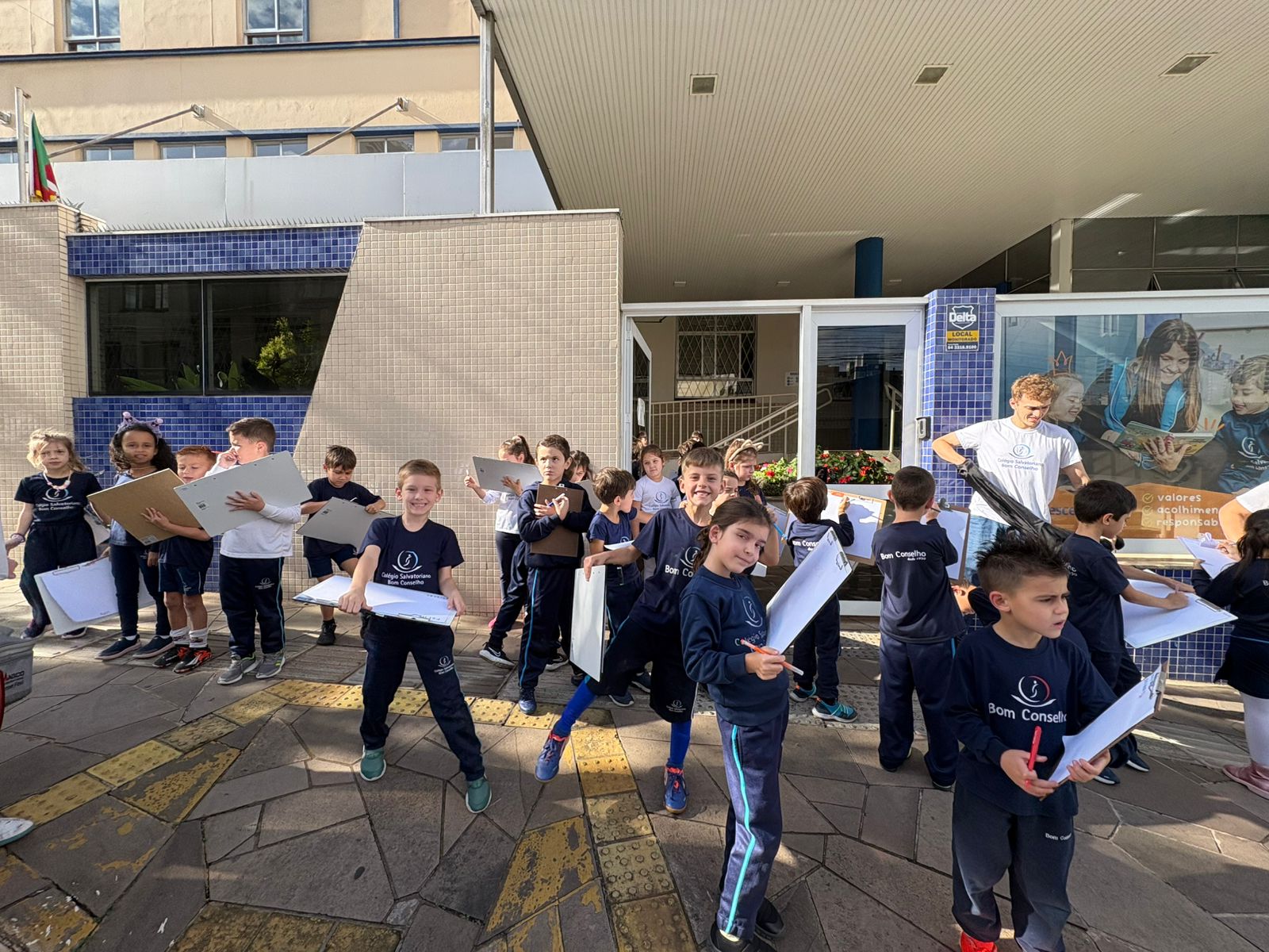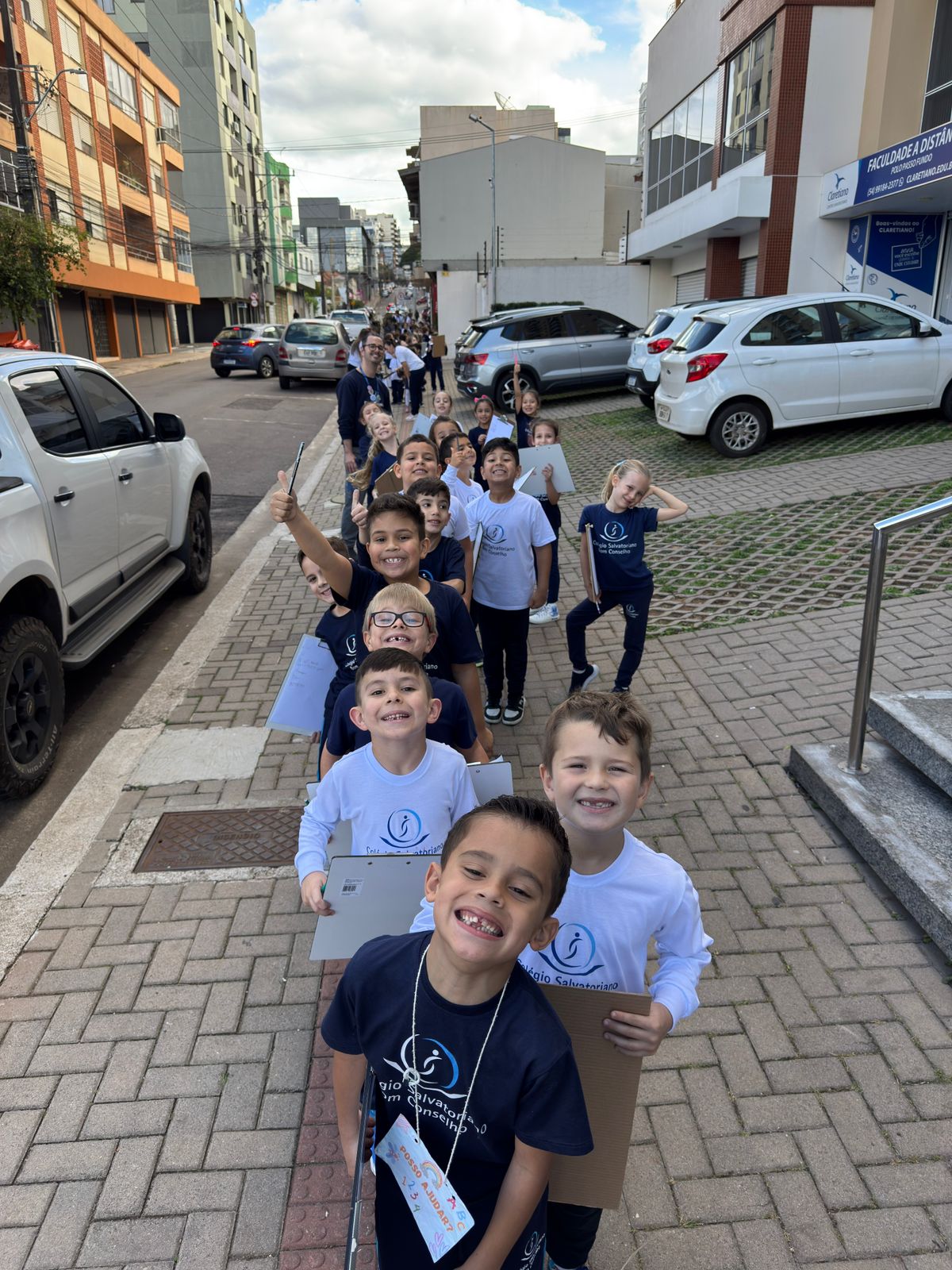 Uma das atividades propostas foi a de dar uma volta no quarteirão da escola para observar placas, letreiros, anúncios, palavras… e registrar em uma prancheta.