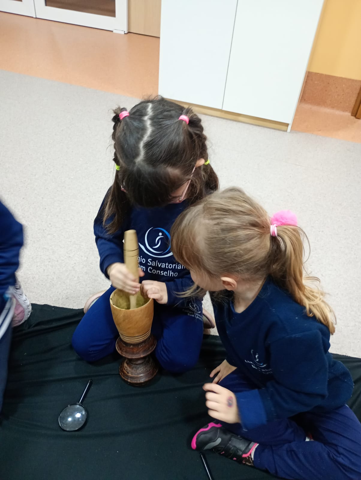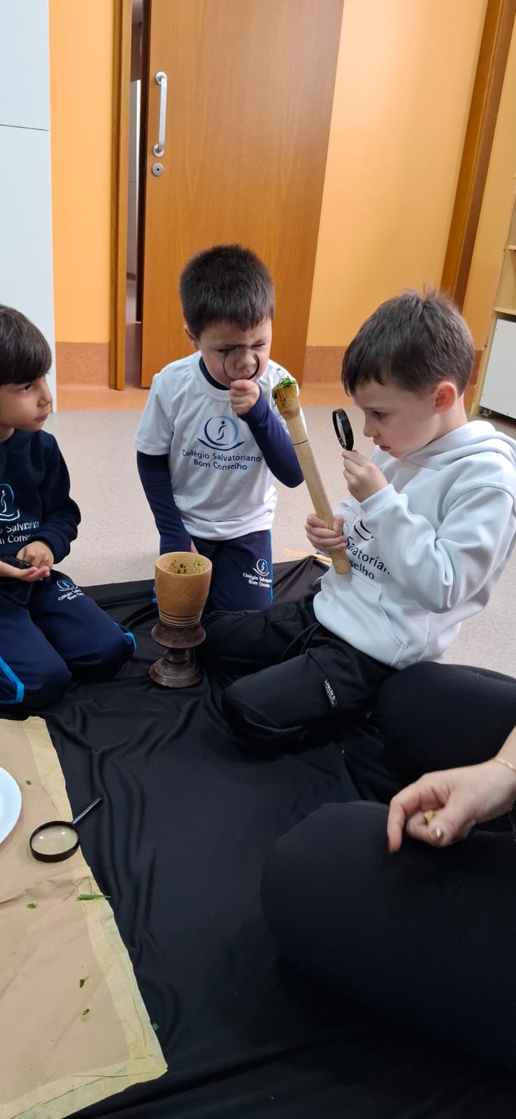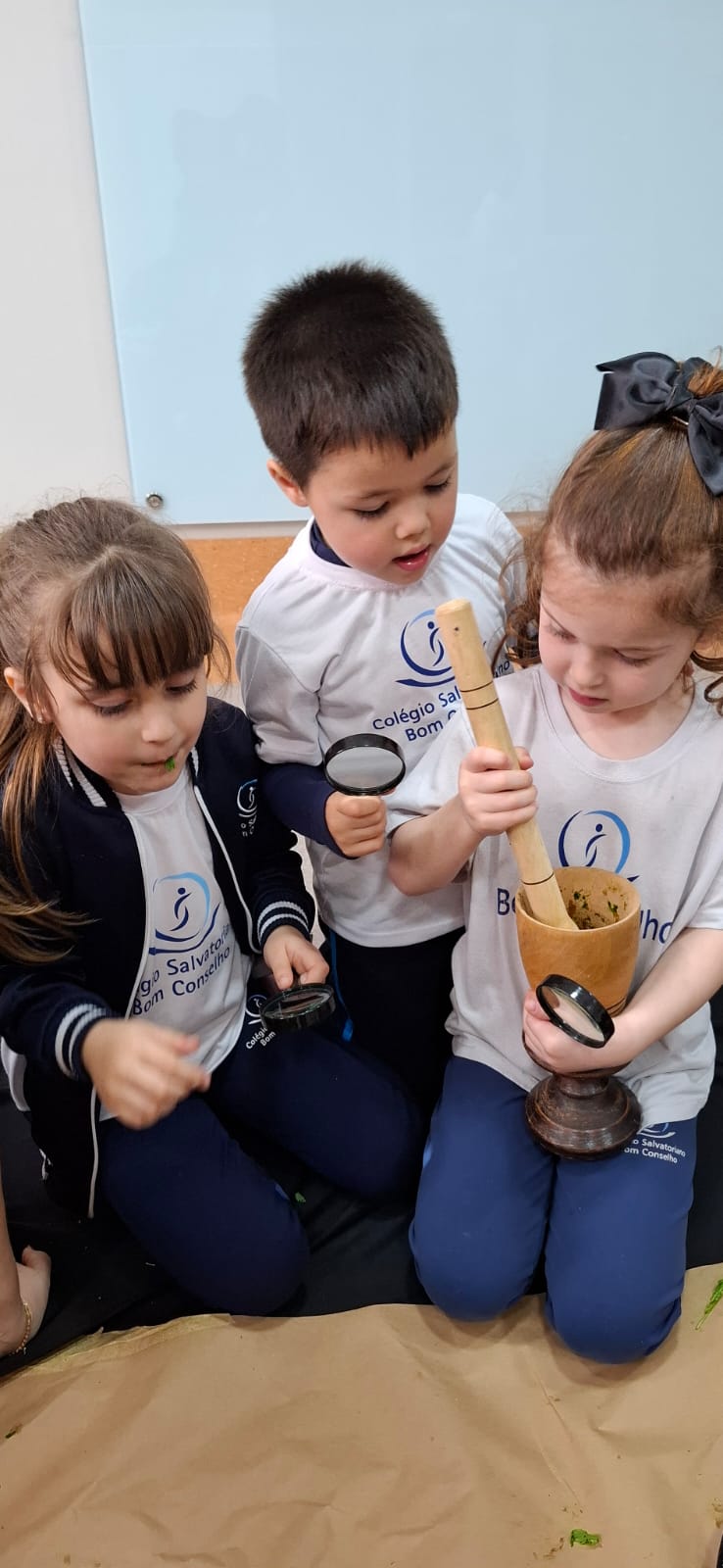 Em uma das primeiras vivências, os pequenos exploraram as diferentes cores da terra, utilizando-as para criar tintas naturais. Essa experiência despertou olhares atentos e abriu caminho para uma jornada de descobertas sobre a relação entre natureza, alimento e vida.