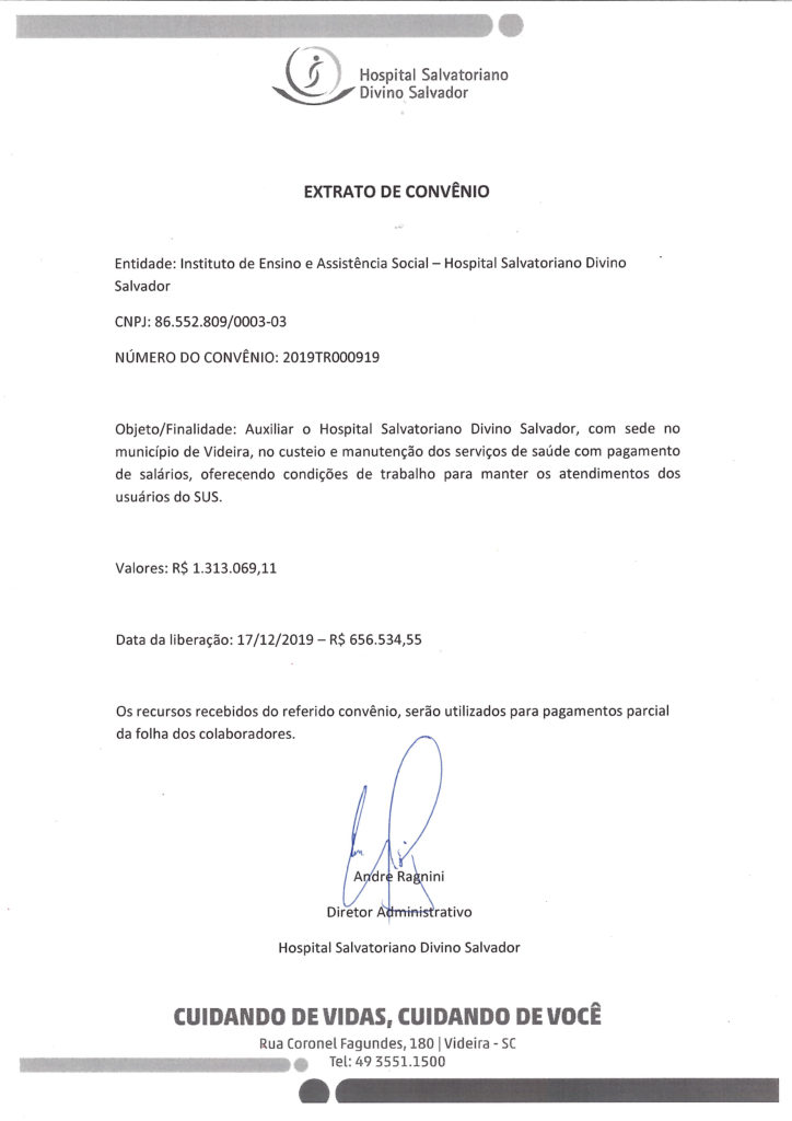 O convênio foi firmado com a Secretaria de Estado da Saúde com objetivo e finalidade de auxiliar o HSDS no custeio e manutenção dos serviços de saúde com pagamento de salários, oferecendo condições de trabalho para manter os atendimentos dos usuários do SUS.