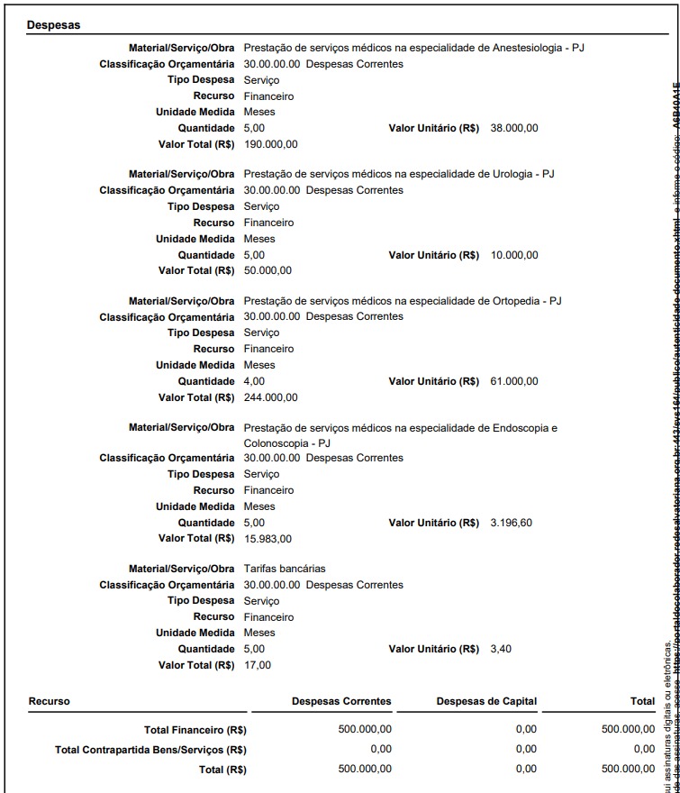 O recurso será aplicado no pagamento dos custos da operação hospitalar, conforme o plano de trabalho disponível na imagem anexada abaixo, contribuindo para a continuidade e a qualidade dos atendimentos prestados à comunidade.