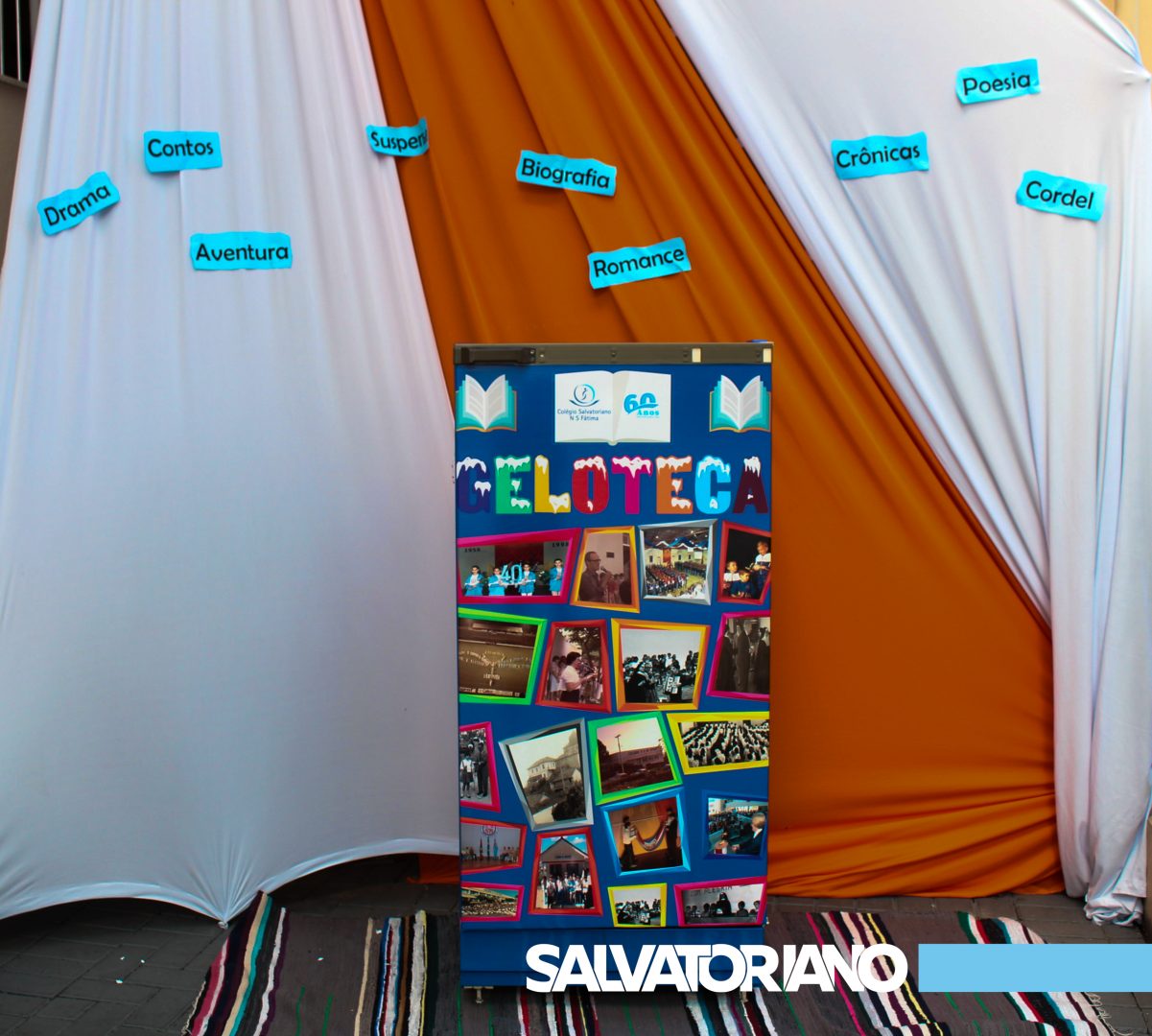 Uma geladeira inutilizada, foi transformada em uma pequena biblioteca, cheia de cores e saberes. A Geloteca foi ornamentada com fotos históricas dos 60 anos do nosso Colégio. Vamos juntos ler, aprender e ampliar nossos horizontes!