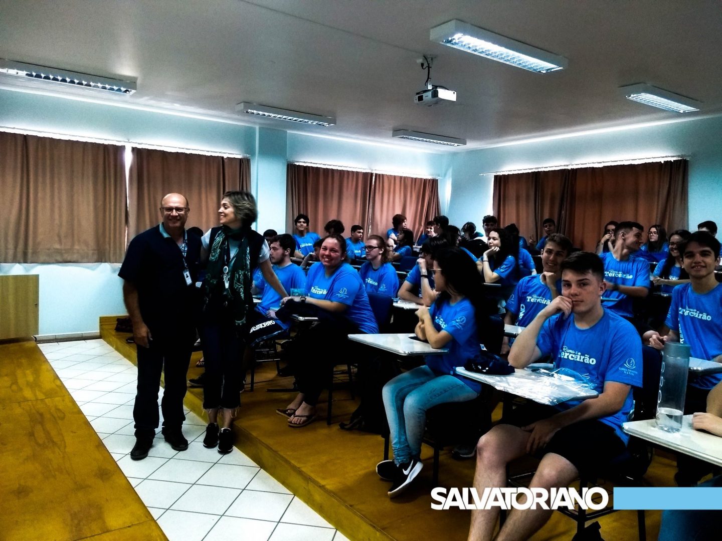 No dia 14 de novembro, vivenciamos um momento especial com as turmas 201 e 202. Nas duas últimas aulas, todos foram convidados a pegar seus materiais e irem até a sala do Terceirão. Lá, eles foram calorosamente recepcionados pela equipe do Ensino Médio. Na sala, eles encontraram uma camiseta com o dizer “Rumo ao Terceirão”. Ao som de muita música, cada estudante procurou a sua camiseta e imediatamente todos começaram a colocar a nova camiseta. O sorriso, a alegria e os fortes abraços foram inevitáveis. Após, as coordenações e os professores que ali estavam fizeram uma contextualização do momento que eles estão vivenciando e da importância desta caminhada “Rumo ao Terceirão”.