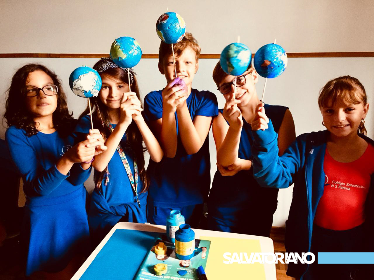 Durante a aula sobre “Movimentos da Terra”, os estudantes do quinto ano puderam realizar uma atividade em grupo que consistia na representação do planeta e dos sistemas de rotação e translação.