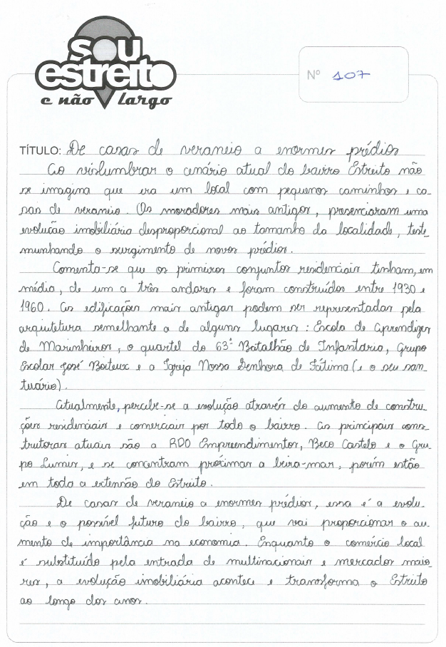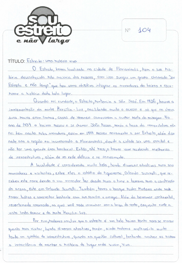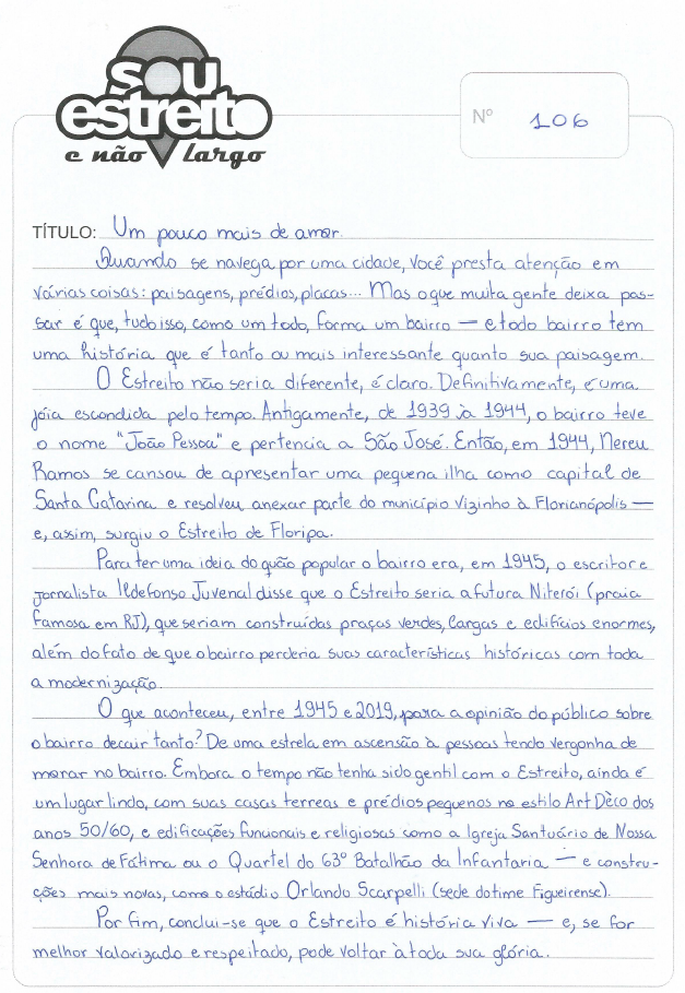 Os estudantes do 9º ano participaram do projeto de valorização da região e resgate do sentimento de pertencimento do Bairro Estreito, especificamente no concurso de redação “SOU ESTREITO E CONTO A MINHA HISTÓRIA”. E para nossa alegria, na classificação geral, nossos estudantes foram os vencedores: