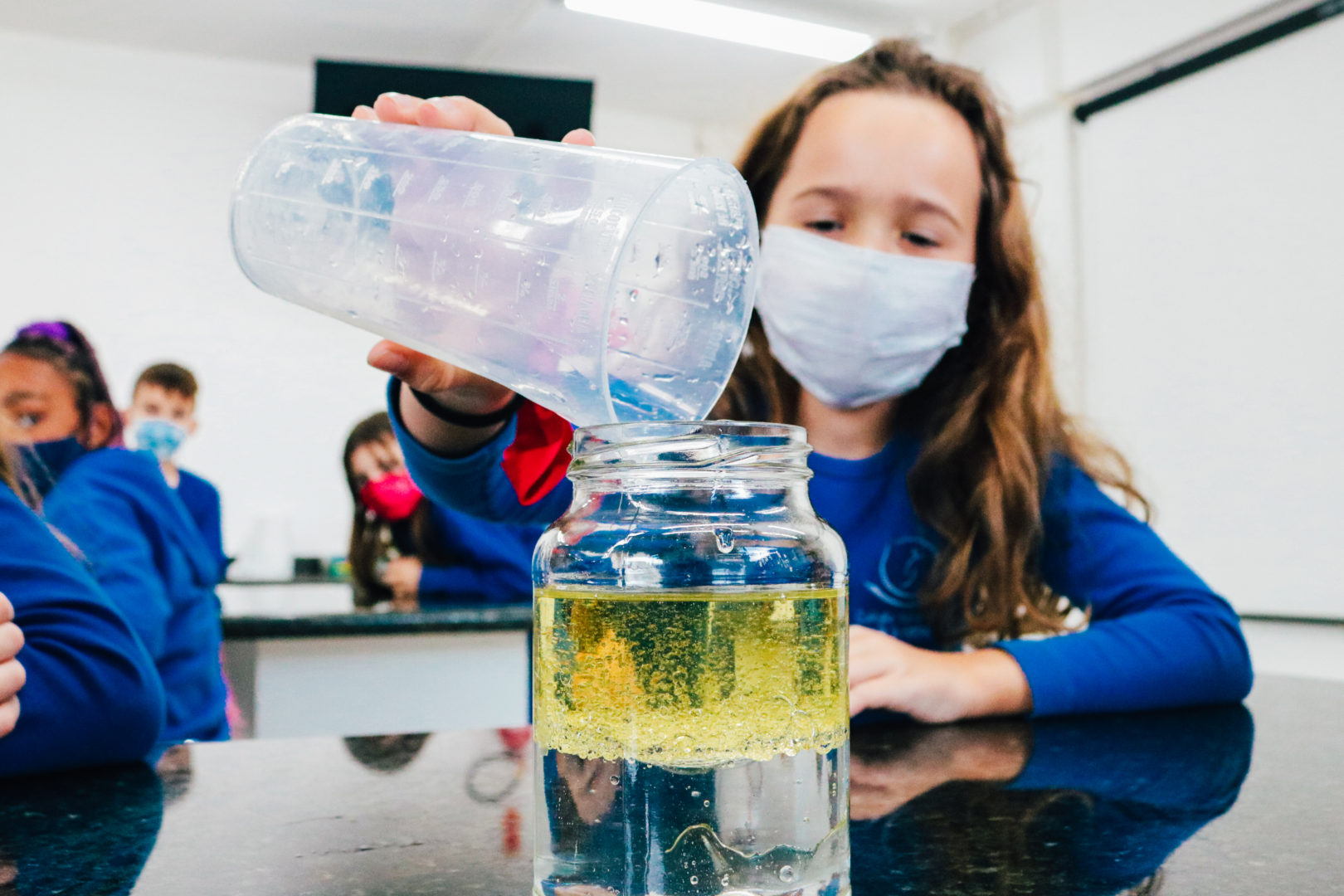 As turmas do terceiro ano, do Ensino Fundamental I, realizaram experimentos bem inusitados em nosso laboratório de ciências. As experiências foram feitas com materiais que se encontram facilmente em casa como: leite, azeite, água, fermento e pastilha efervescente.