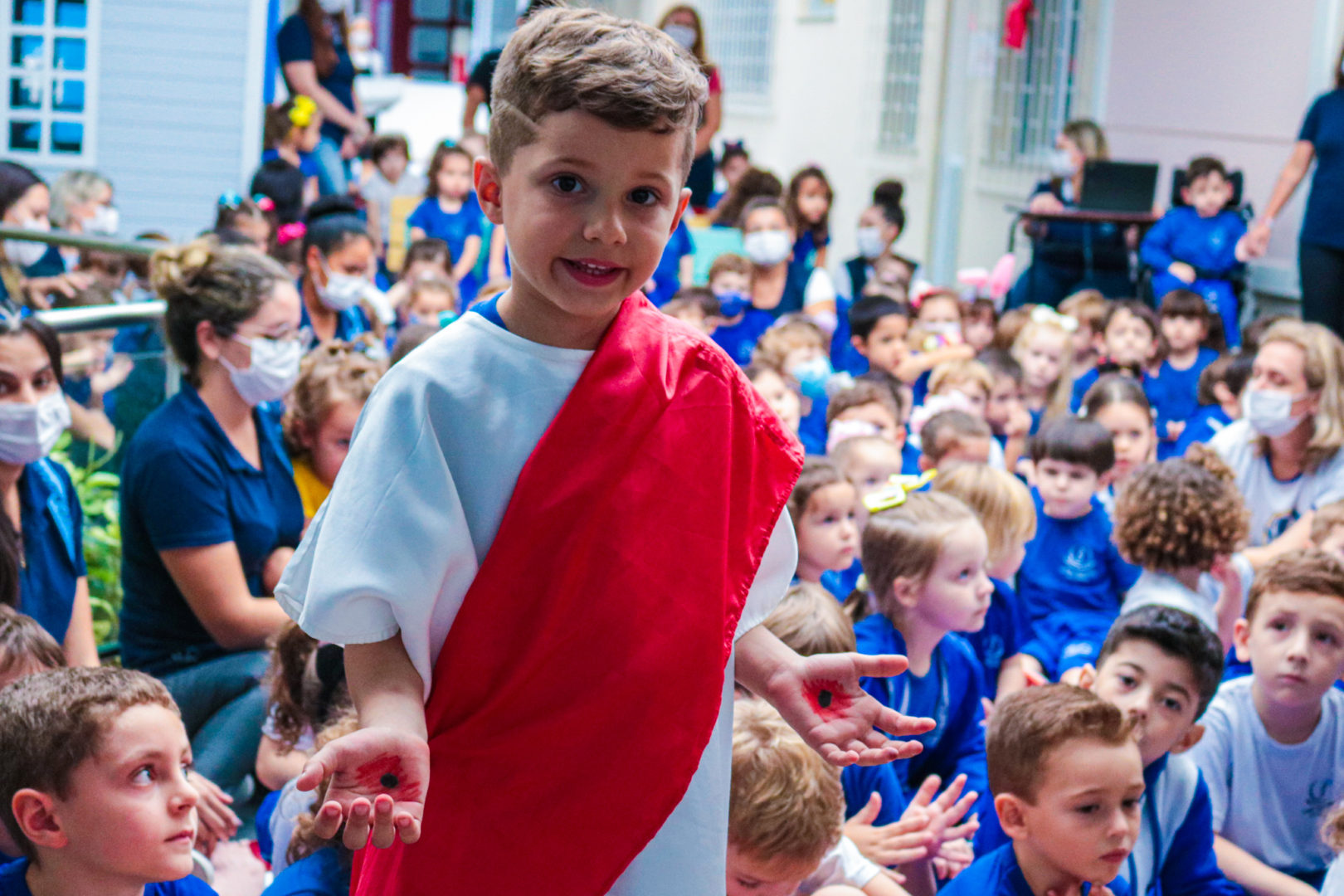 Ao longo desta Semana Santa, todas as turmas de nosso Colégio renderam a graça de poder participar de um momento de Oração no Pátio, onde celebramos, como comunidade educativa, a Entrada triunfal de Jesus em Jerusalém, a Última Ceia que Jesus realizou com seus Apóstolos, com o gesto do Lava-Pés, a instituição da Eucaristia e do mandamento do amor, bem como a Paixão, Morte e Ressurreição do Senhor.