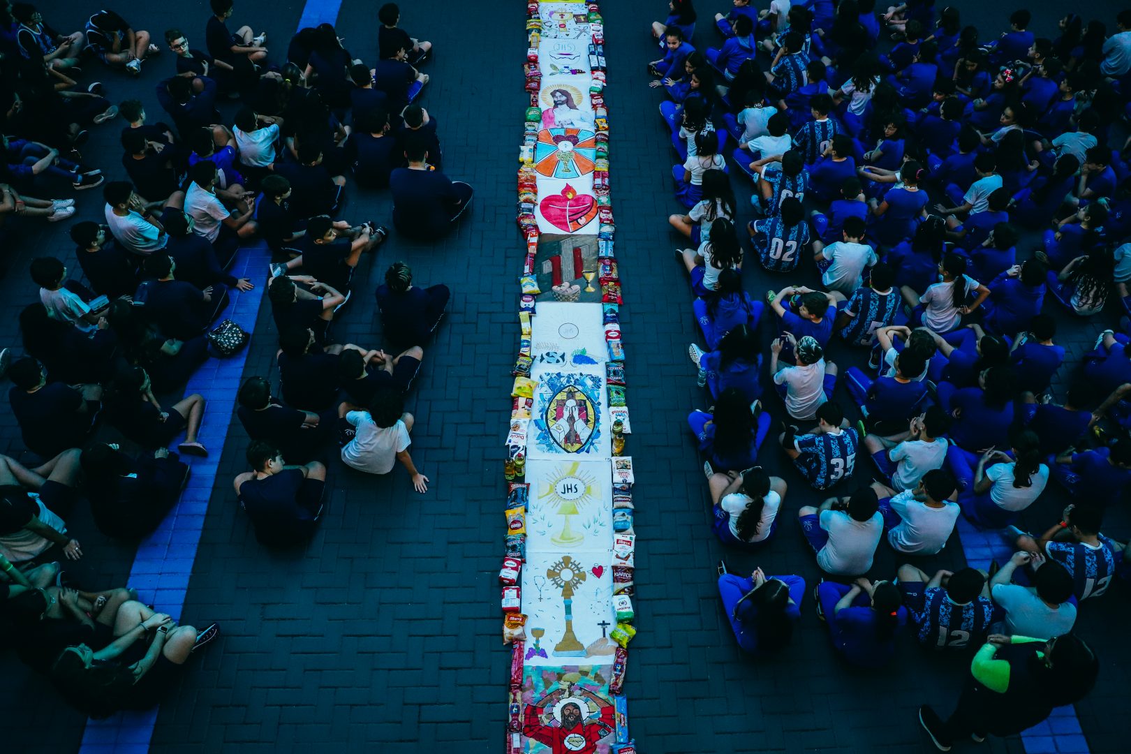Os tradicionais tapetes foram confeccionados com uma arte especial que cada turma preparou e também com as doações dos alimentos que estudantes e educadores fizeram nos últimos dias.