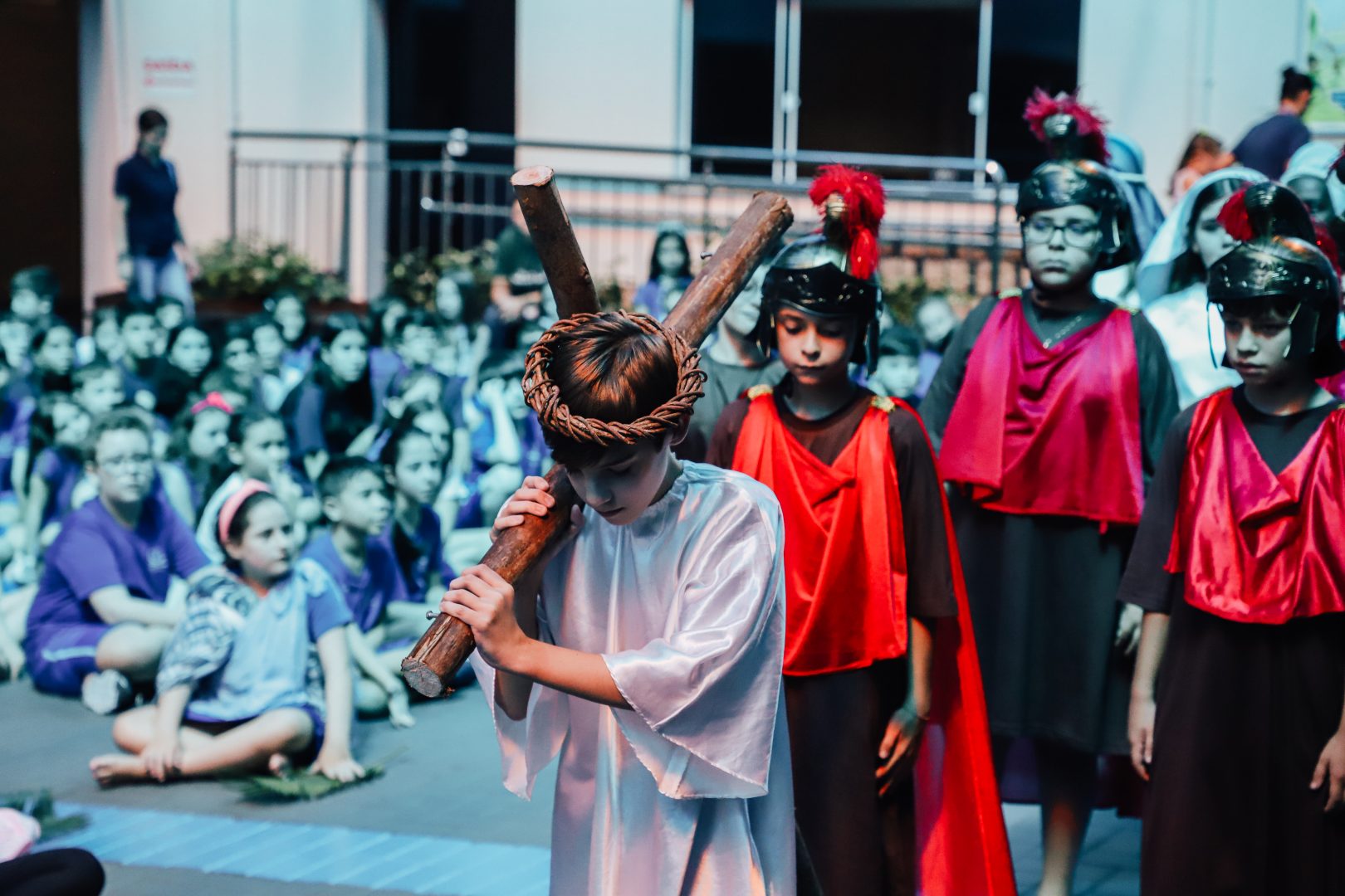 No primeiro momento da manhã, os estudantes do Sexto Ano ao Terceirão participaram da Via-Sacra, contemplando a dolorosa paixão do Senhor. Ele que nos diz: “Caio contigo para te levantar comigo”.