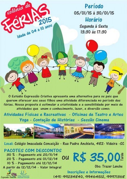 Desde o dia 05 de janeiro o Colégio Salvatoriano Imaculada Conceição promove uma colônia de férias em suas dependências, em parceria com o Estúdio Expressão Criativa. O programa está na sua 4ª edição e tem por objetivo estimular a criatividade dos alunos de quatro a 10 anos durante o tempo em que eles passam fora das salas de aula.
