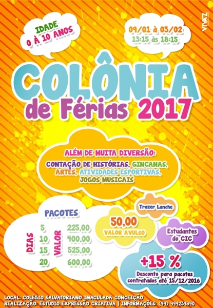Acontece, de 09 de janeiro a 03 de fevereiro, das 13h15 às 18h15, para crianças de 0 a 10 anos, a COLÔNIA DE FÉRIAS 2017 realizada pelo Estúdio Expressão Criativa no Colégio Salvatoriano Imaculada Conceição.