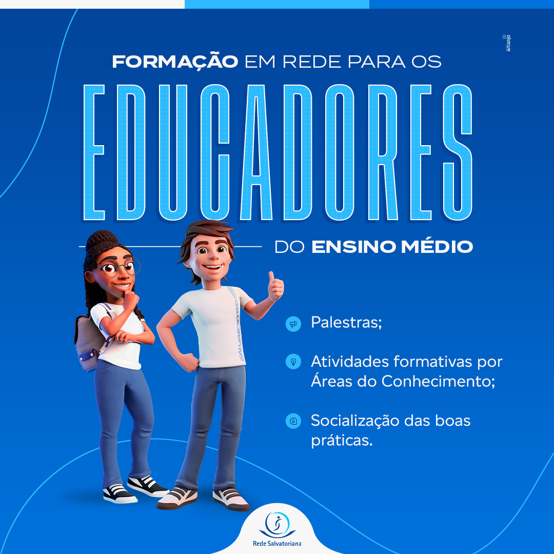 Nos dias 18 de outubro, 3 de novembro e 1º de dezembro, todos os educadores do Ensino Médio da Rede Salvatoriana estarão reunidos para uma importante atualização de seus conhecimentos, orientação metodológica do material didático e socialização das boas práticas dos Itinerários Formativos de Aprofundamento.